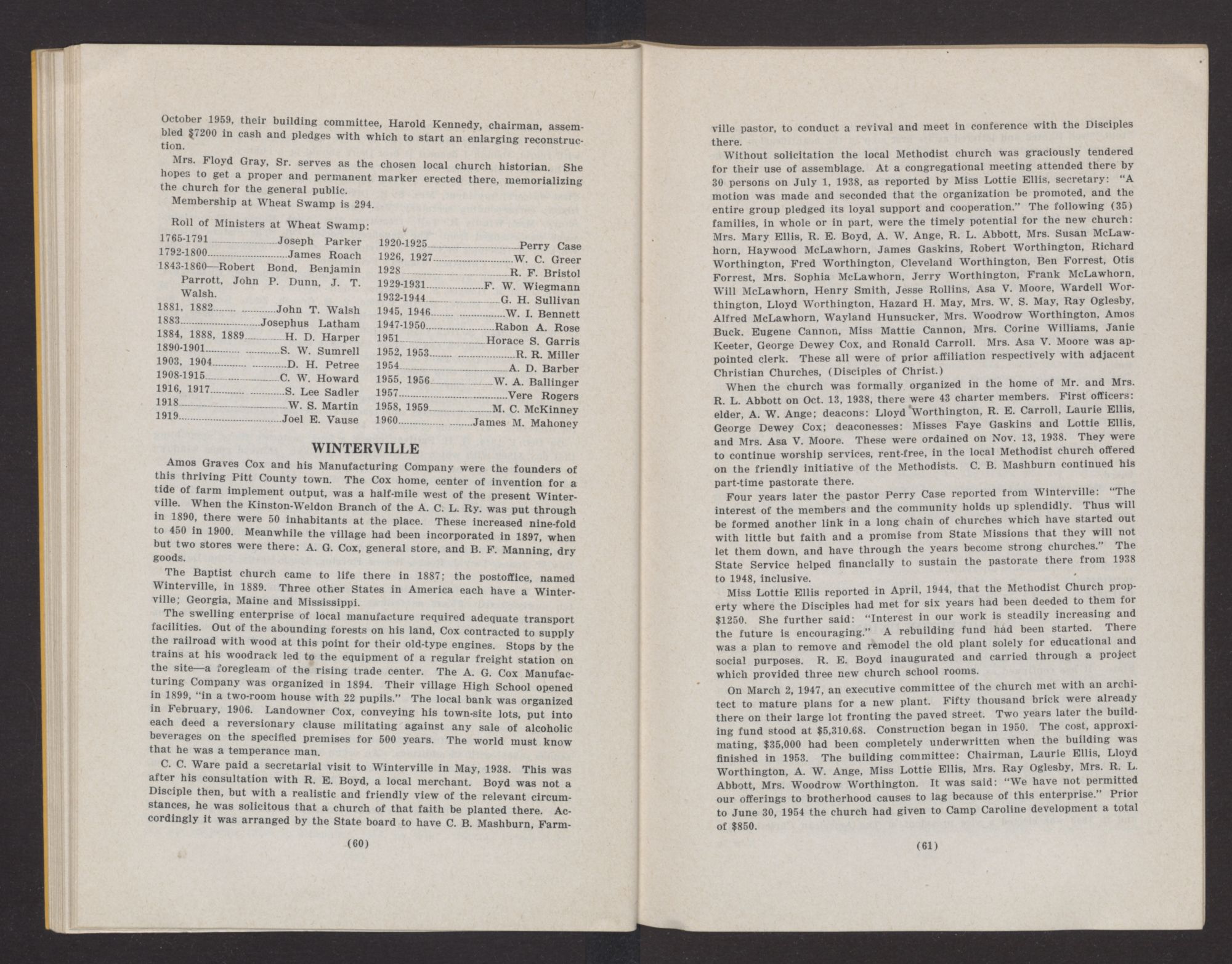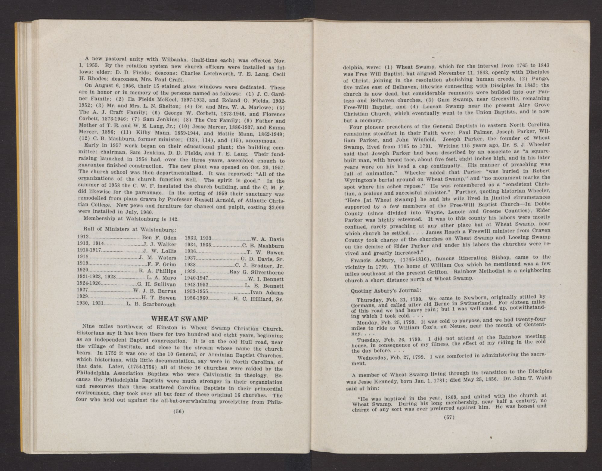 The church has consistently favored the pastoral unity plan and for long seasons has had the service of a resident minister at the near-by Hookerton parsonage. Cooperating with the group, in the spring of 1938, the church gave $190 toward procuring a new automobile for R. Paul Parker, their pastor.