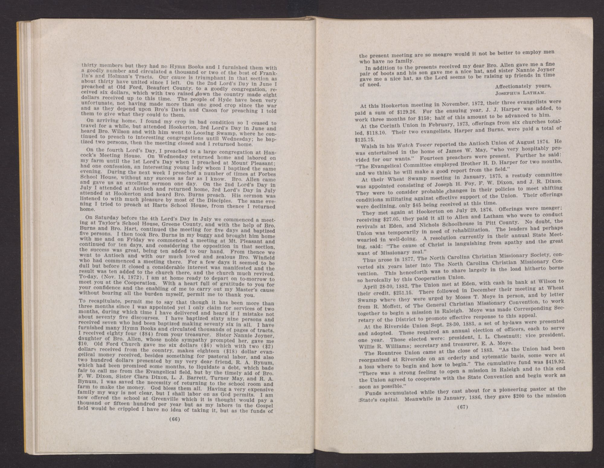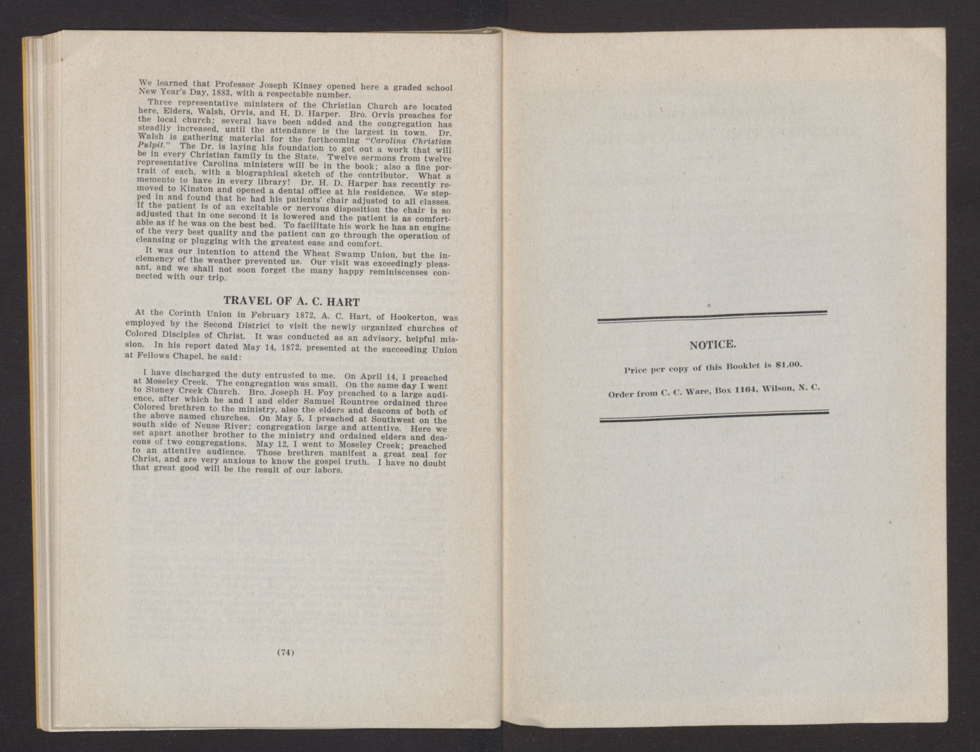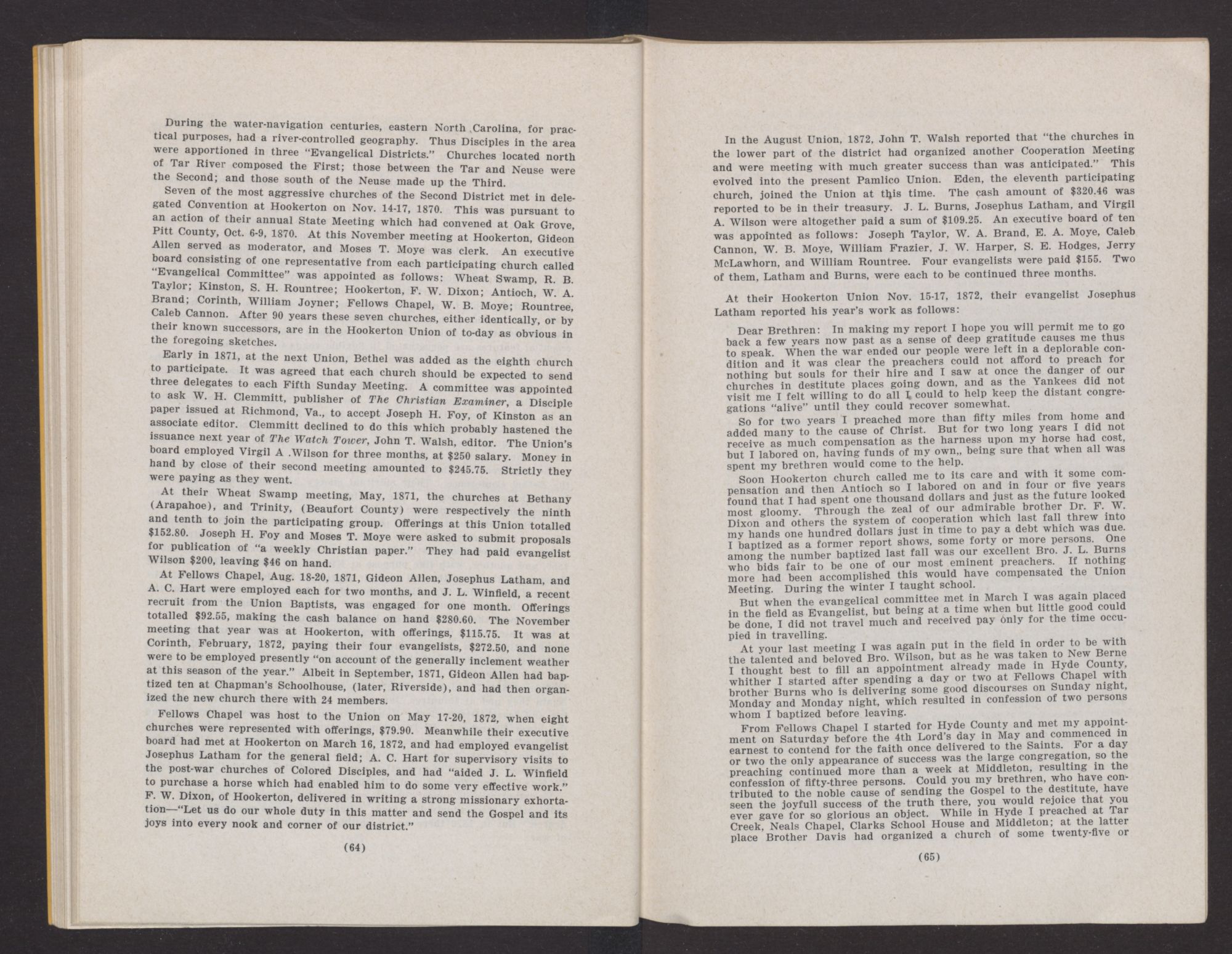 TRAVEL OF A. C. HARTAt the Corinth Union in February 1872, A. C. Hart, of Hookerton, was employed by the Second District to visit the newly organized churches of Colored Disciples of Christ. It was conducted as an advisory, helpful mission. In his report dated May 14, 1872, presented at the succeeding Union at Fellows Chapel, he said: