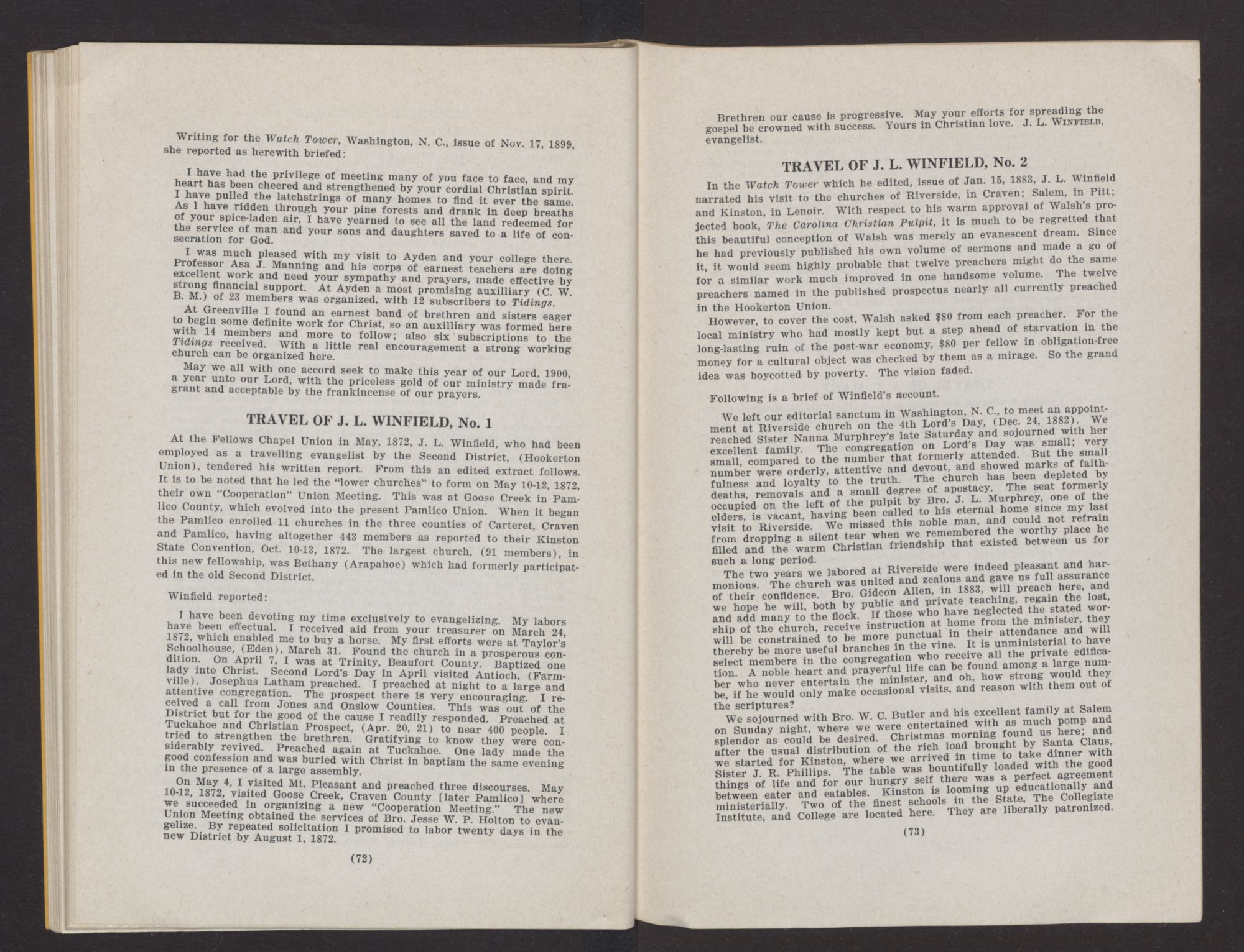 TRAVEL OF J. L. WINFIELD, No. 2In the Watch Tower which he edited, issue of Jan. 15, 1883, J. L. Winfield narrated his visit to the churches of Riverside, in Craven; Salem, in Pitt; and Kinston, in Lenoir. With respect to his warm approval of Walsh's projected book, The Carolina Christian Pulpit, it is much to be regretted that this beautiful conception of Walsh was merely an evanescent dream. Since he had previously published his own volume of sermons and made a go of it, it would seem highly probable that twelve preachers might do the same for a similar work much improved in one handsome volume. The twelve preachers named in the published prospectus nearly all currently preached in the Hookerton Union.