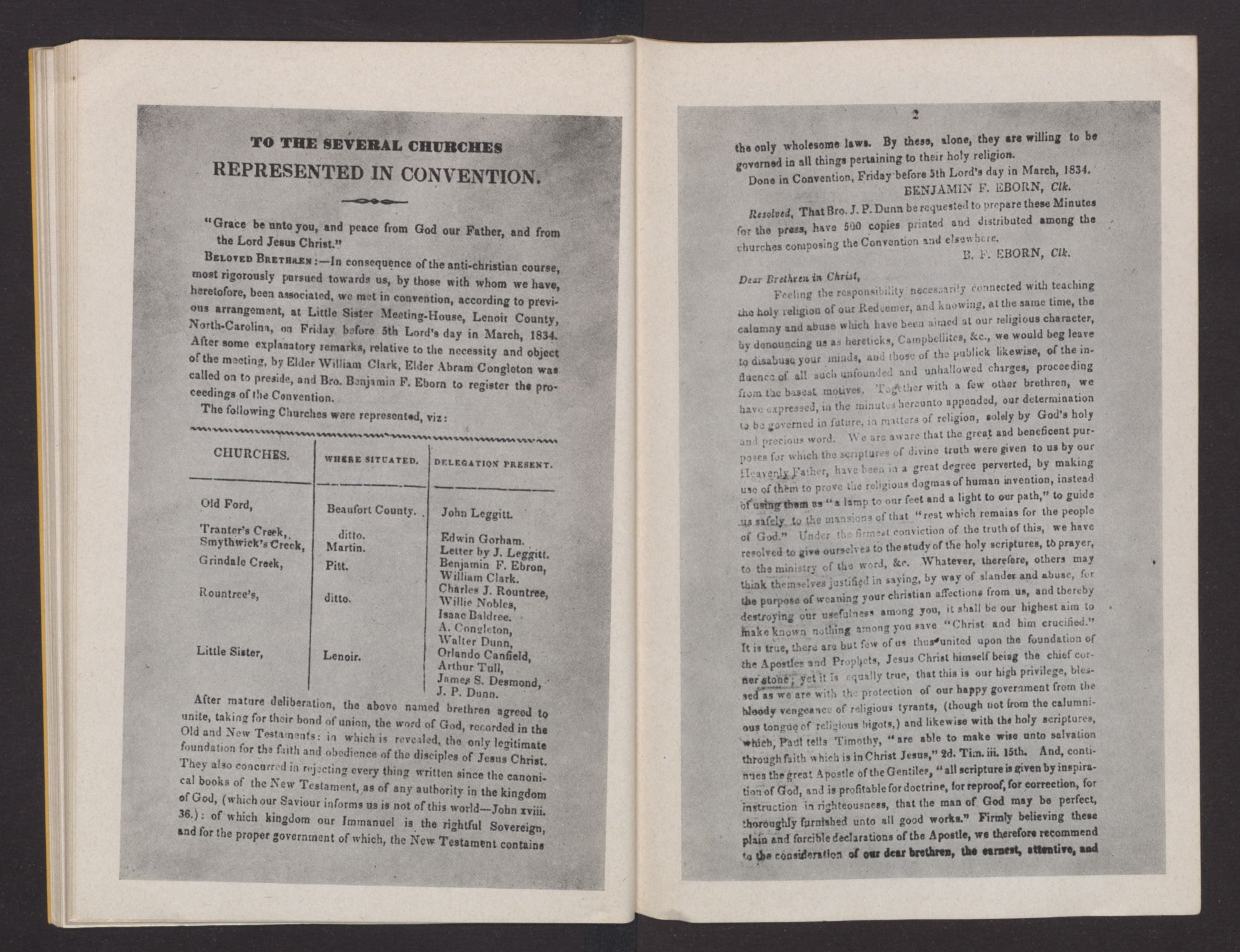 Beloved Brethren:--In consequence of the anti-christian course, most rigorously pursued towards us, by those with whom we have, heretofore, been associated, we met in convention, according to previous arrangement, at Little Sister Meeting-House, Lenoir County, North-Carolina, on Friday before 5th Lord’s day in March, 1834. After some explanatory remarks, relative to the necessity and object of the meeting, by Elder William Clark, Elder Abram Congleton was called on to preside, and Bro. Benjamin F. Eborn to register the proceedings of the Convention.