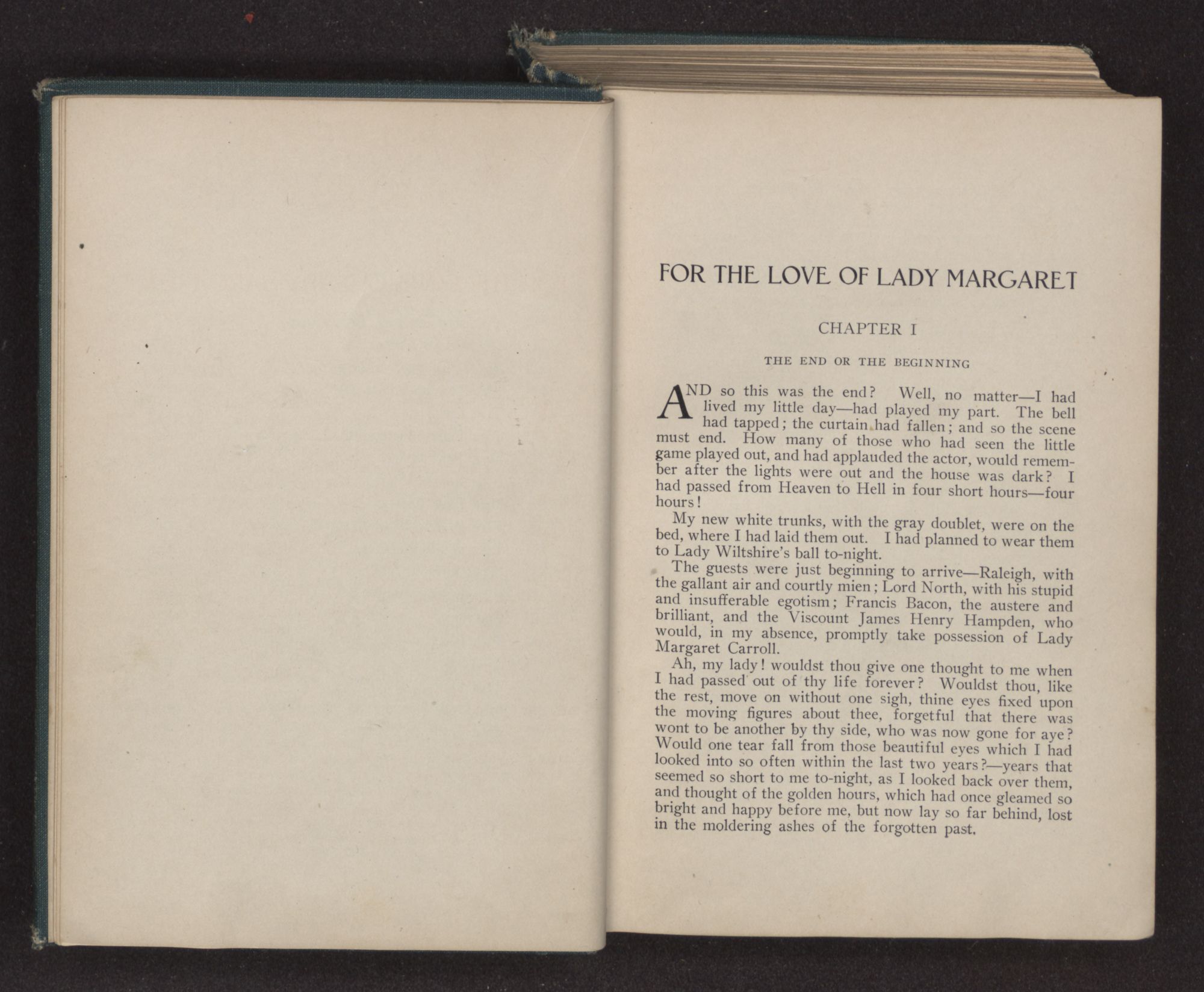 The guests were just beginning to arrive—Raleigh, with the gallant air and courtly mien; Lord North, with his stupid and insufferable egotism; Francis Bacon, the austere and brilliant, and the Viscount James Henry Hampden, who would, in my absence, promptly take possession of Lady Margaret Carroll.