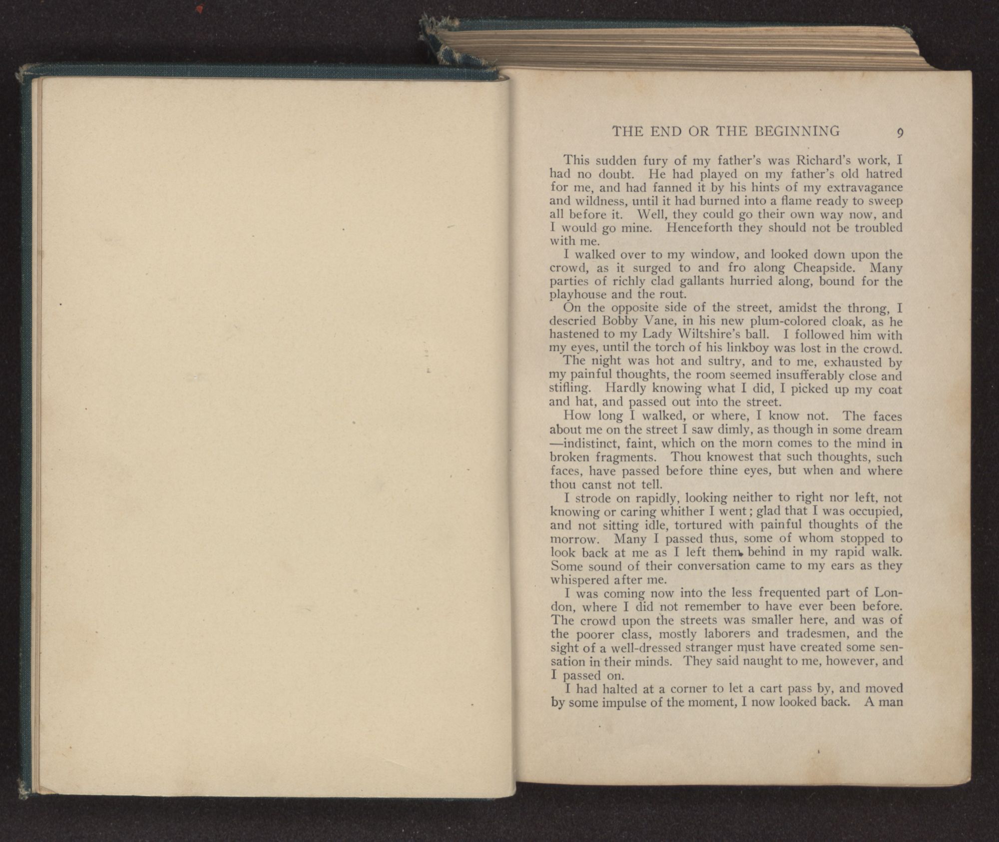 I was coming now into the less frequented part of London, where I did not remember to have ever been before. The crowd upon the streets was smaller here, and was of the poorer class, mostly laborers and tradesmen, and the sight of a well-dressed stranger must have created some sensation in their minds. They said naught to me, however, and I passed on.