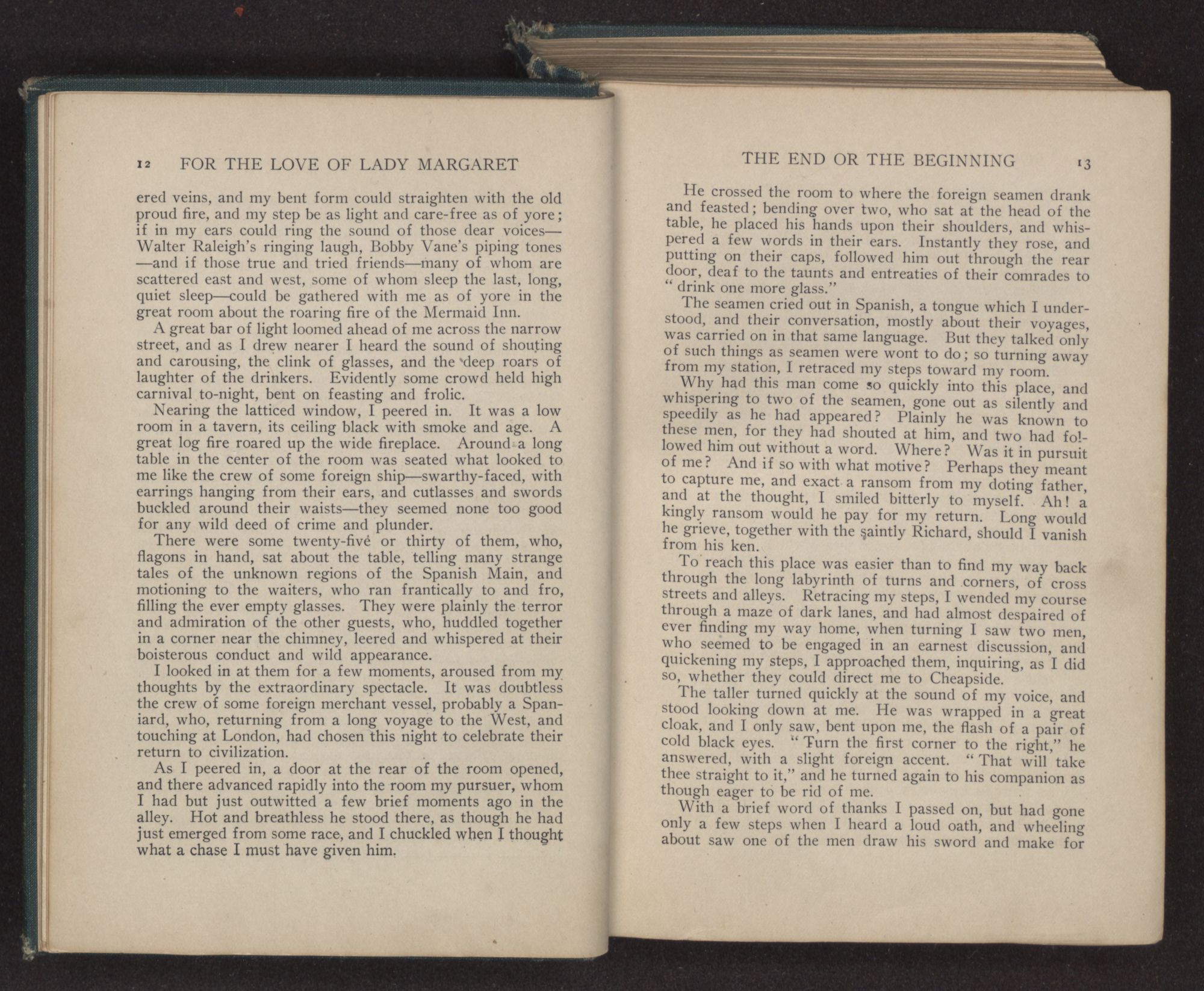 A great bar of light loomed ahead of me across the narrow street, and as I drew nearer I heard the sound of shouting and carousing, the clink of glasses, and the deep roars of laughter of the drinkers. Evidently some crowd held high carnival to-night, bent on feasting and frolic.