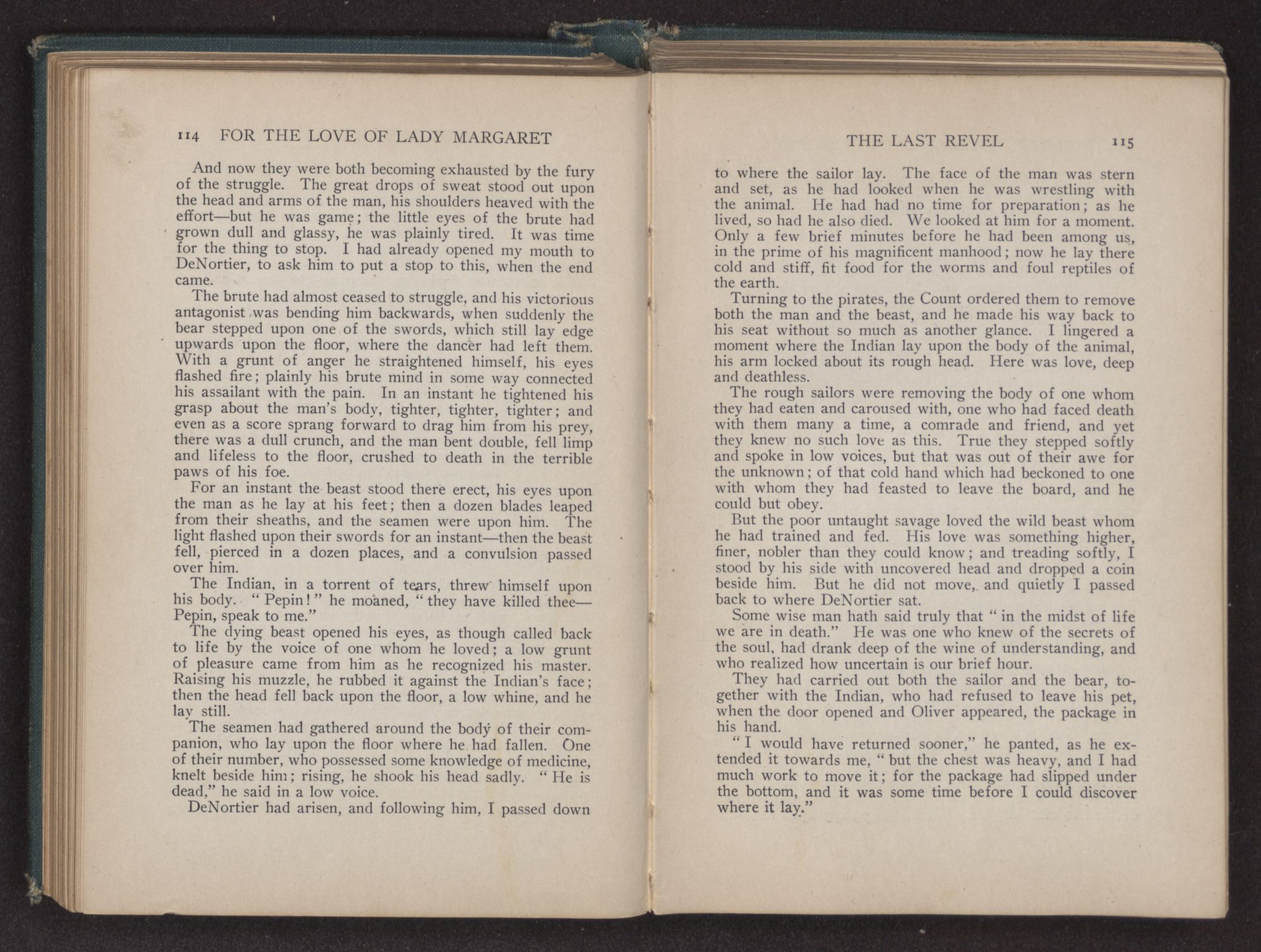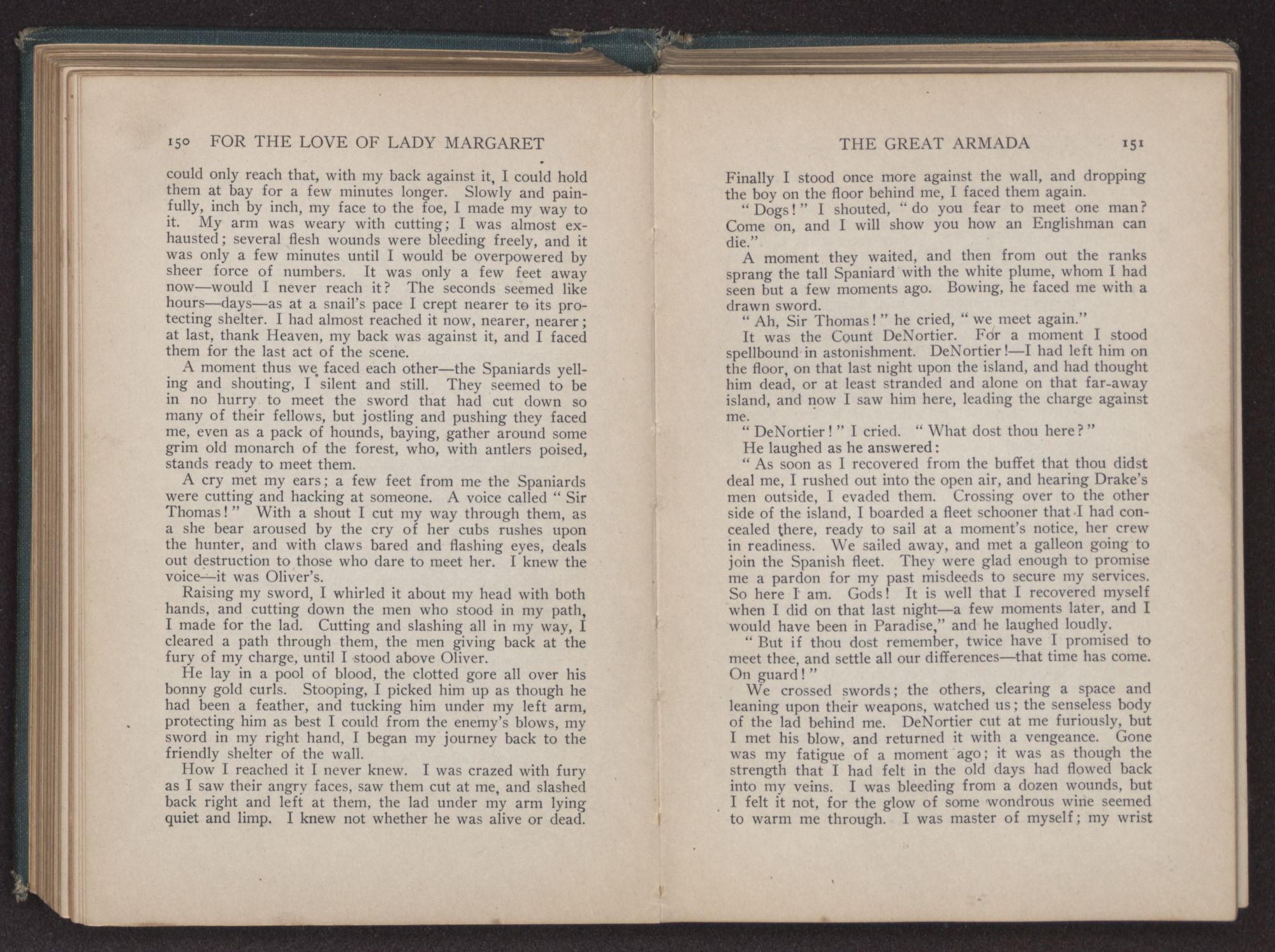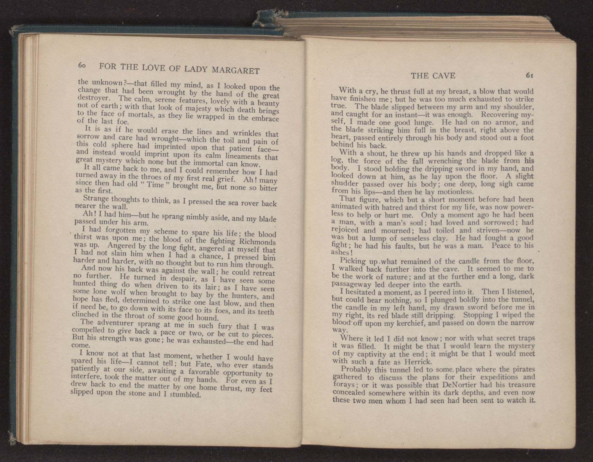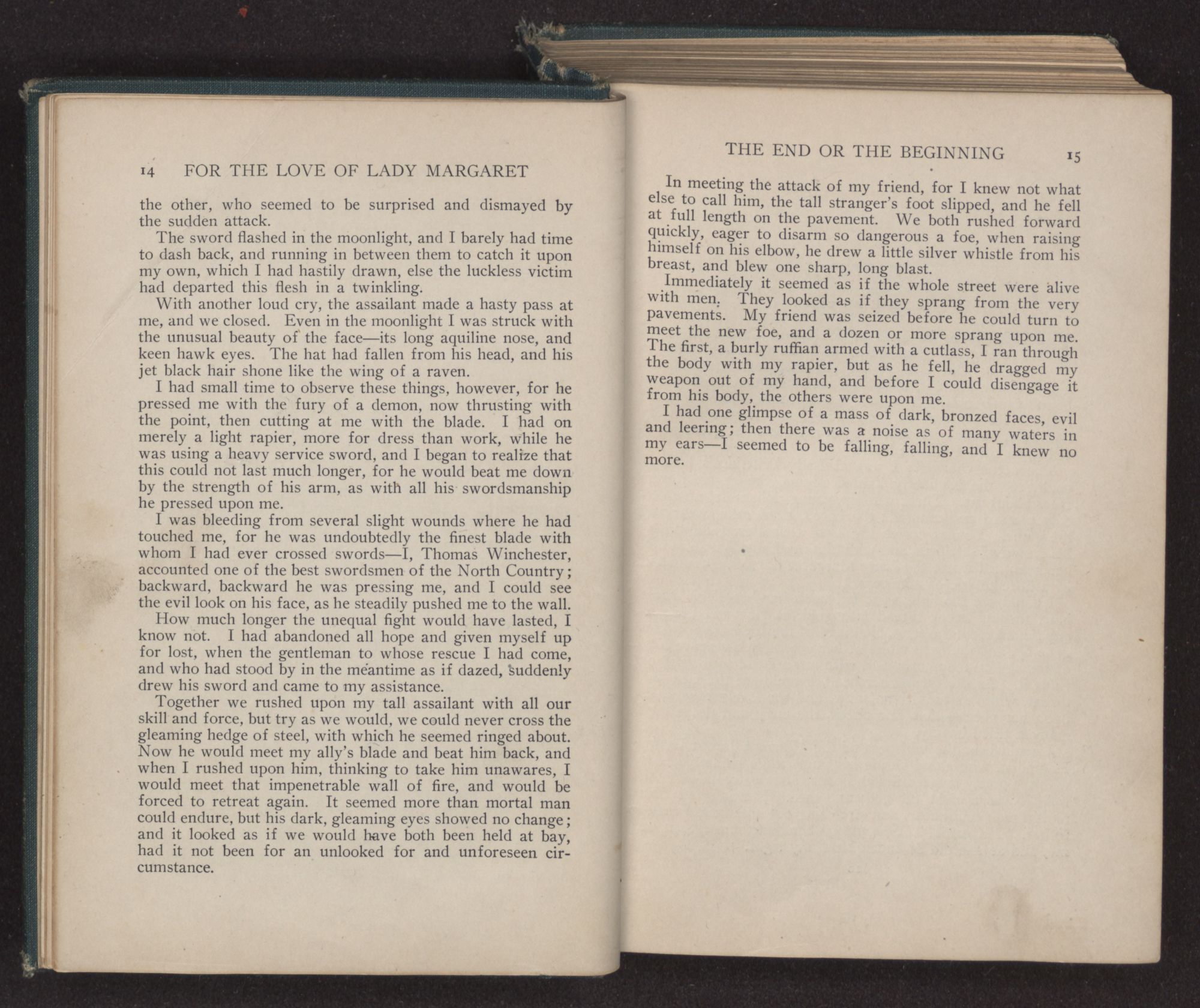 How much longer the unequal fight would have lasted, I know not. I had abandoned all hope and given myself up for lost, when the gentleman to whose rescue I had come, and who had stood by in the meantime as if dazed, suddenly drew his sword and came to my assistance.