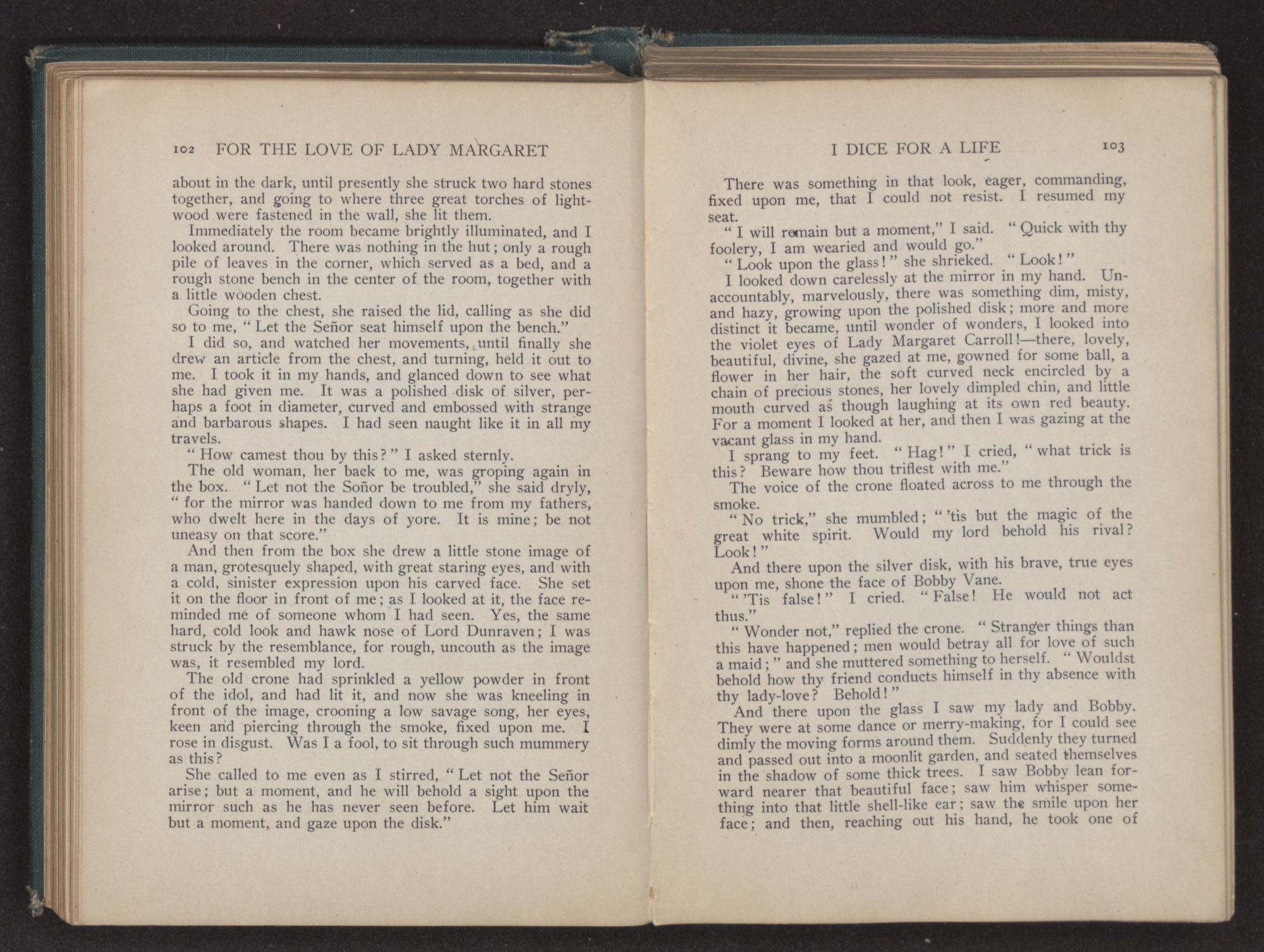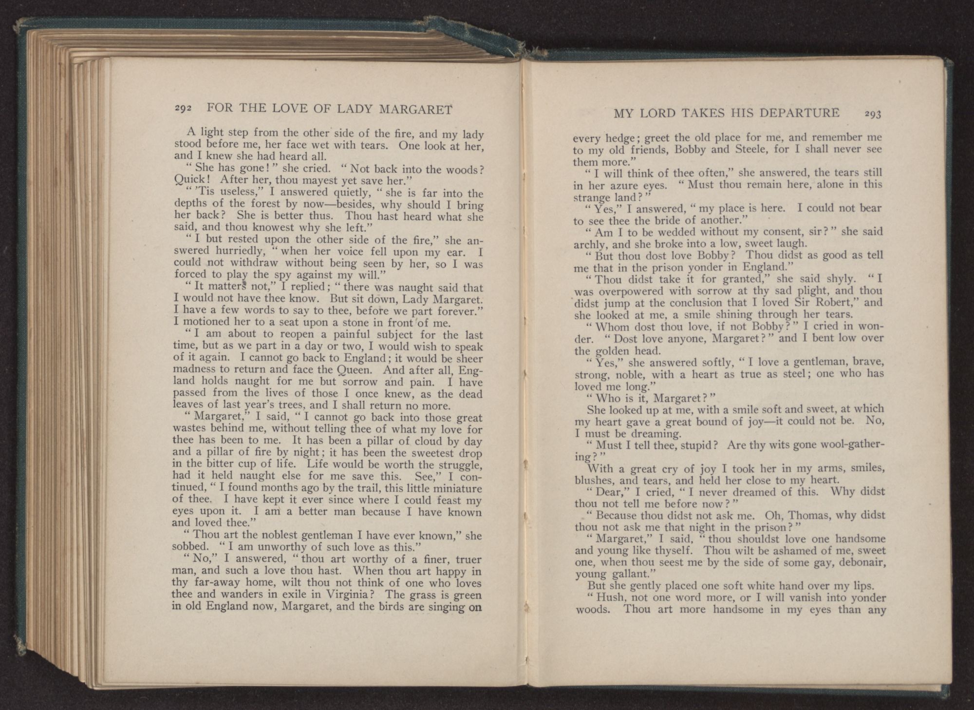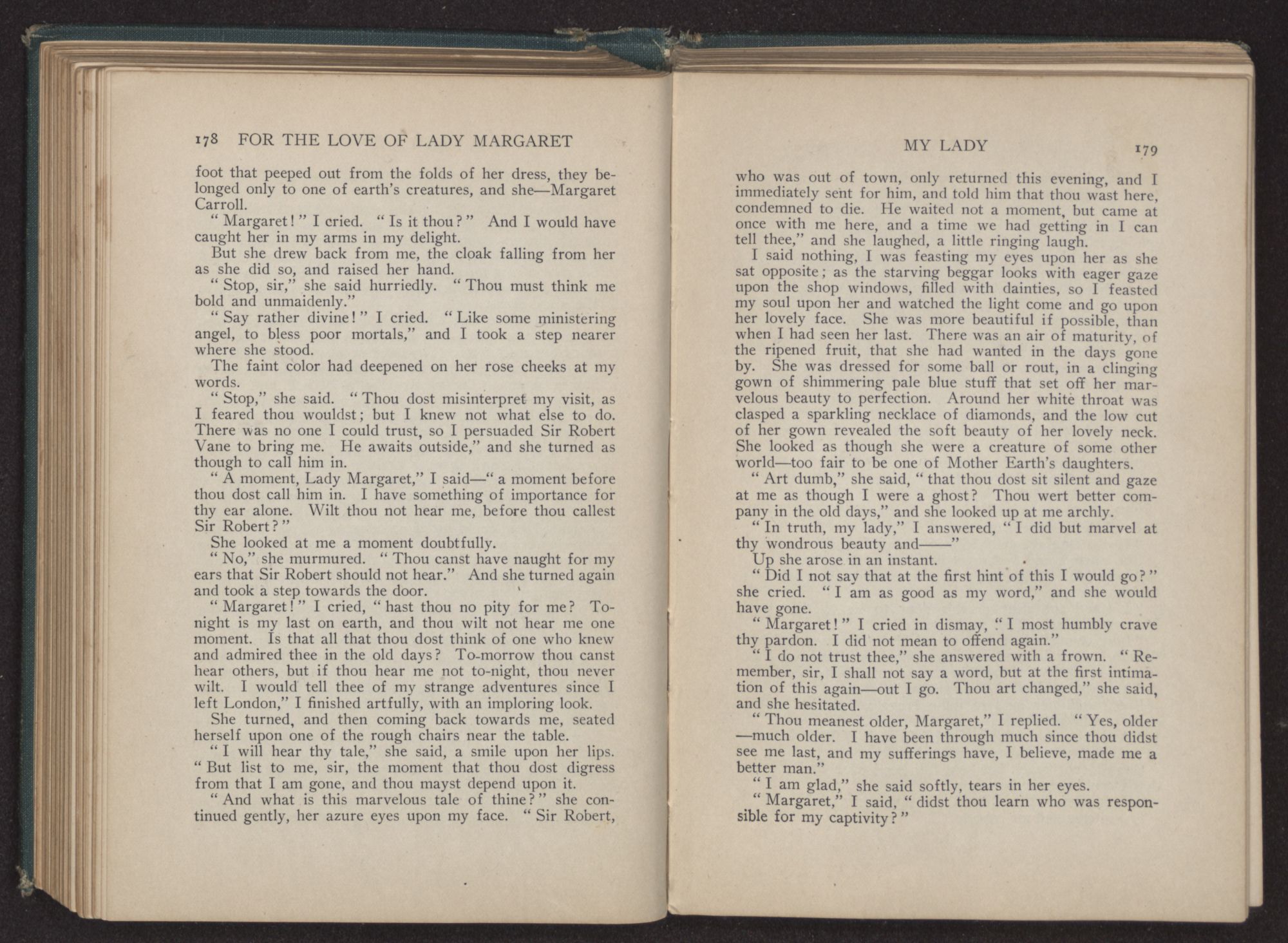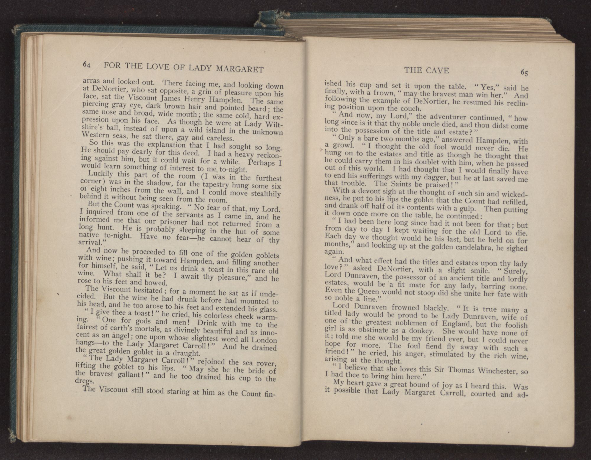 I could hear the whispers of the Viscount James Henry Hampden, who stood beside her; and while he fanned her with the pretty jeweled fan and poured out a stream of small talk, it was a sight for gods and men. It was more than mortal man could bear, and stretching out my arms, I called to her, “Margaret!” She turned her dark blue eyes upon me, and as she did so faded from my sight.