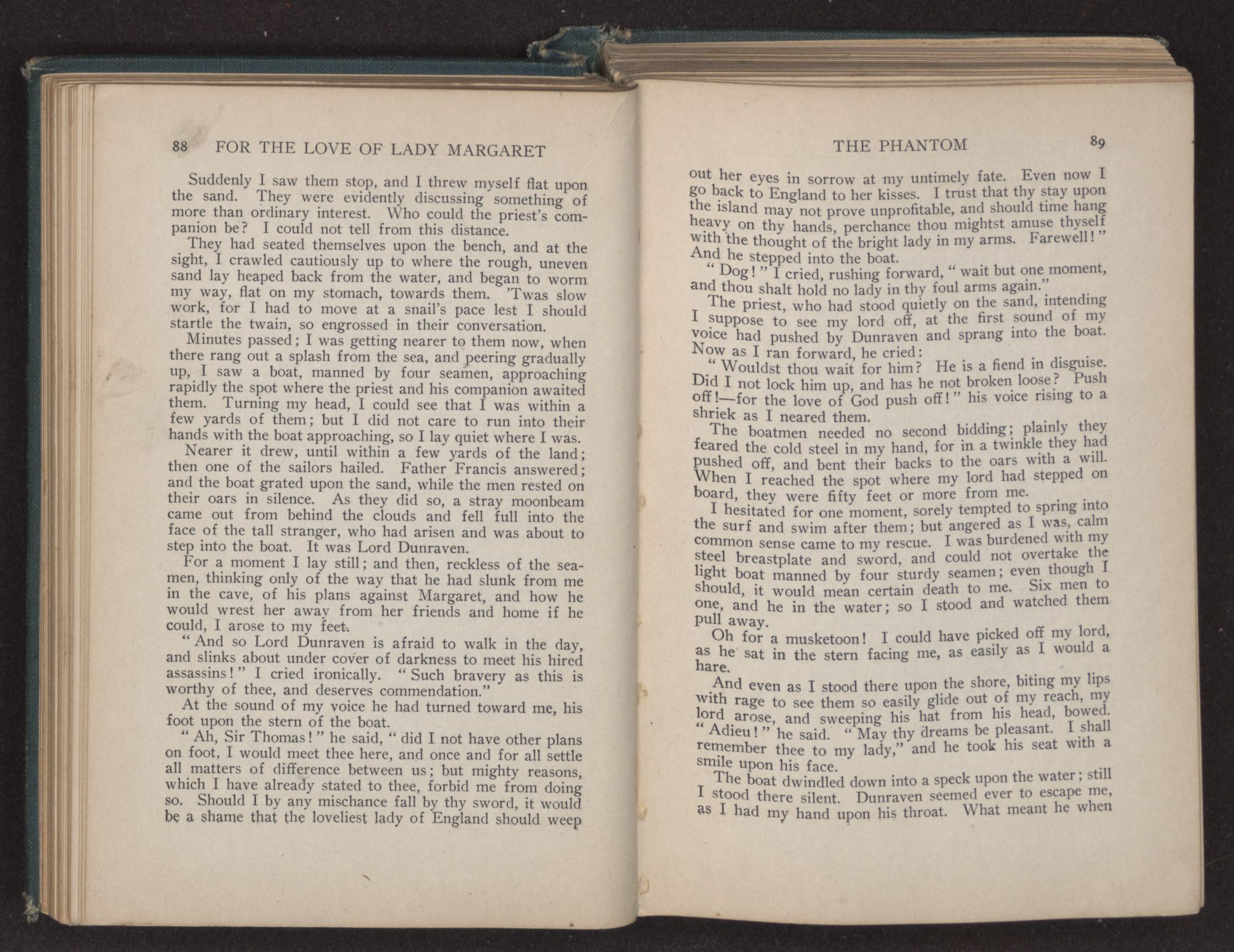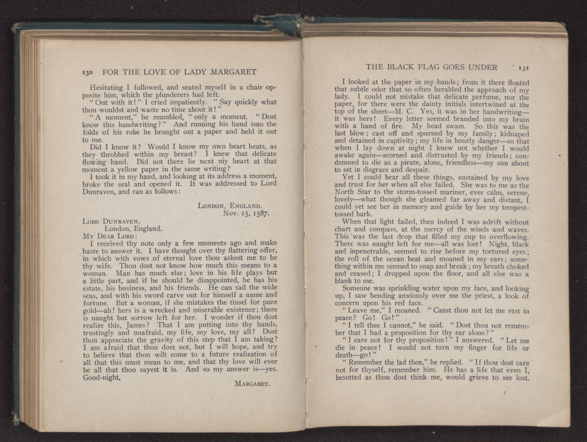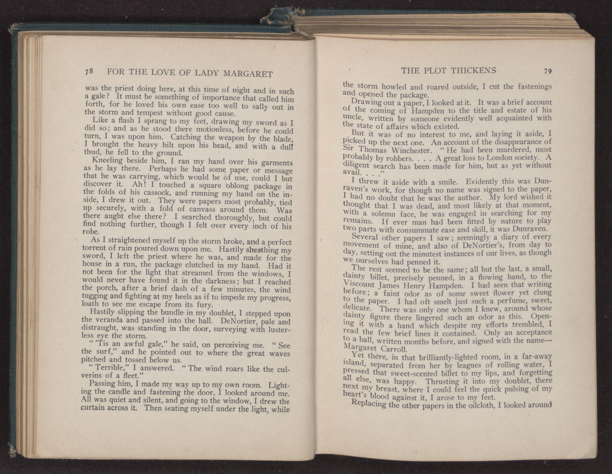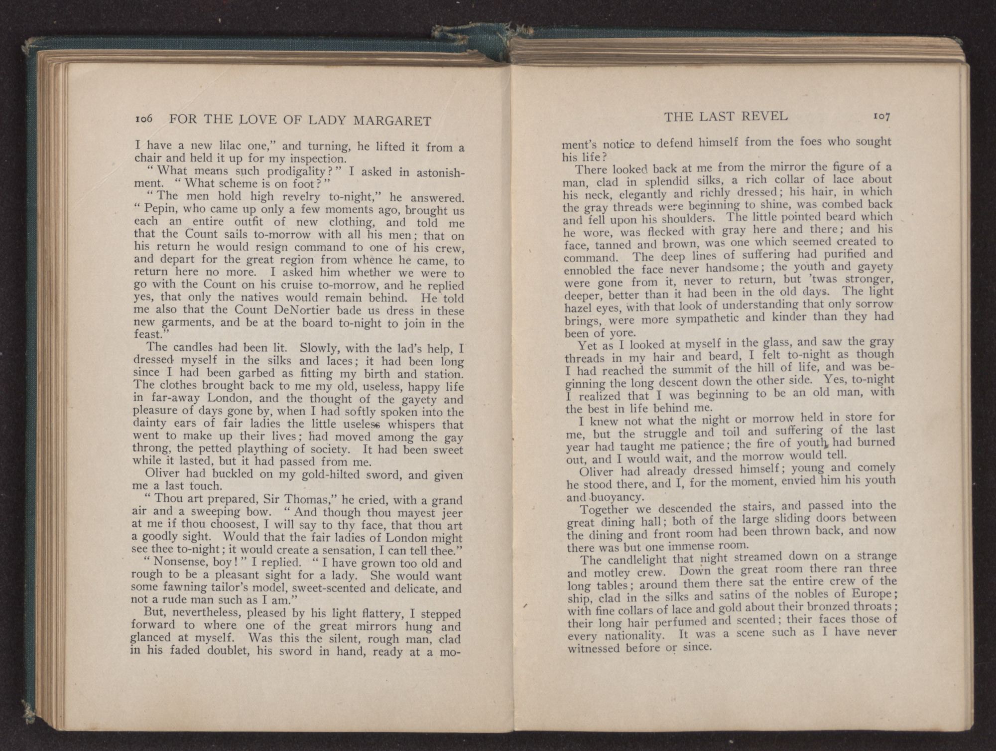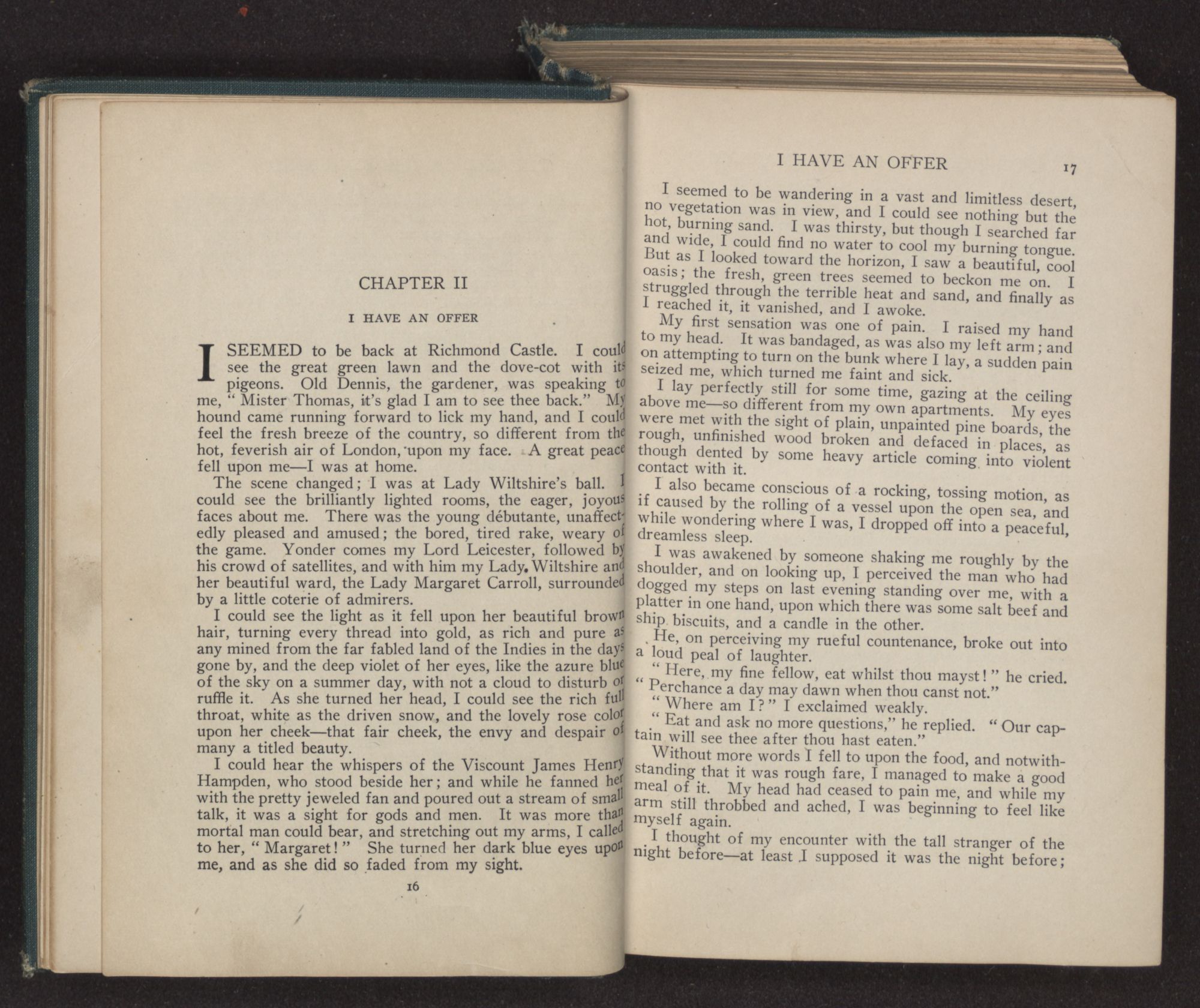 I could hear the whispers of the Viscount James Henry Hampden, who stood beside her; and while he fanned her with the pretty jeweled fan and poured out a stream of small talk, it was a sight for gods and men. It was more than mortal man could bear, and stretching out my arms, I called to her, “Margaret!” She turned her dark blue eyes upon me, and as she did so faded from my sight.