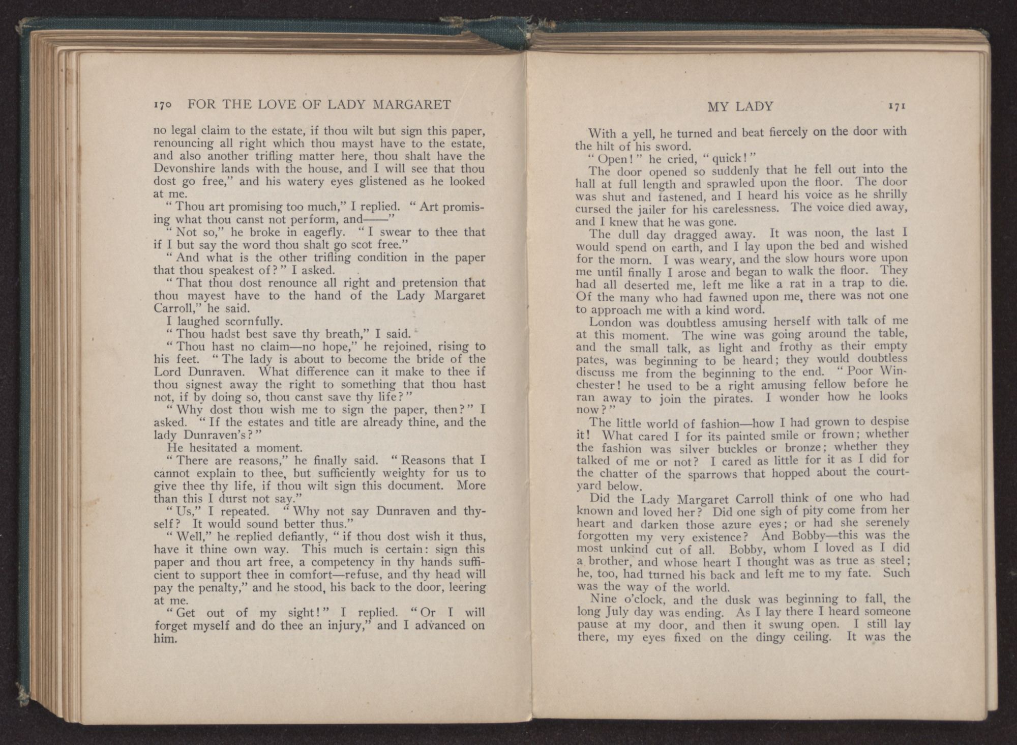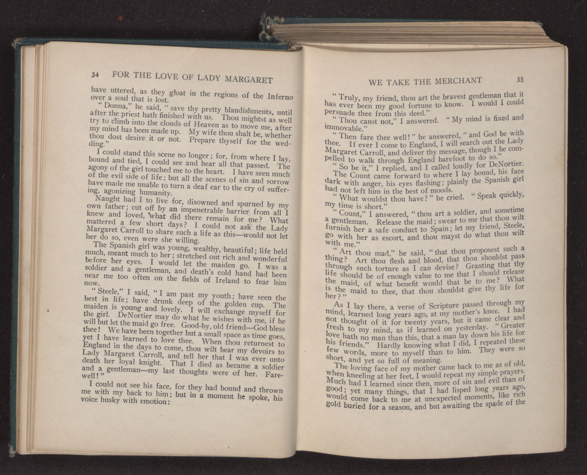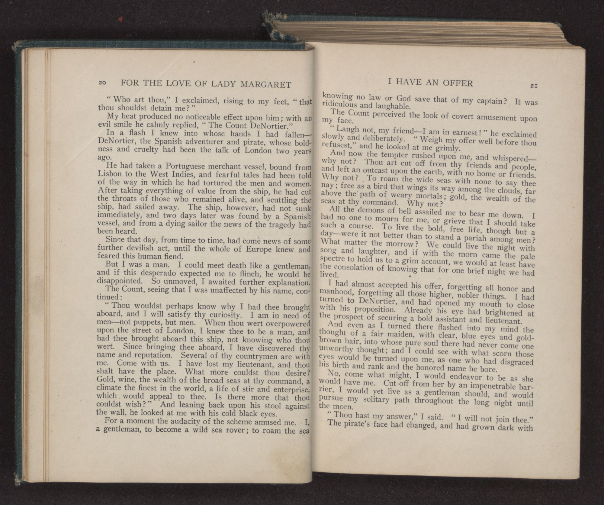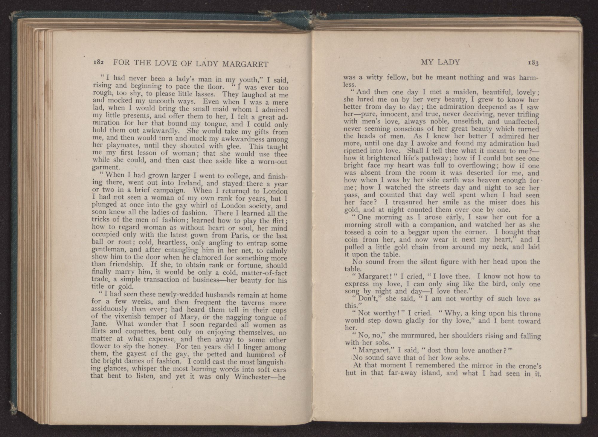 I could hear the whispers of the Viscount James Henry Hampden, who stood beside her; and while he fanned her with the pretty jeweled fan and poured out a stream of small talk, it was a sight for gods and men. It was more than mortal man could bear, and stretching out my arms, I called to her, “Margaret!” She turned her dark blue eyes upon me, and as she did so faded from my sight.