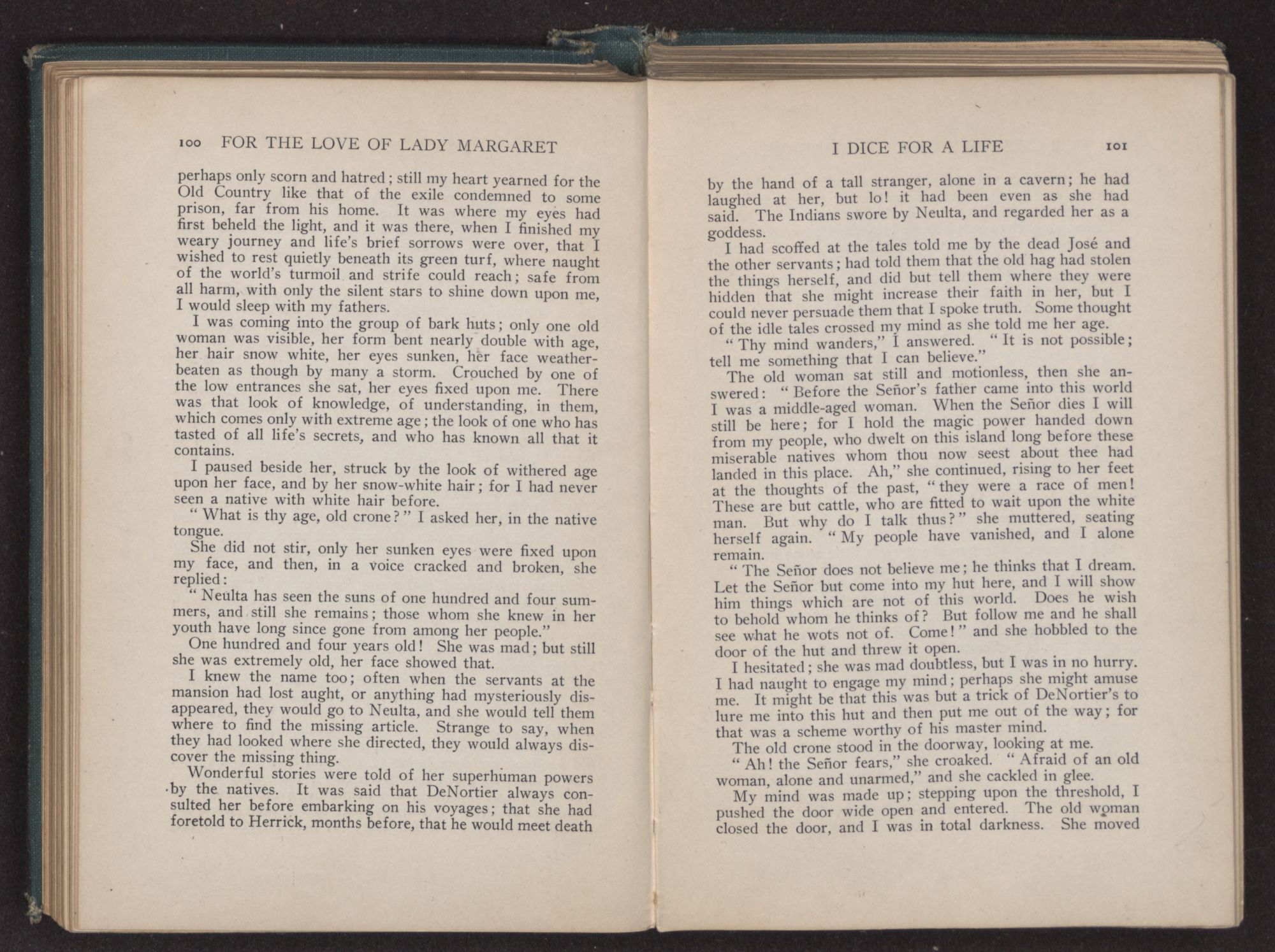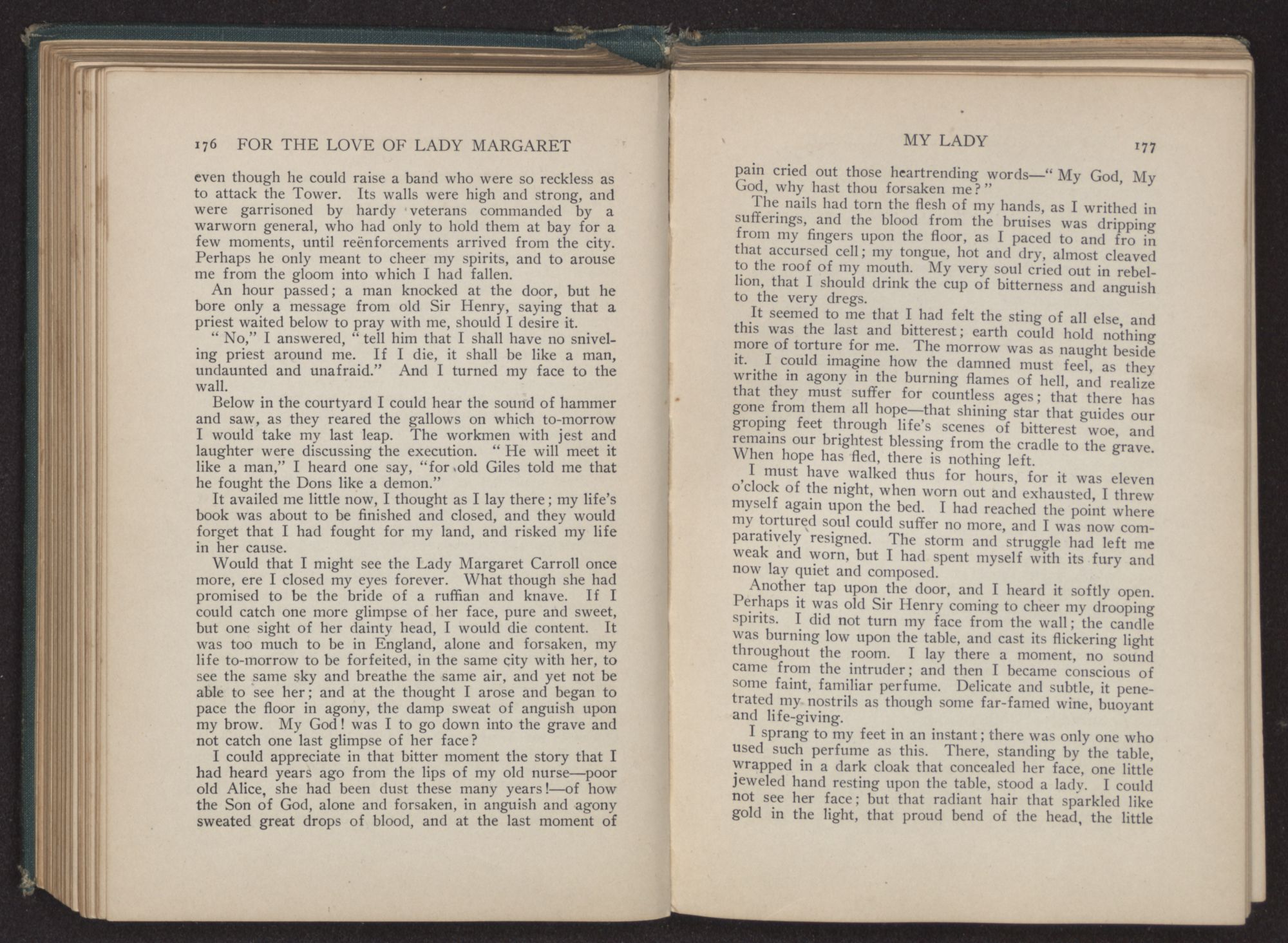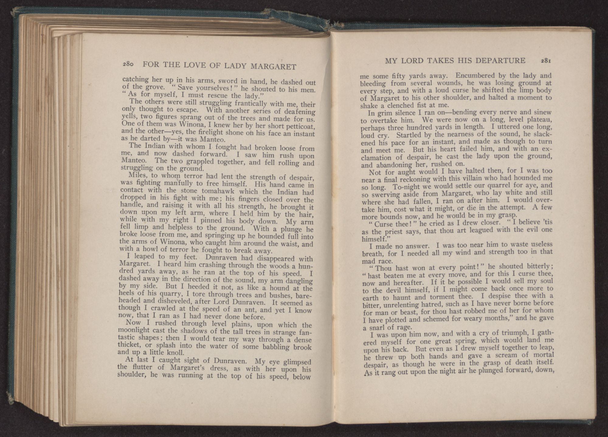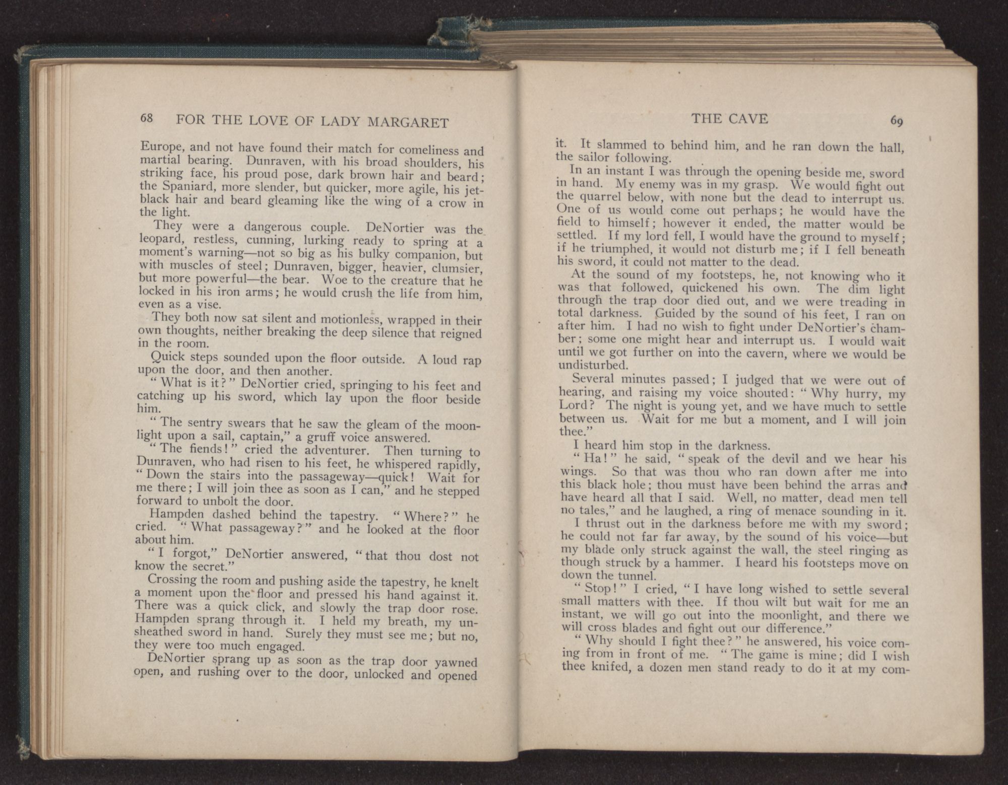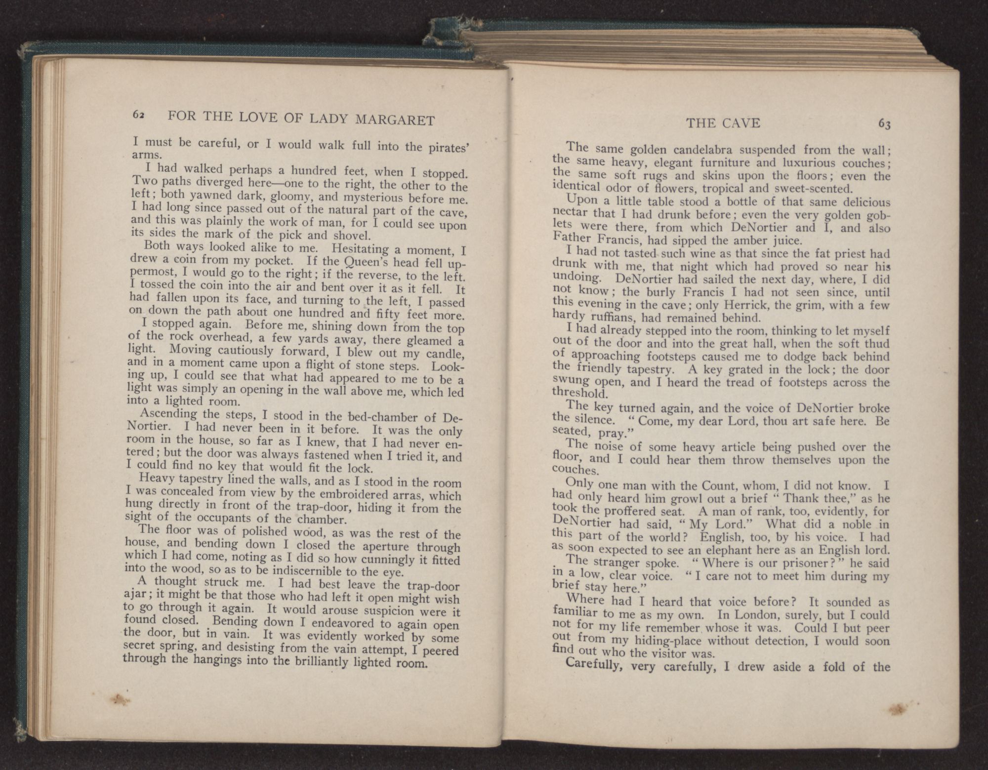 I could hear the whispers of the Viscount James Henry Hampden, who stood beside her; and while he fanned her with the pretty jeweled fan and poured out a stream of small talk, it was a sight for gods and men. It was more than mortal man could bear, and stretching out my arms, I called to her, “Margaret!” She turned her dark blue eyes upon me, and as she did so faded from my sight.