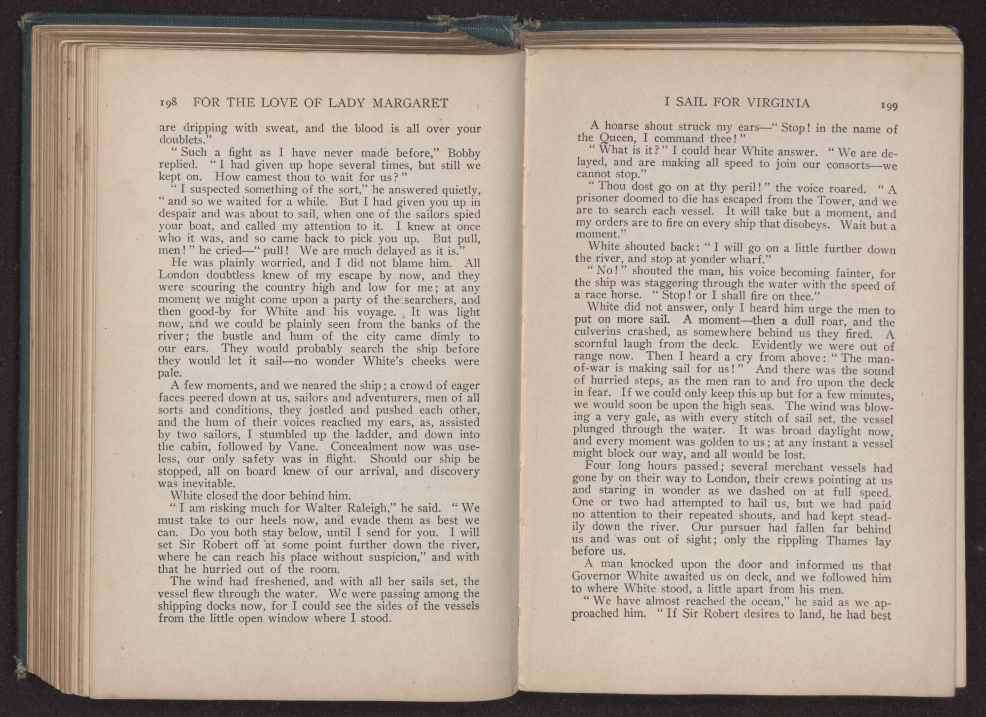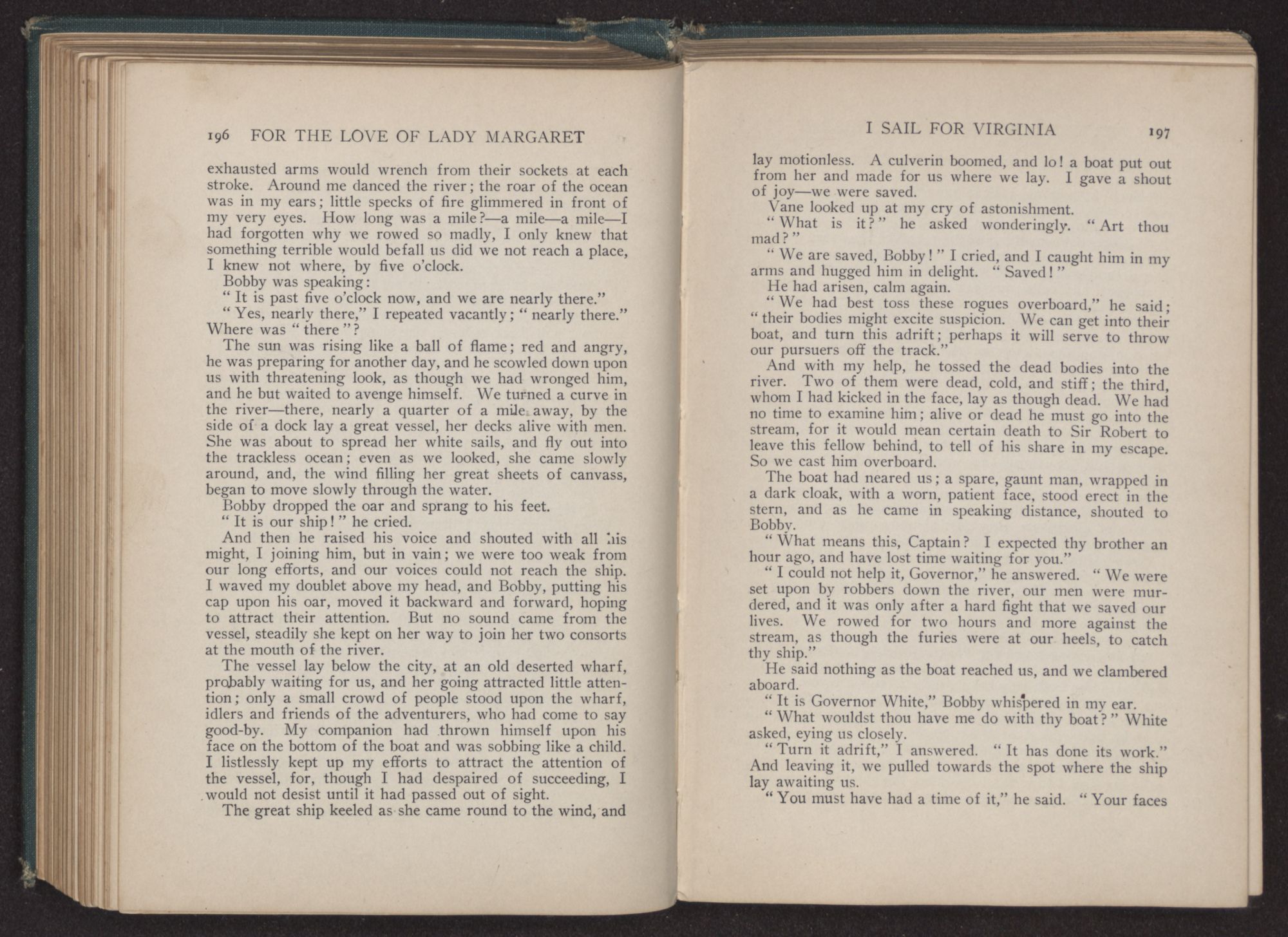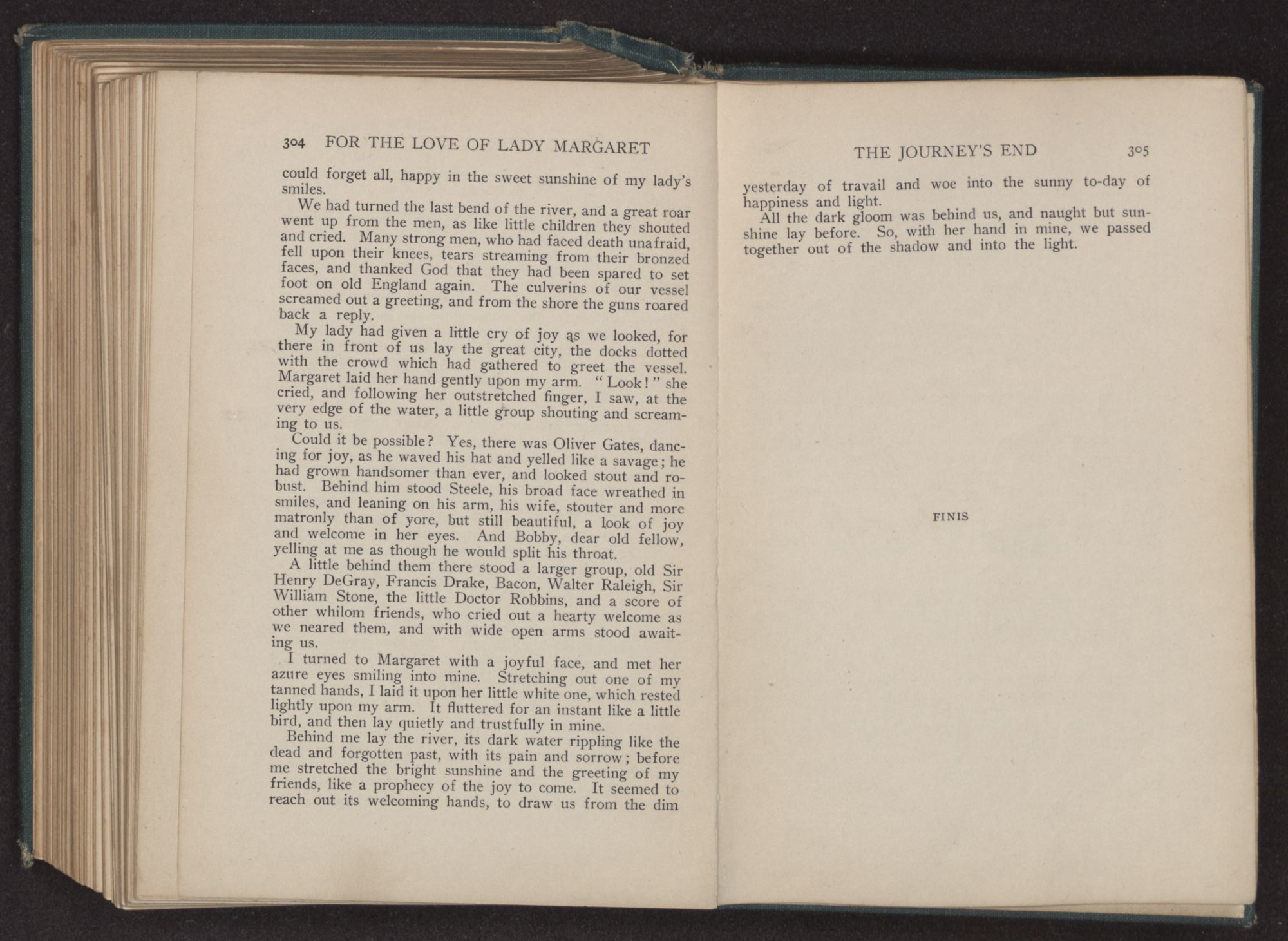 My lady had given a little cry of joy as we looked, for there in front of us lay the great city, the docks dotted with the crowd which had gathered to greet the vessel. Margaret laid her hand gently upon my arm. “Look!” she cried, and following her outstretched finger, I saw, at the very edge of the water, a little group shouting and screaming to us.