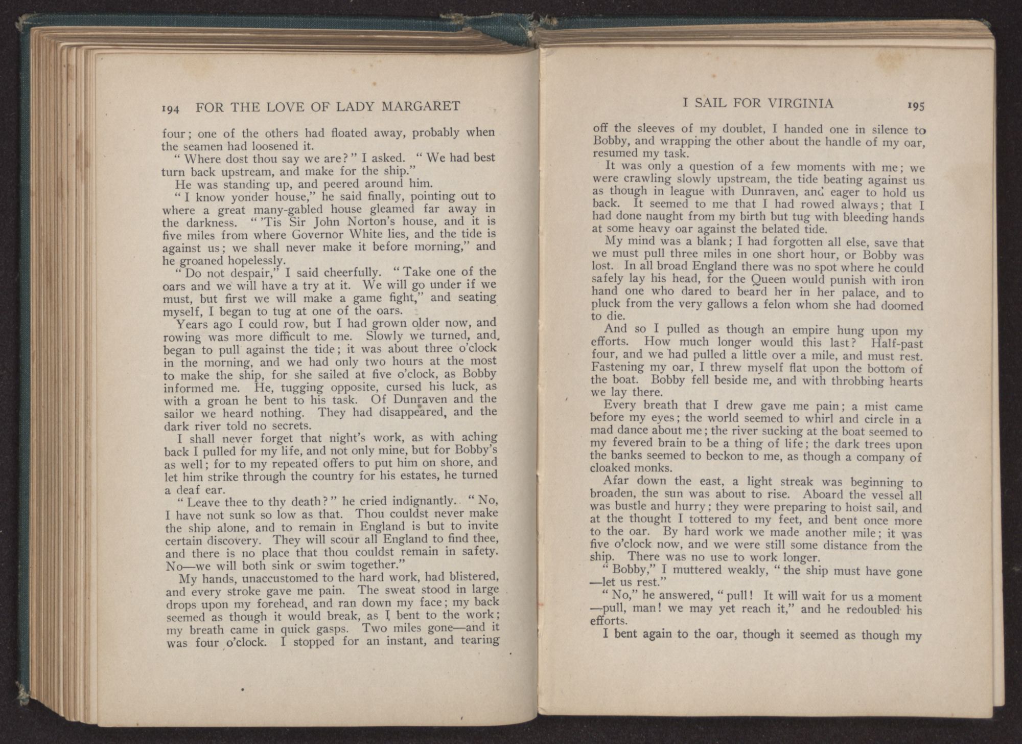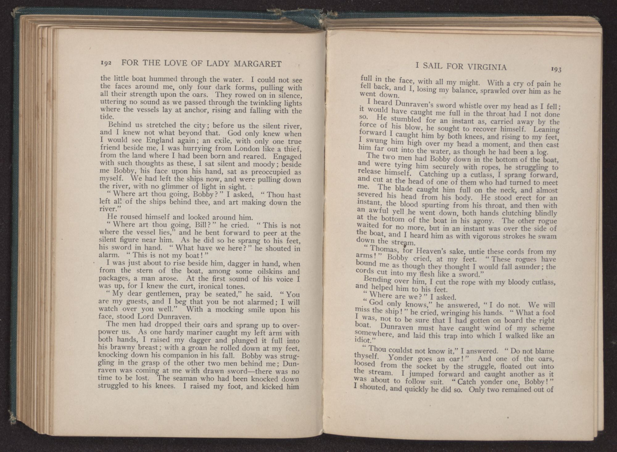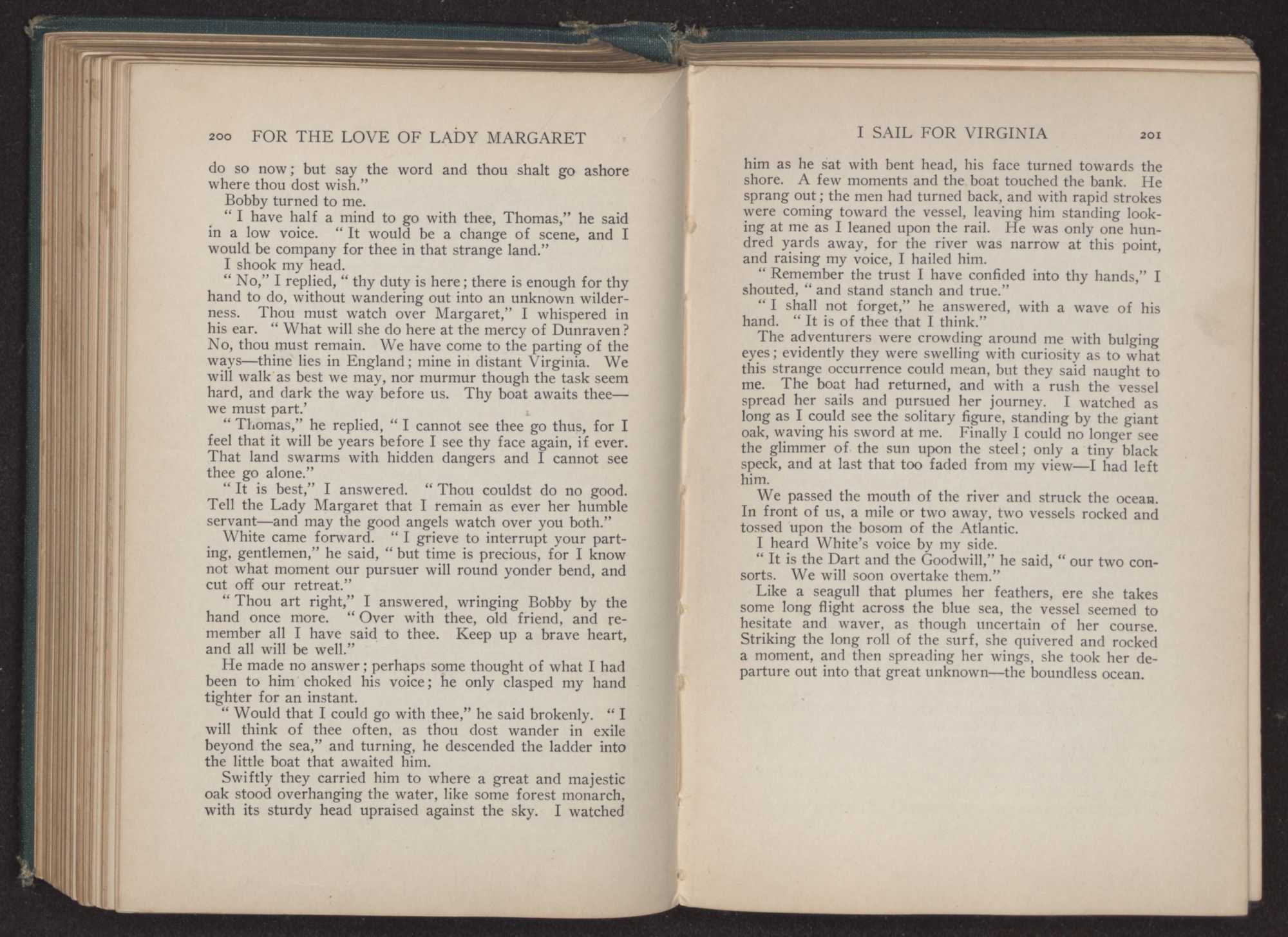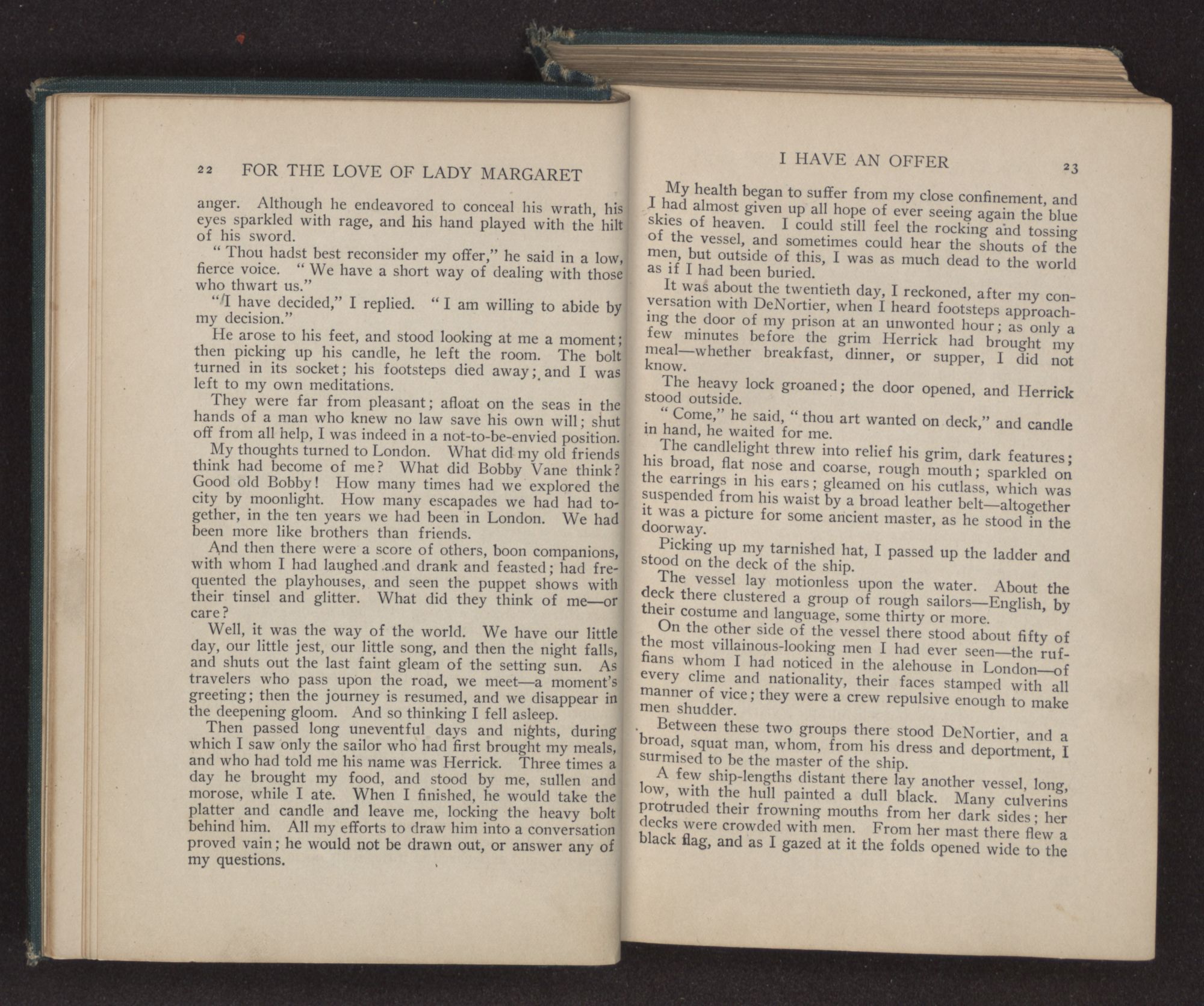 My lady had given a little cry of joy as we looked, for there in front of us lay the great city, the docks dotted with the crowd which had gathered to greet the vessel. Margaret laid her hand gently upon my arm. “Look!” she cried, and following her outstretched finger, I saw, at the very edge of the water, a little group shouting and screaming to us.