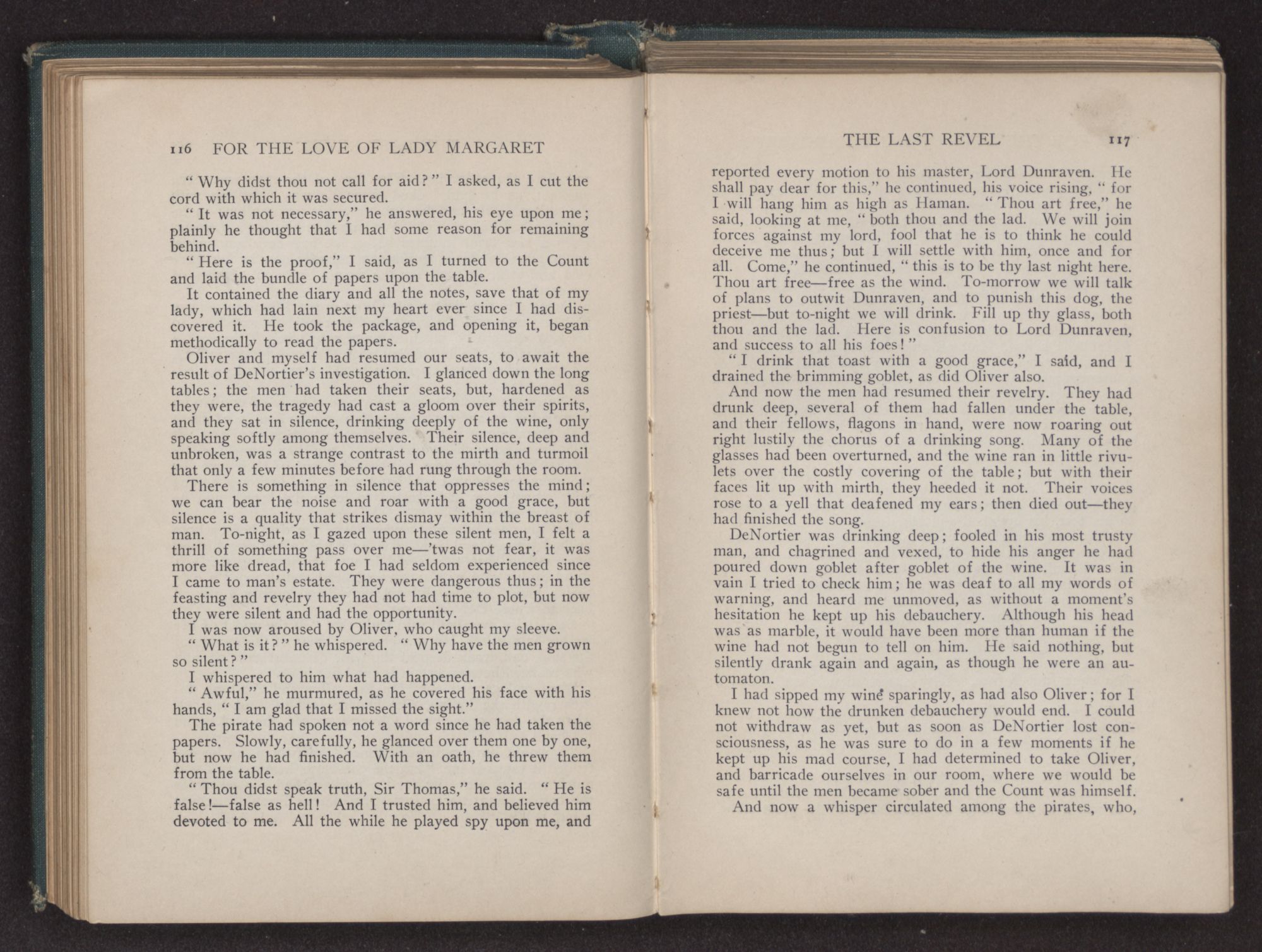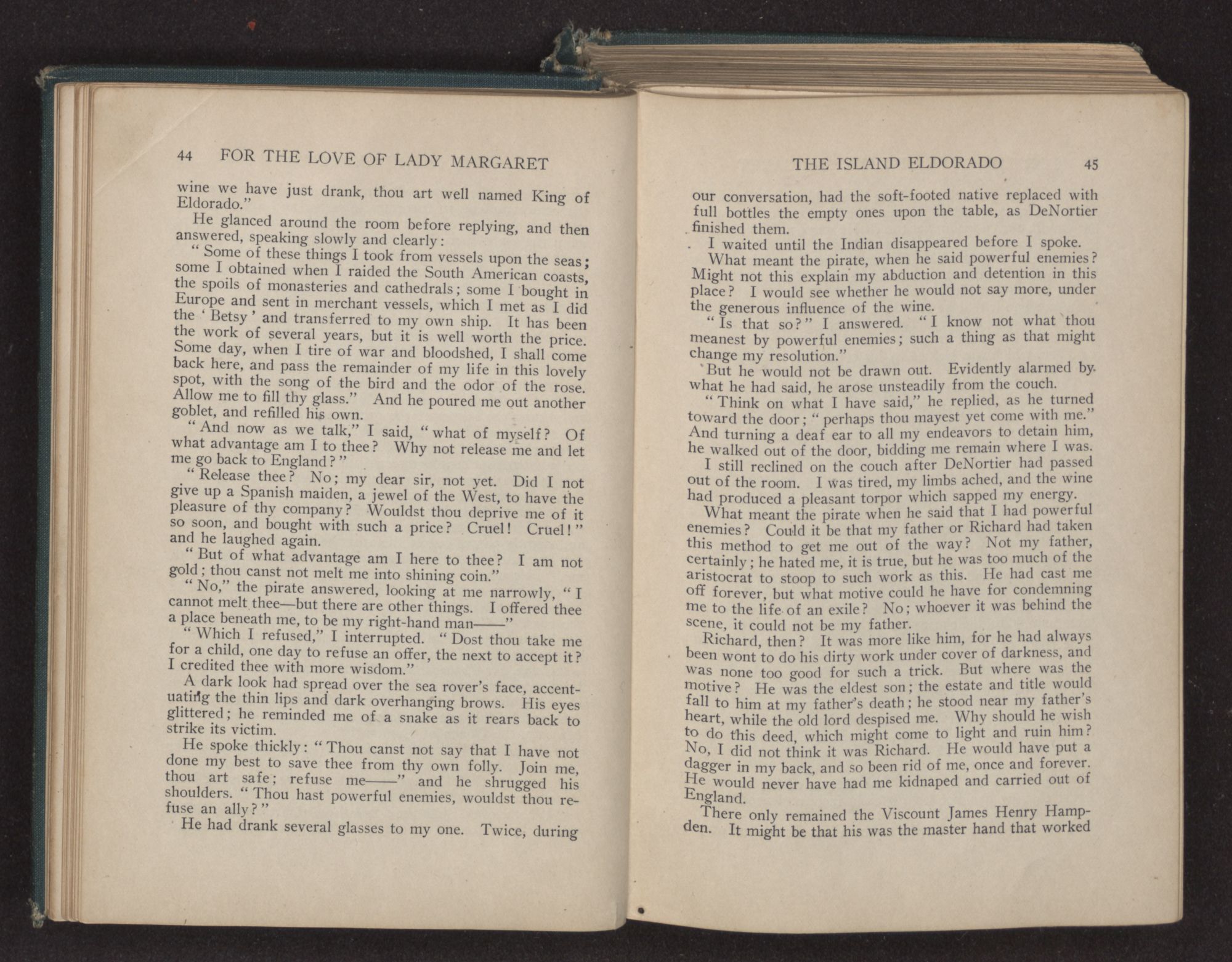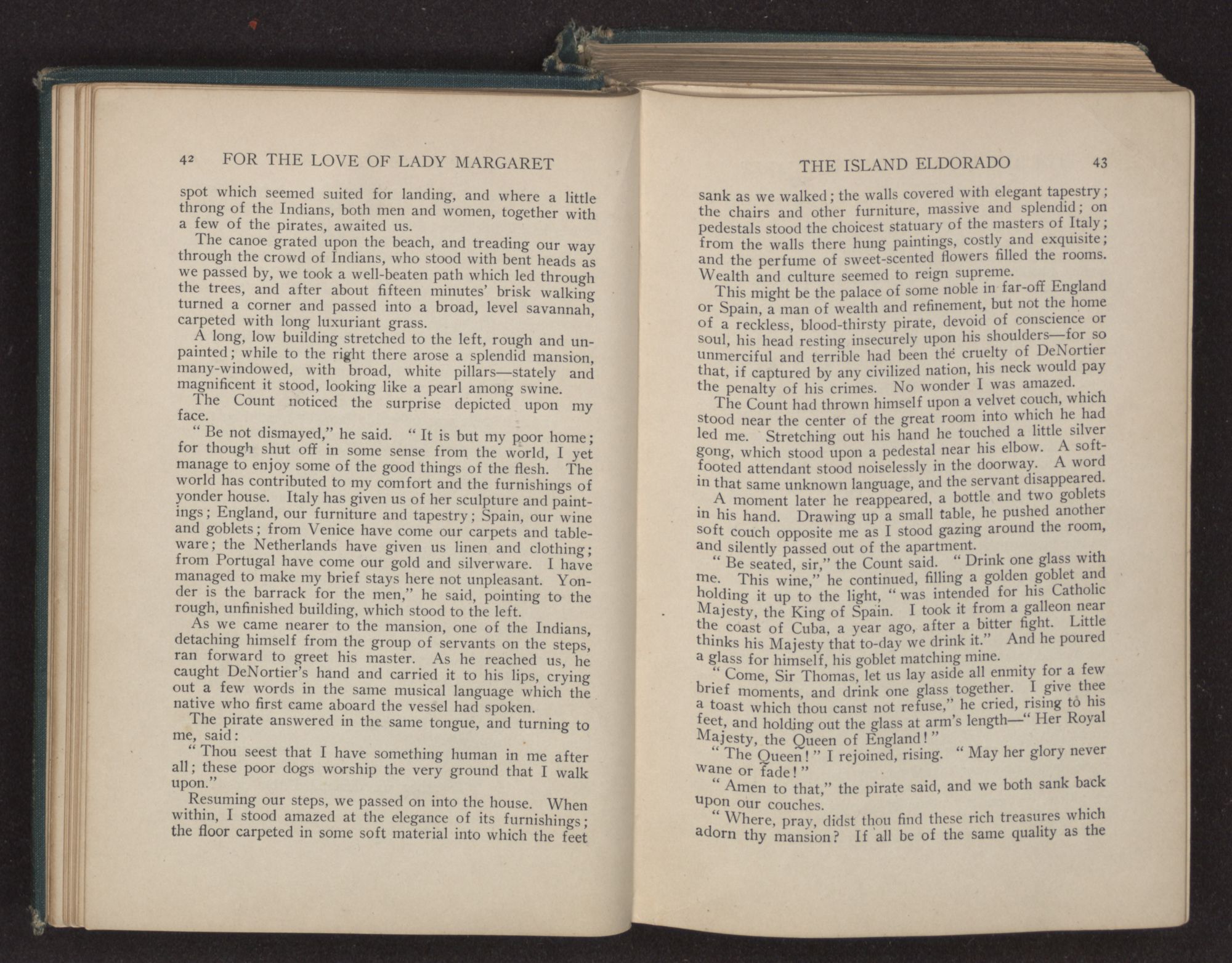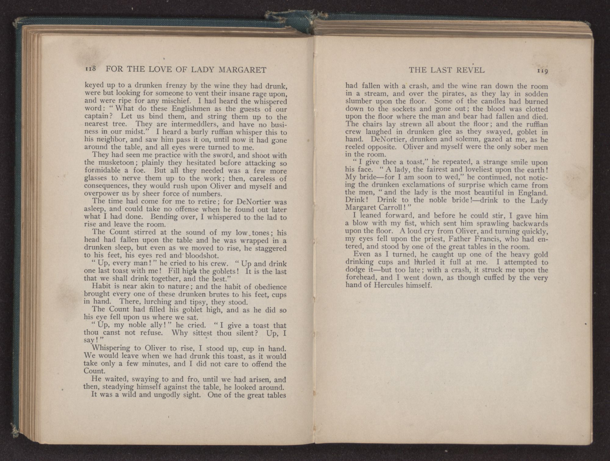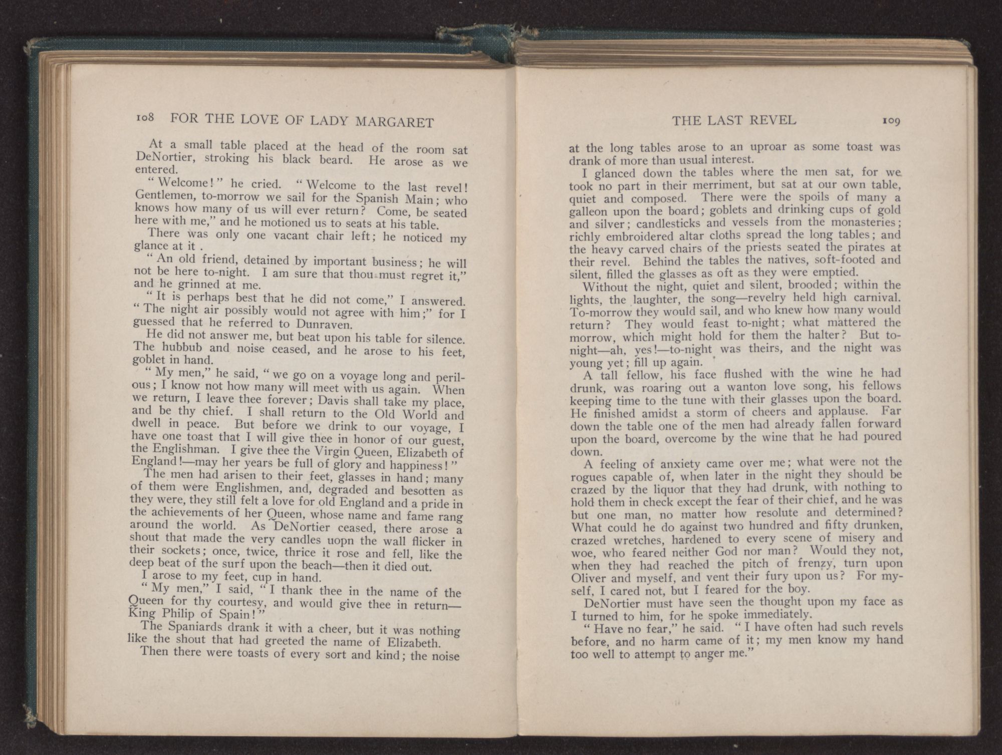There were some twenty-five or thirty of them, who, flagons in hand, sat about the table, telling many strange tales of the unknown regions of the Spanish Main, and motioning to the waiters, who ran frantically to and fro, filling the ever empty glasses. They were plainly the terror and admiration of the other guests, who, huddled together in a corner near the chimney, leered and whispered at their boisterous conduct and wild appearance.