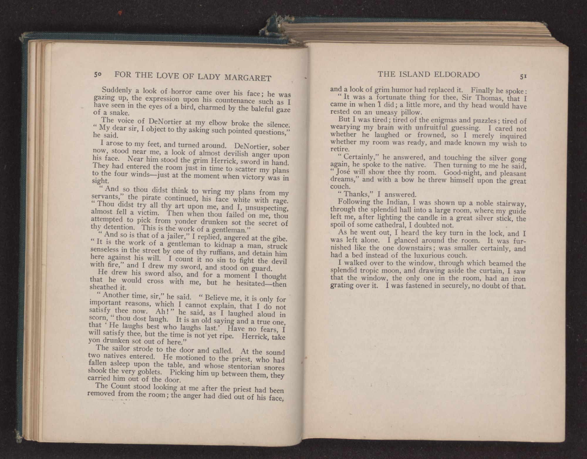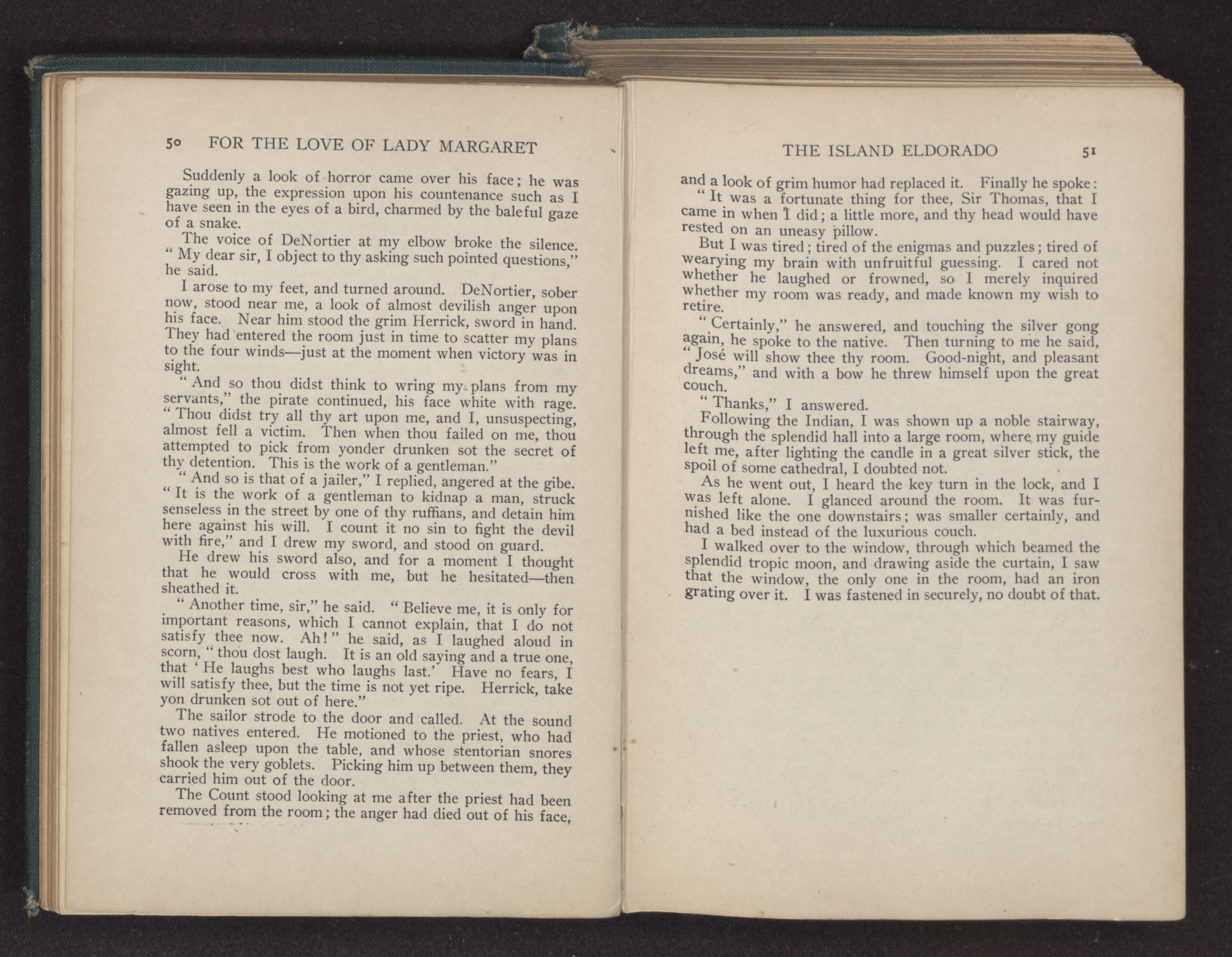 The seamen cried out in Spanish, a tongue which I understood, and their conversation, mostly about their voyages, was carried on in that same language. But they talked only of such things as seamen were wont to do; so turning away from my station, I retraced my steps toward my room.