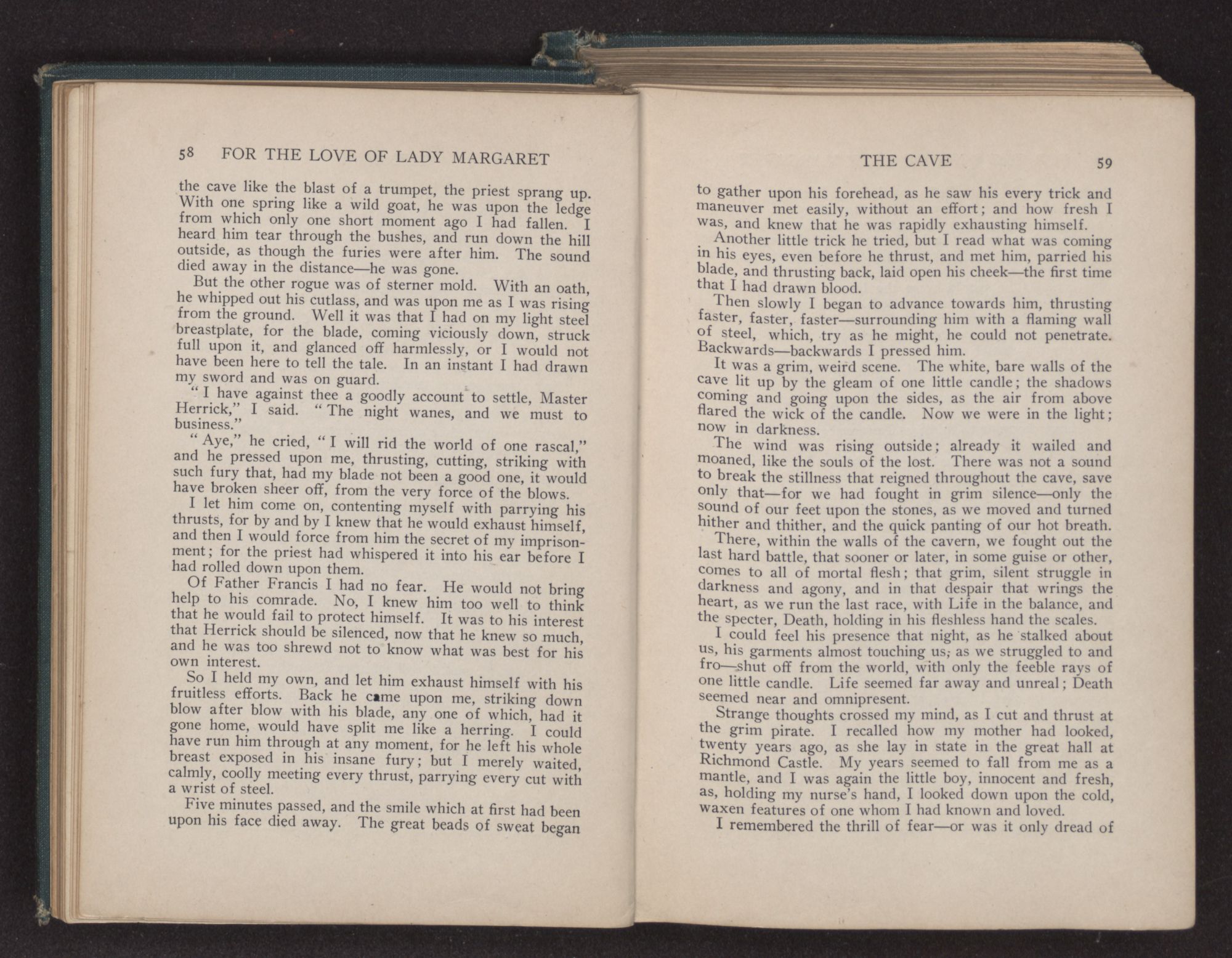 I had small time to observe these things, however, for he pressed me with the fury of a demon, now thrusting with the point, then cutting at me with the blade. I had on merely a light rapier, more for dress than work, while he was using a heavy service sword, and I began to realize that this could not last much longer, for he would beat me down by the strength of his arm, as with all his swordsmanship he pressed upon me.