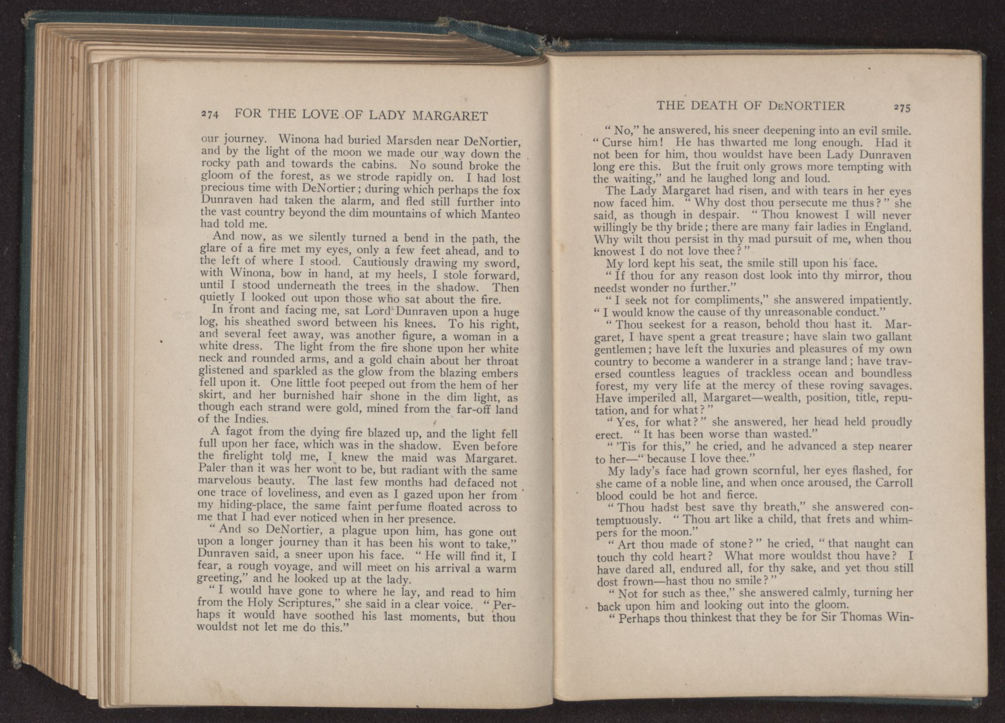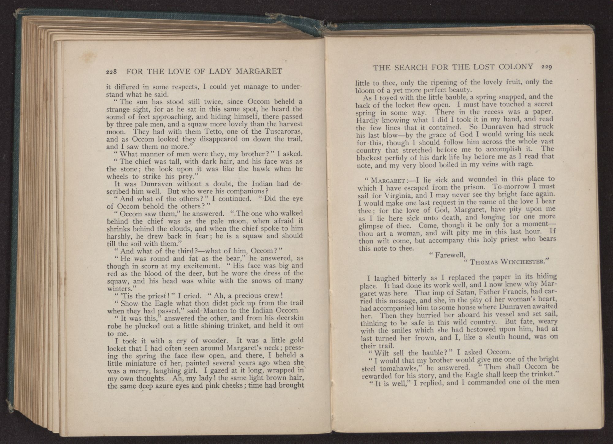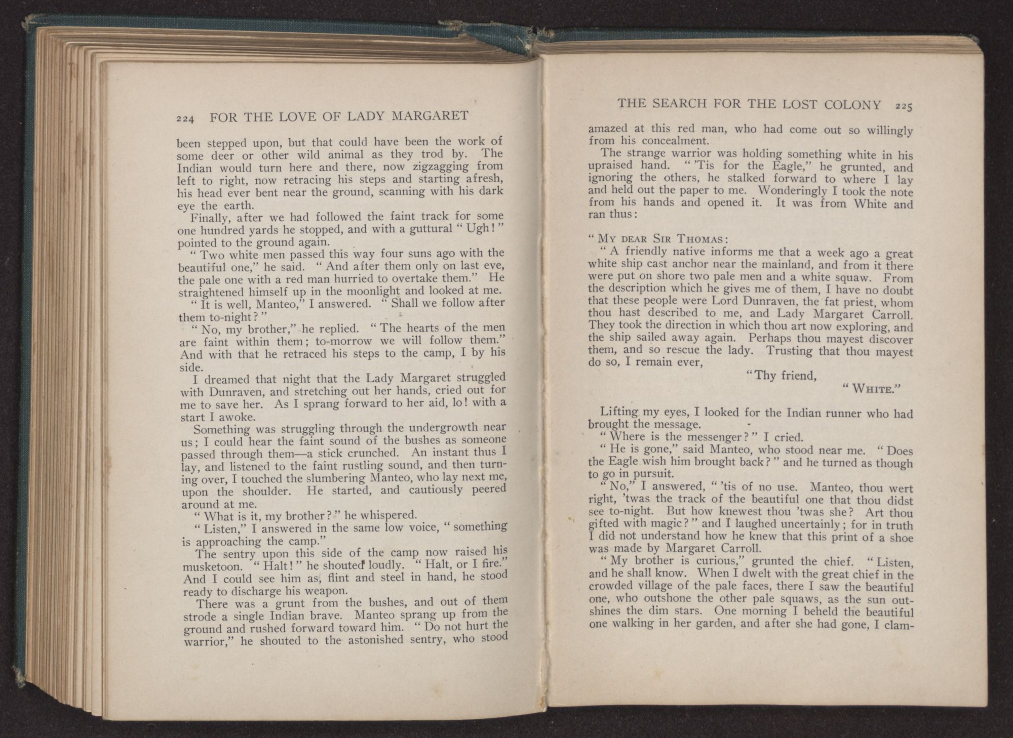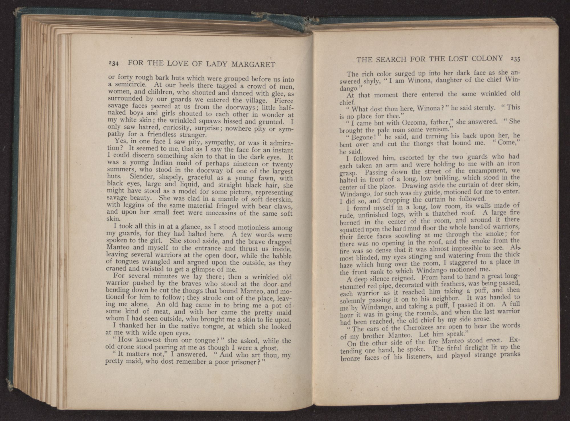 For the love of Lady Margaret : a romance of the lost colony / by William Thomas Wilson. Charlotte, N.C. : Stone & Barringer Company, 1908. 305 p., [5] leaves of plates : ill. ; 20 cm. Verso of t.p.: The Quinn & Boden Co. Press, Rahway, N.J. Frontispiece and plates facing p. 8, 48, 218 and 296, signed by Rita Carter(?) Advertisements on p. [2]-[3] at end.