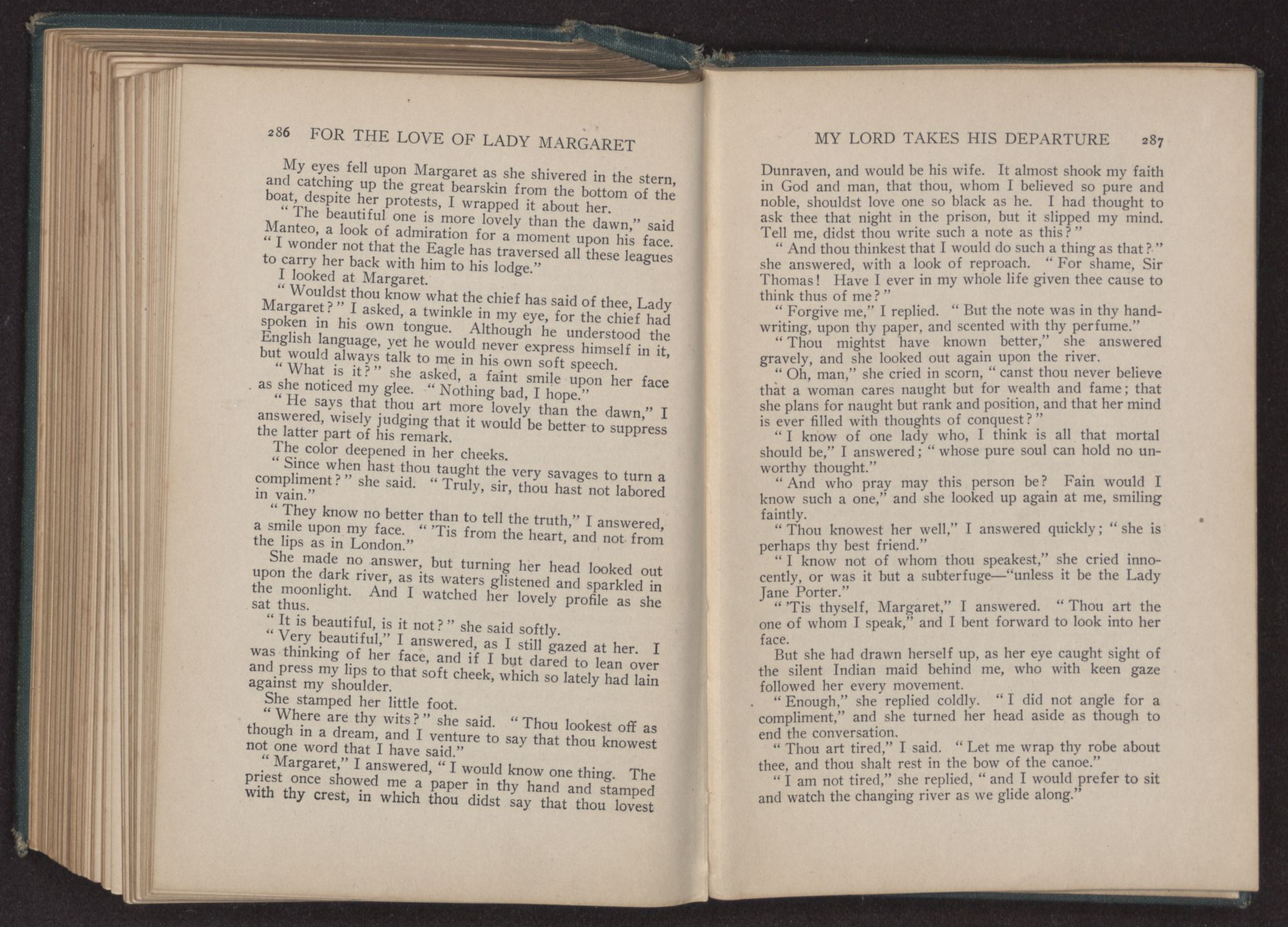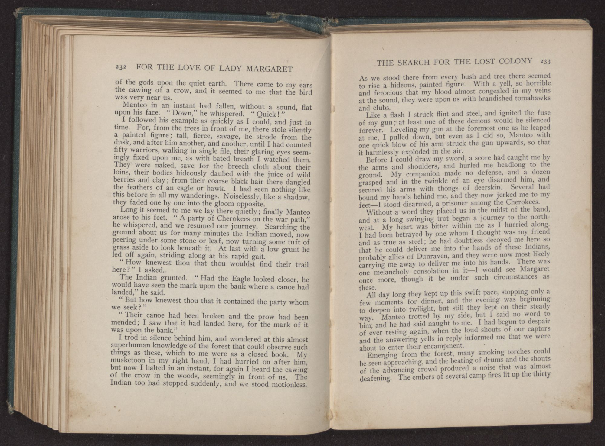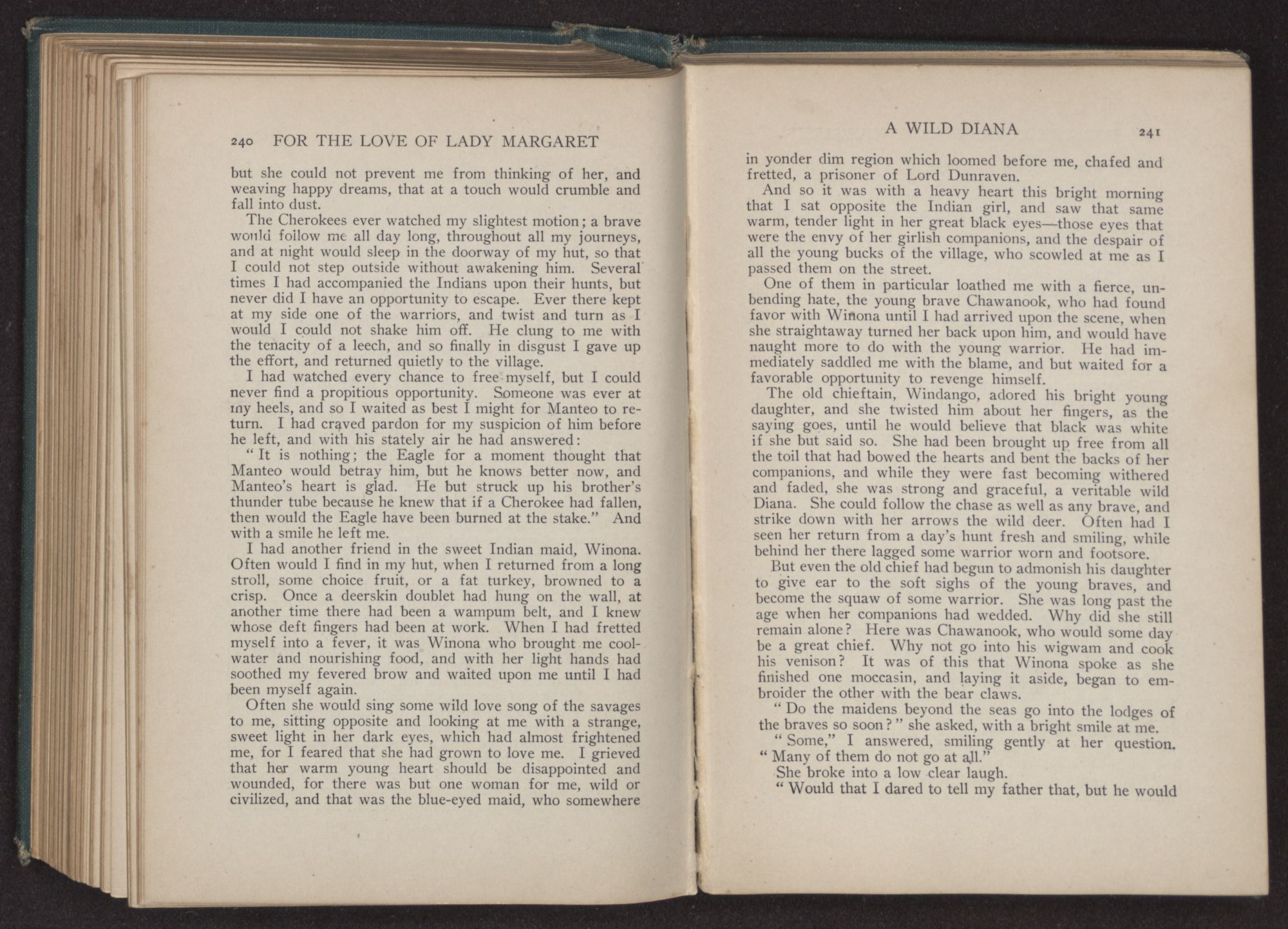 For the love of Lady Margaret : a romance of the lost colony / by William Thomas Wilson. Charlotte, N.C. : Stone & Barringer Company, 1908. 305 p., [5] leaves of plates : ill. ; 20 cm. Verso of t.p.: The Quinn & Boden Co. Press, Rahway, N.J. Frontispiece and plates facing p. 8, 48, 218 and 296, signed by Rita Carter(?) Advertisements on p. [2]-[3] at end.