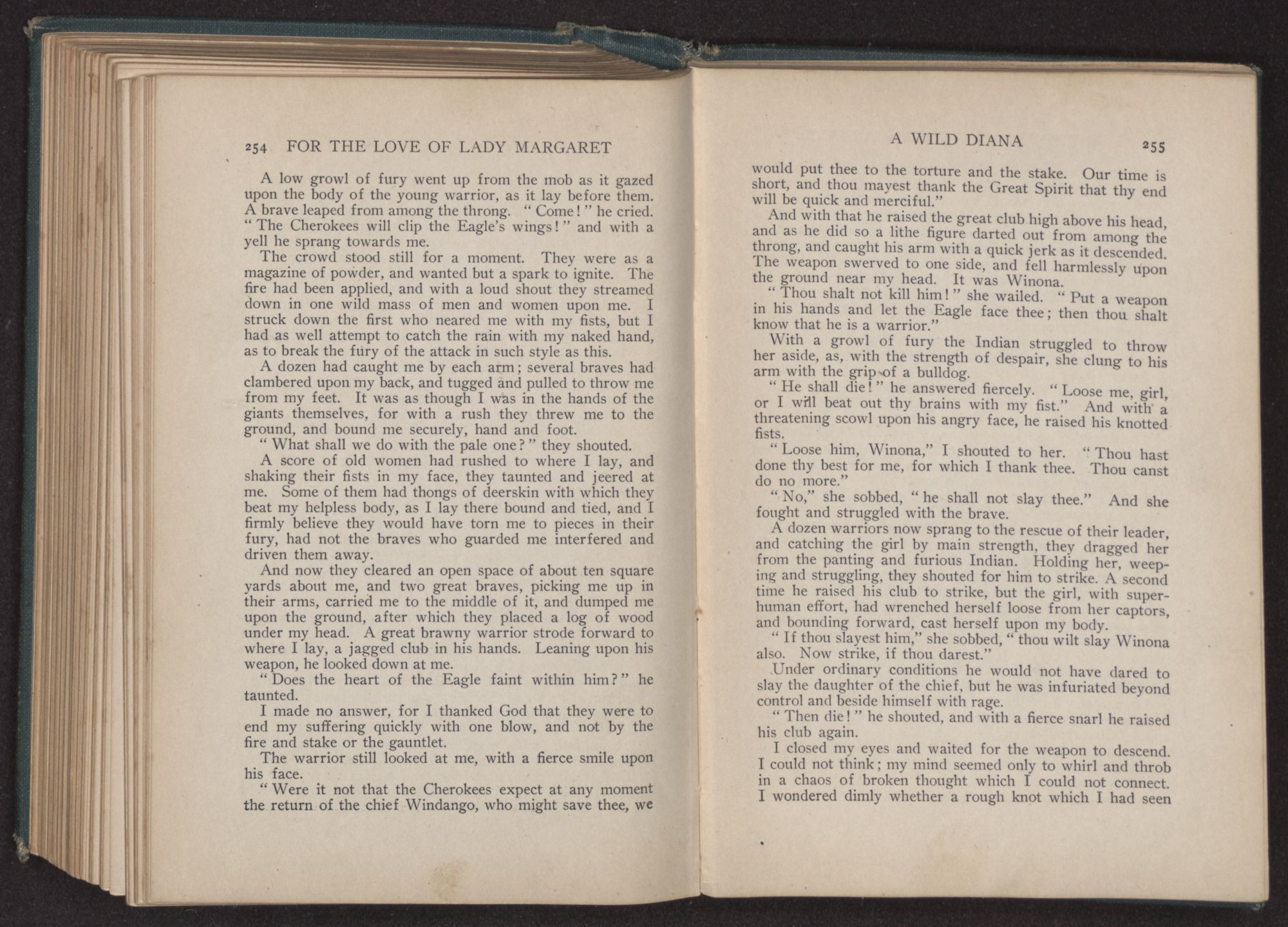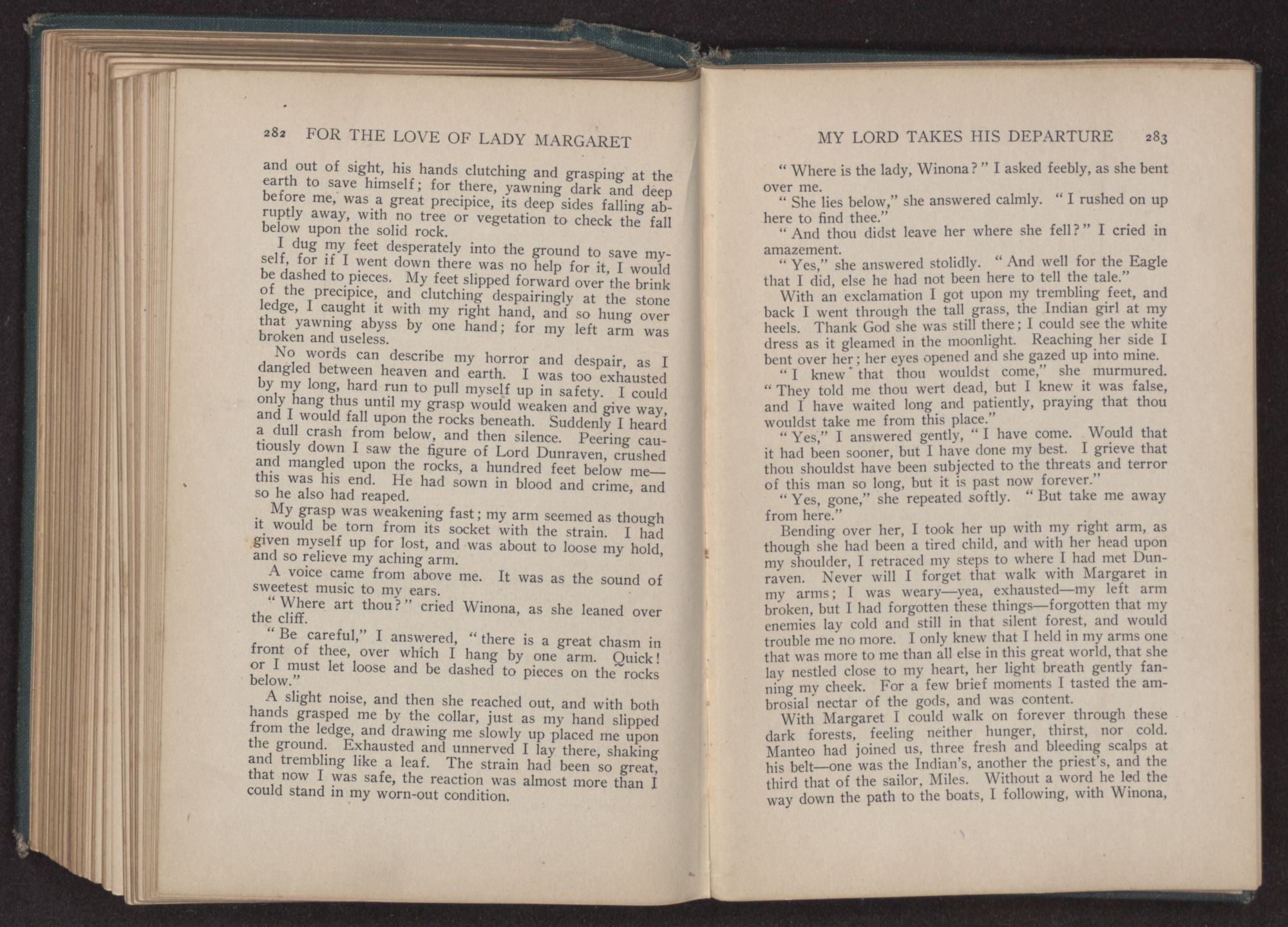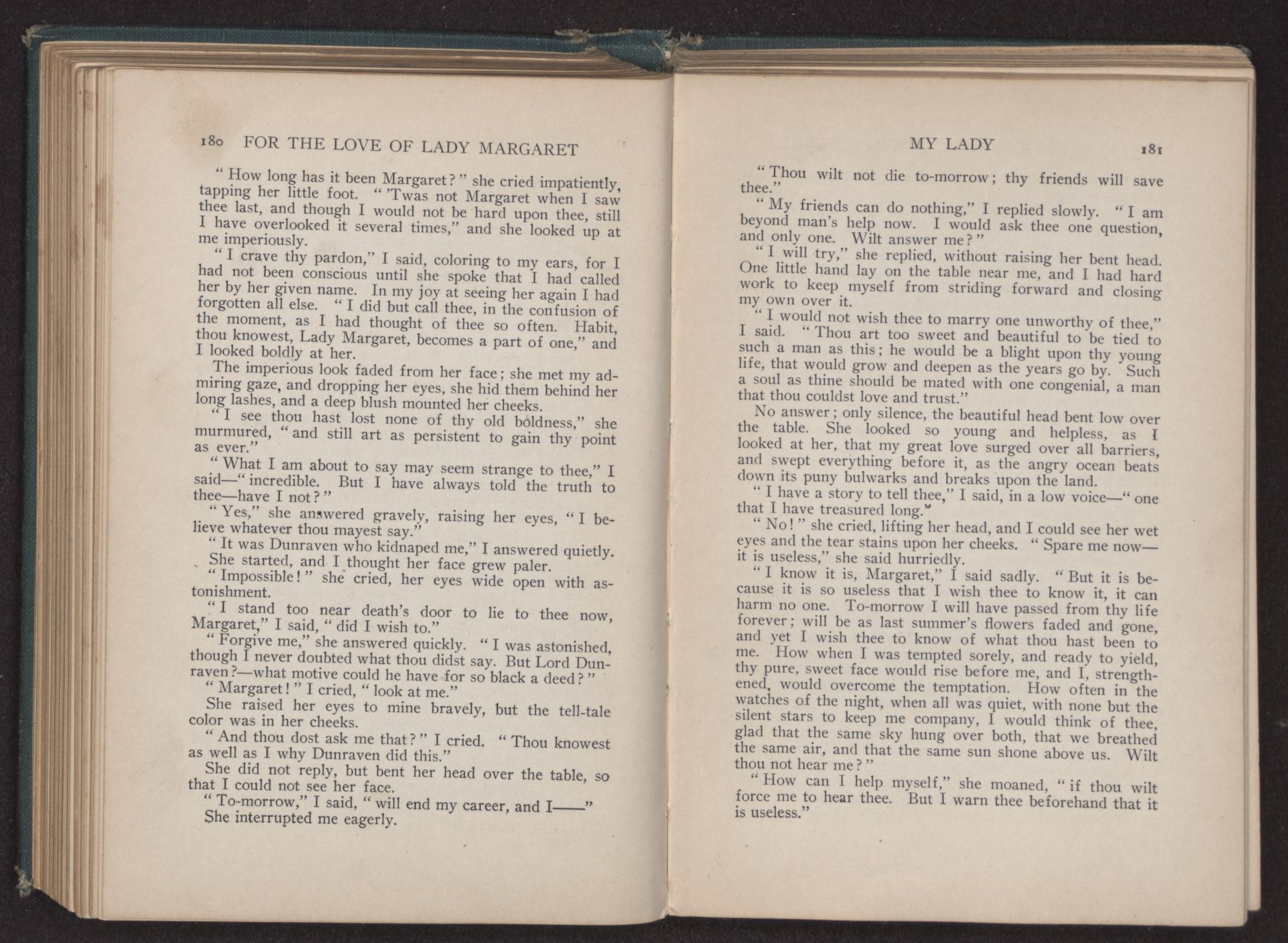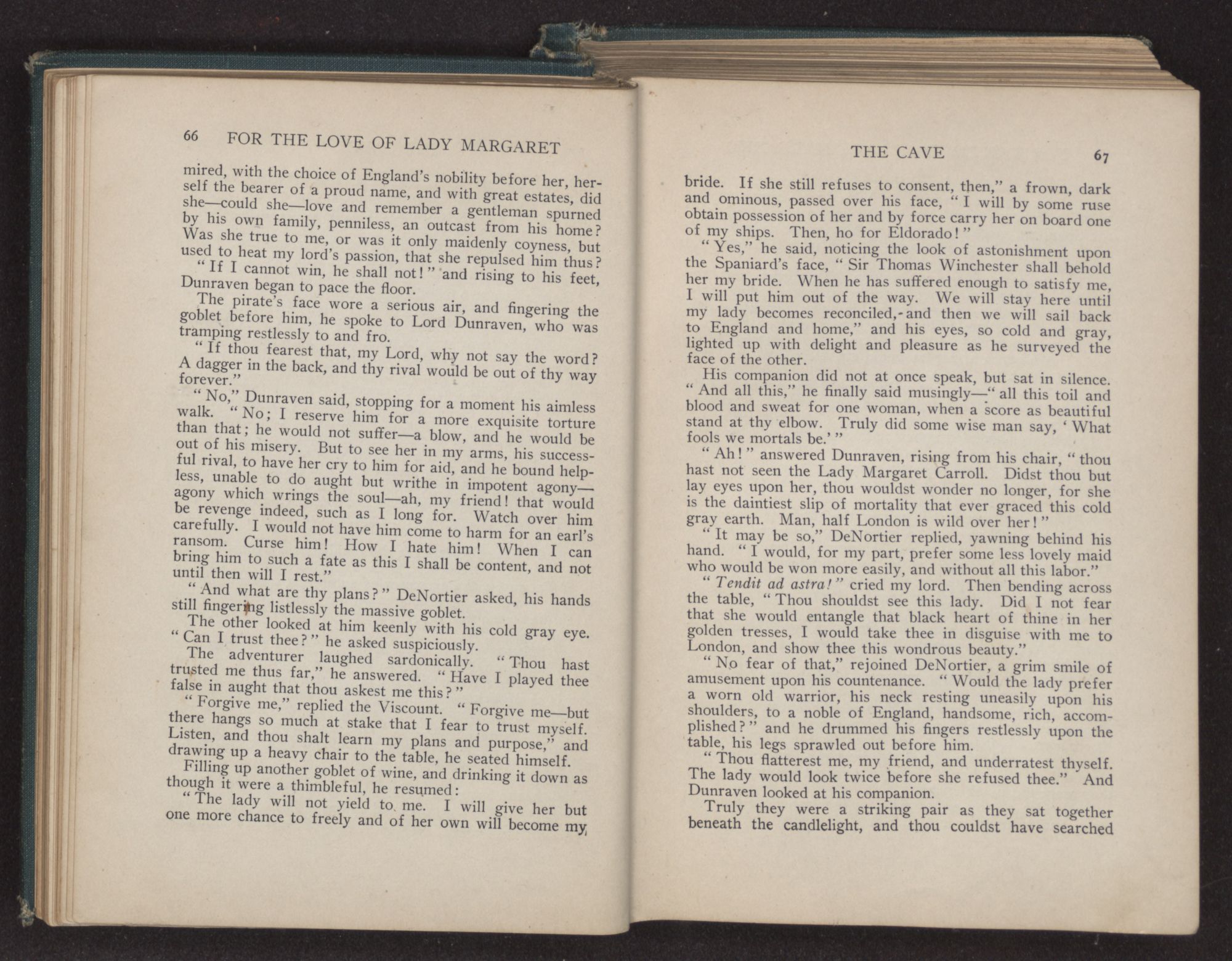 For the love of Lady Margaret : a romance of the lost colony / by William Thomas Wilson. Charlotte, N.C. : Stone & Barringer Company, 1908. 305 p., [5] leaves of plates : ill. ; 20 cm. Verso of t.p.: The Quinn & Boden Co. Press, Rahway, N.J. Frontispiece and plates facing p. 8, 48, 218 and 296, signed by Rita Carter(?) Advertisements on p. [2]-[3] at end.