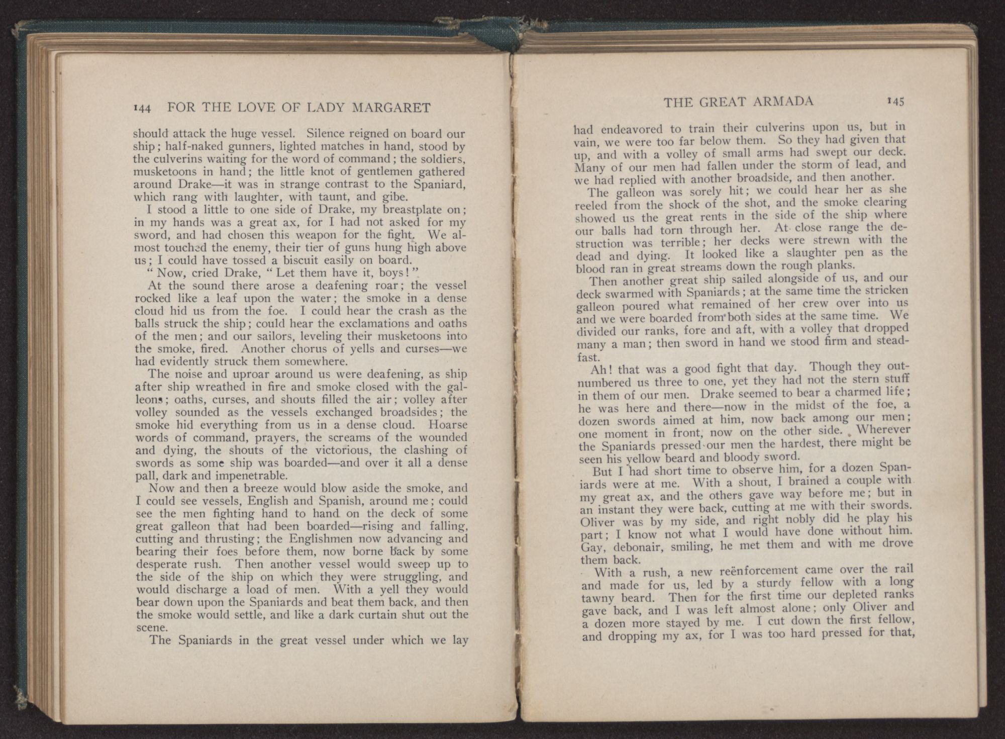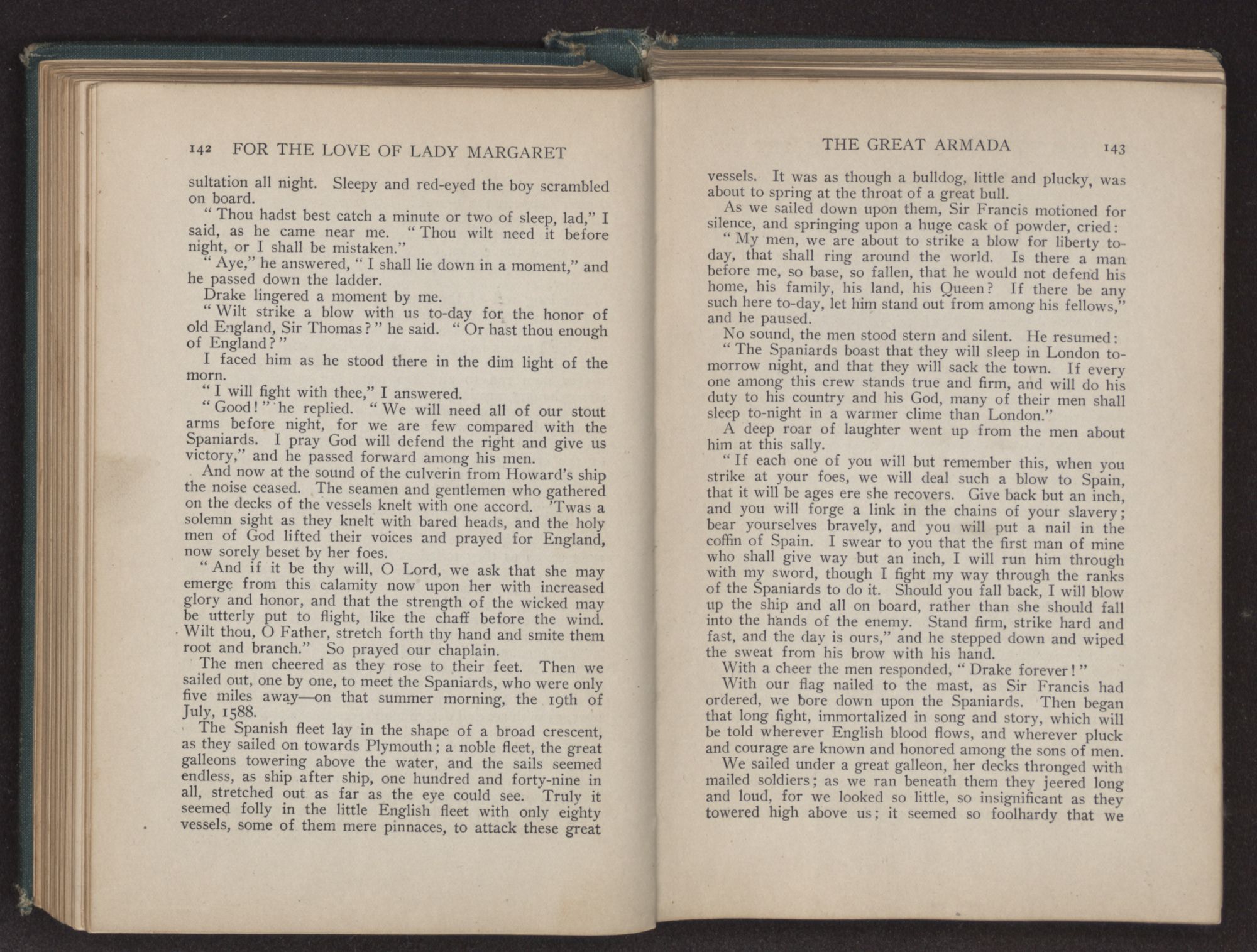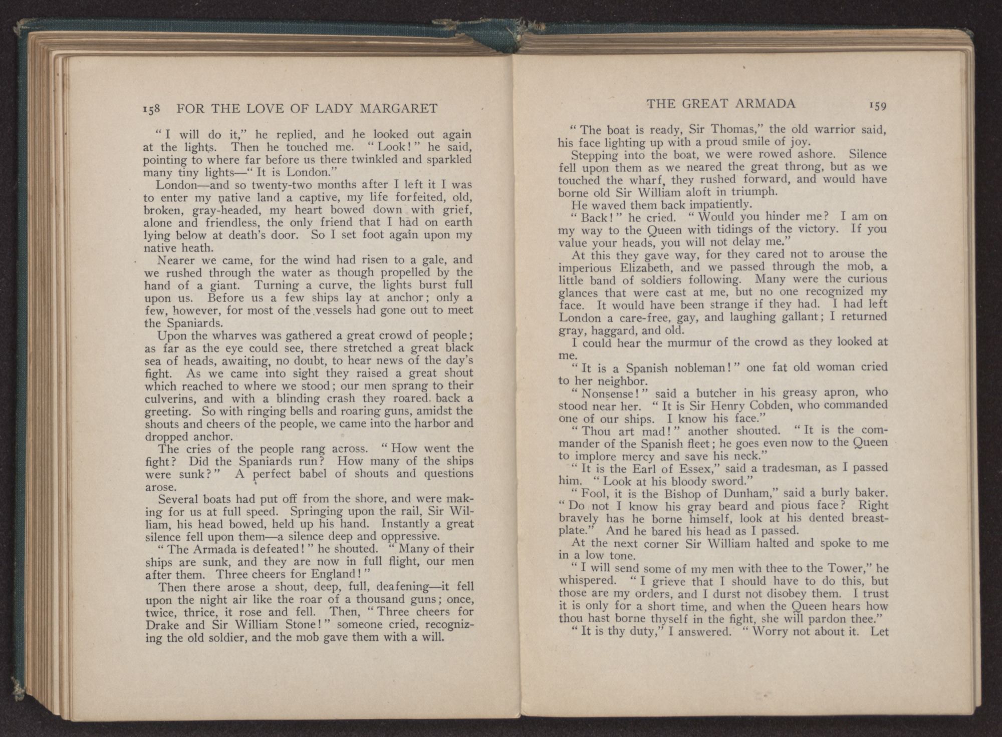 We had turned the last bend of the river, and a great roar went up from the men, as like little children they shouted and cried. Many strong men, who had faced death unafraid, fell upon their knees, tears streaming from their bronzed faces, and thanked God that they had been spared to set foot on old England again. The culverins of our vessel screamed out a greeting, and from the shore the guns roared back a reply.