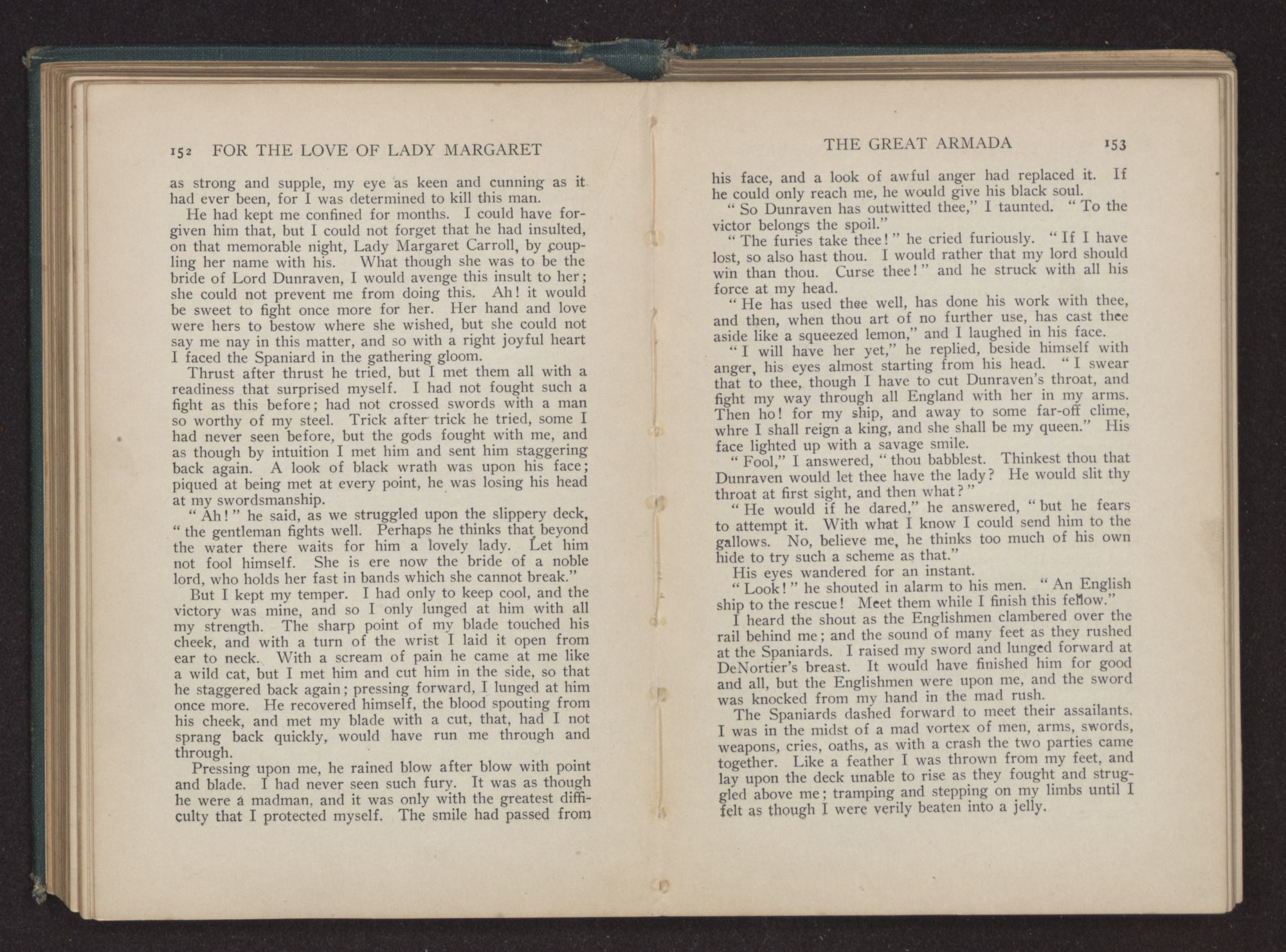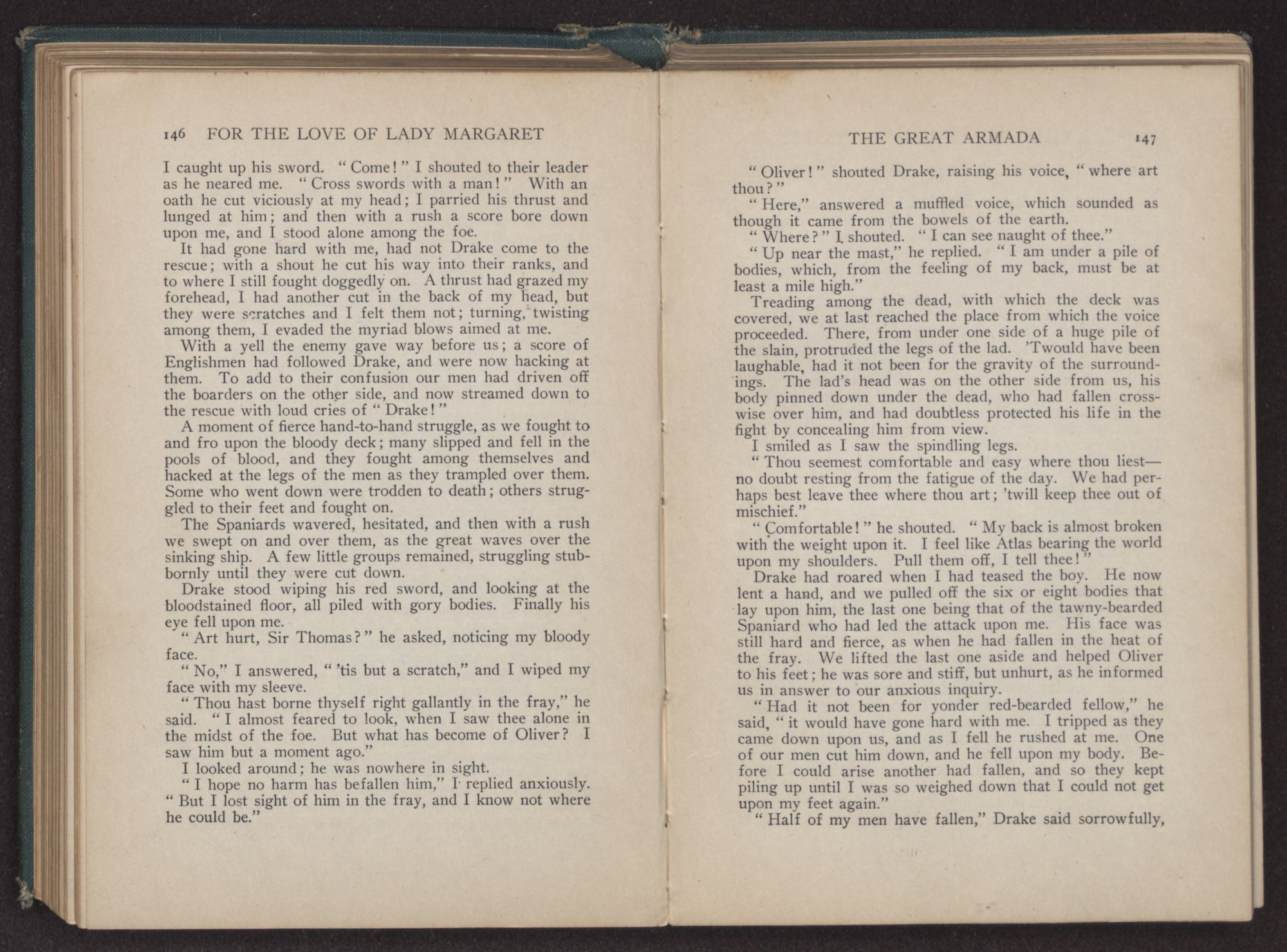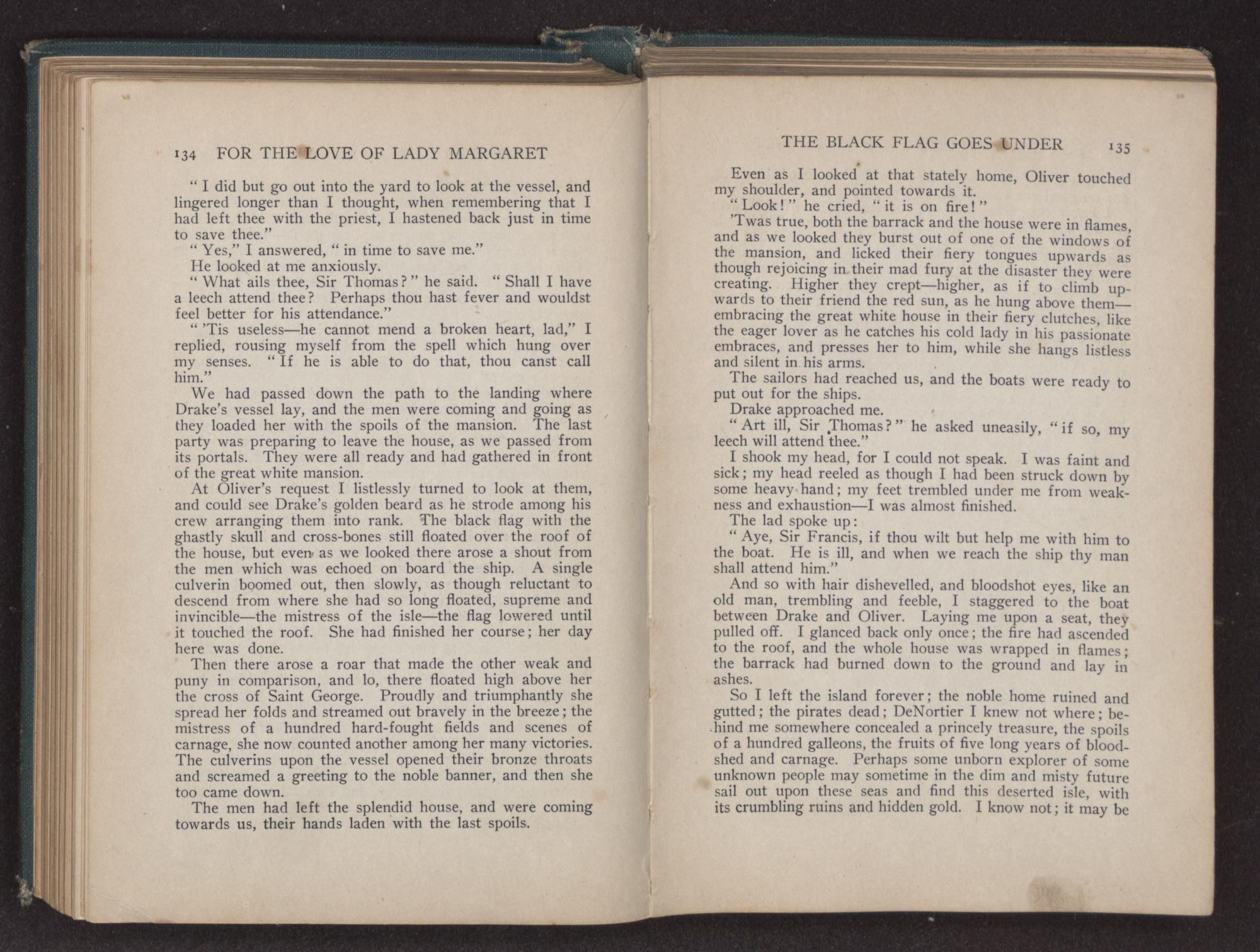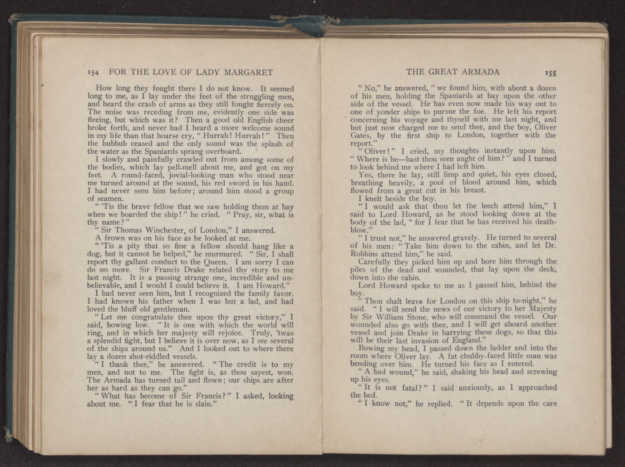We had turned the last bend of the river, and a great roar went up from the men, as like little children they shouted and cried. Many strong men, who had faced death unafraid, fell upon their knees, tears streaming from their bronzed faces, and thanked God that they had been spared to set foot on old England again. The culverins of our vessel screamed out a greeting, and from the shore the guns roared back a reply.