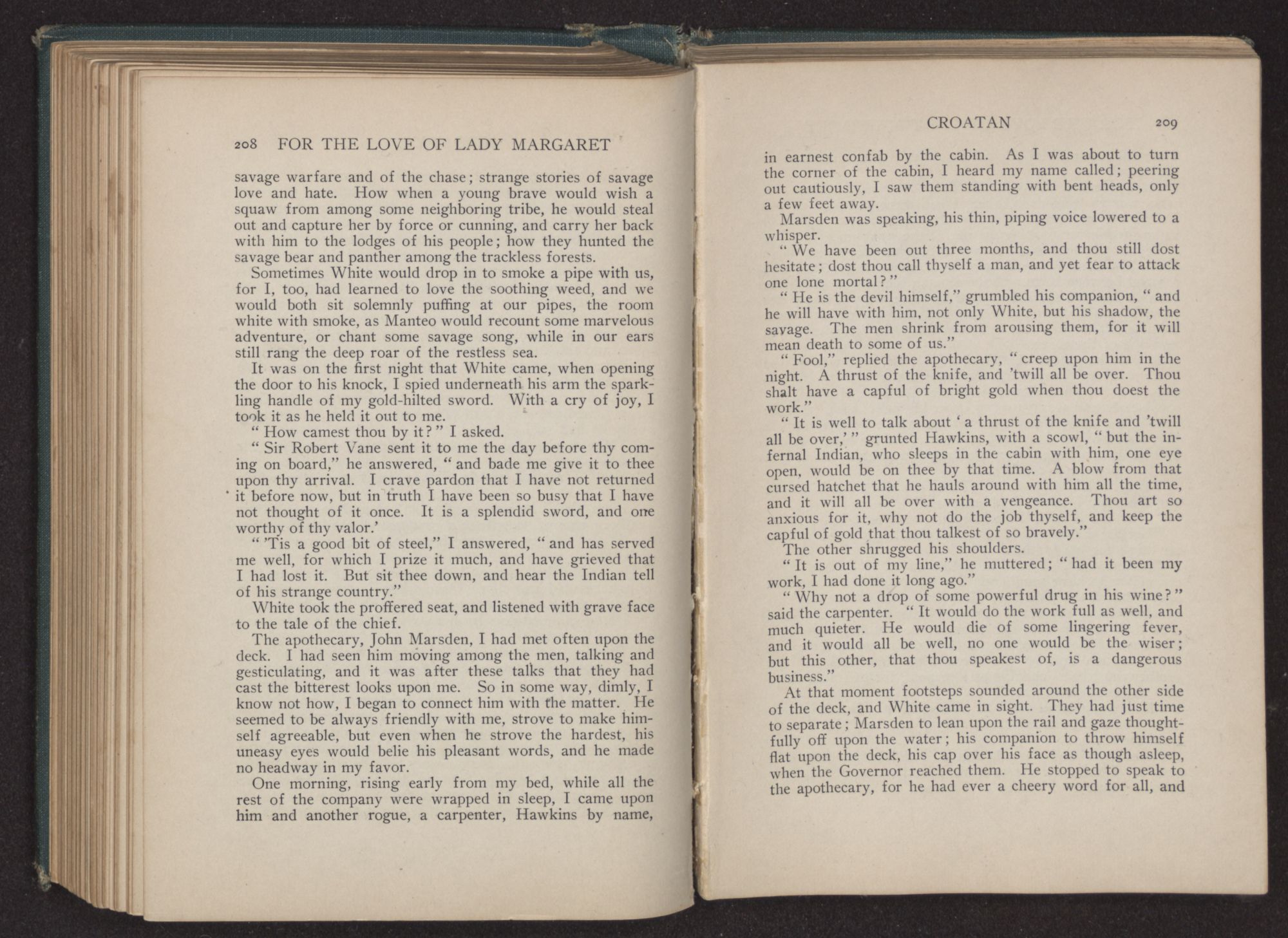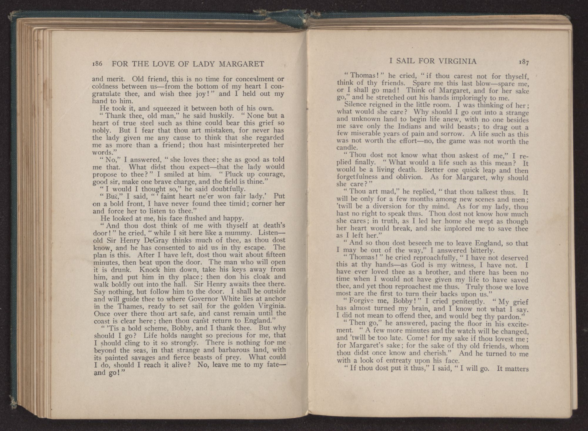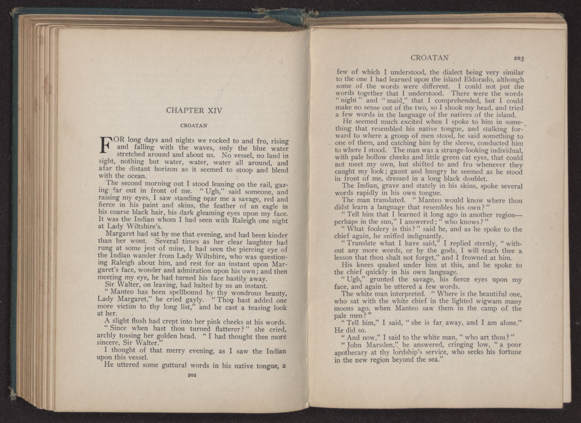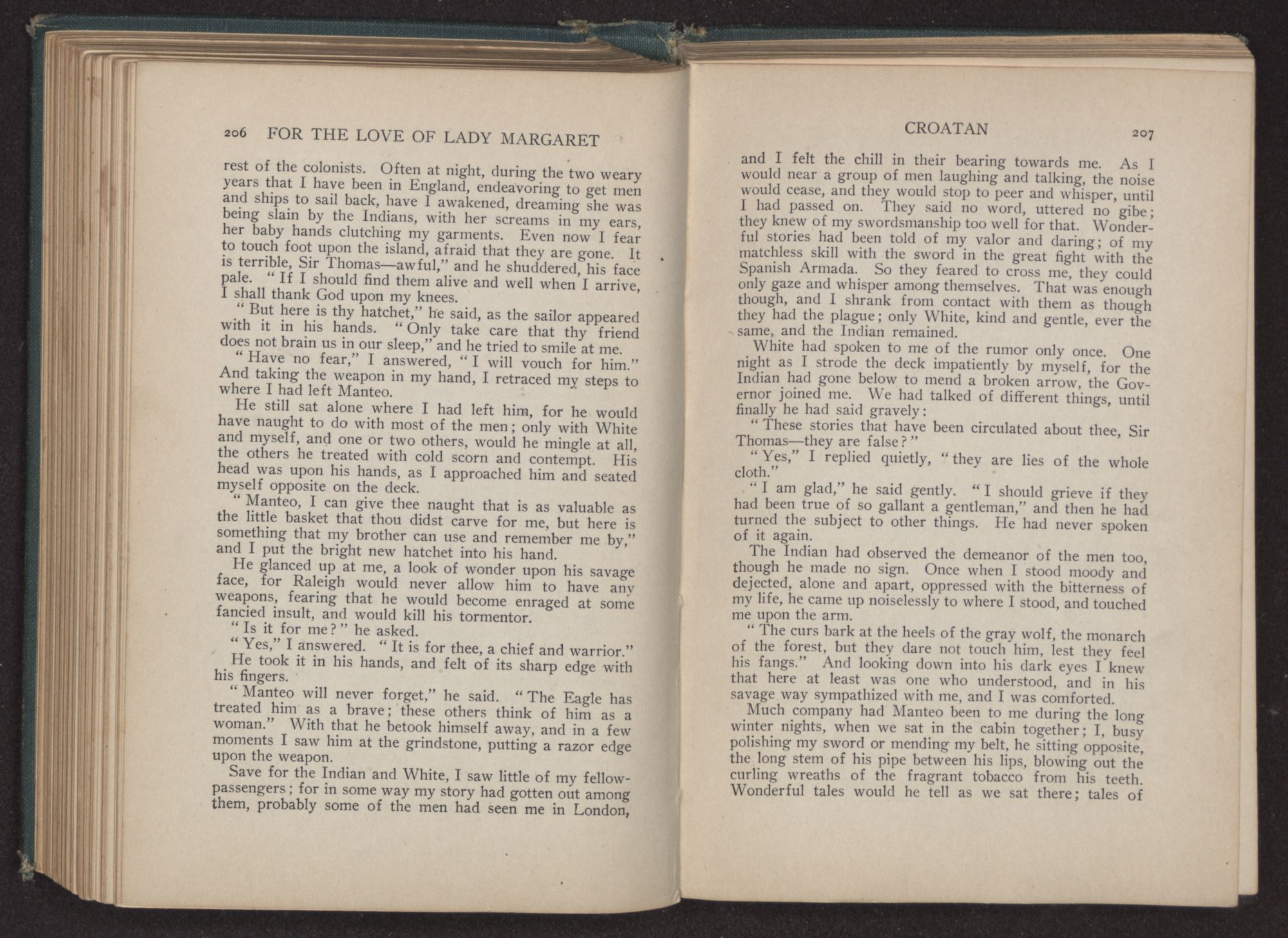 Margaret had taken a little gold pin from her dress, and held it out to the Indian. “Keep it, Manteo,” she said. “Do not forget me. And shouldst thou ever come to England, I shall be proud to entertain thee.”