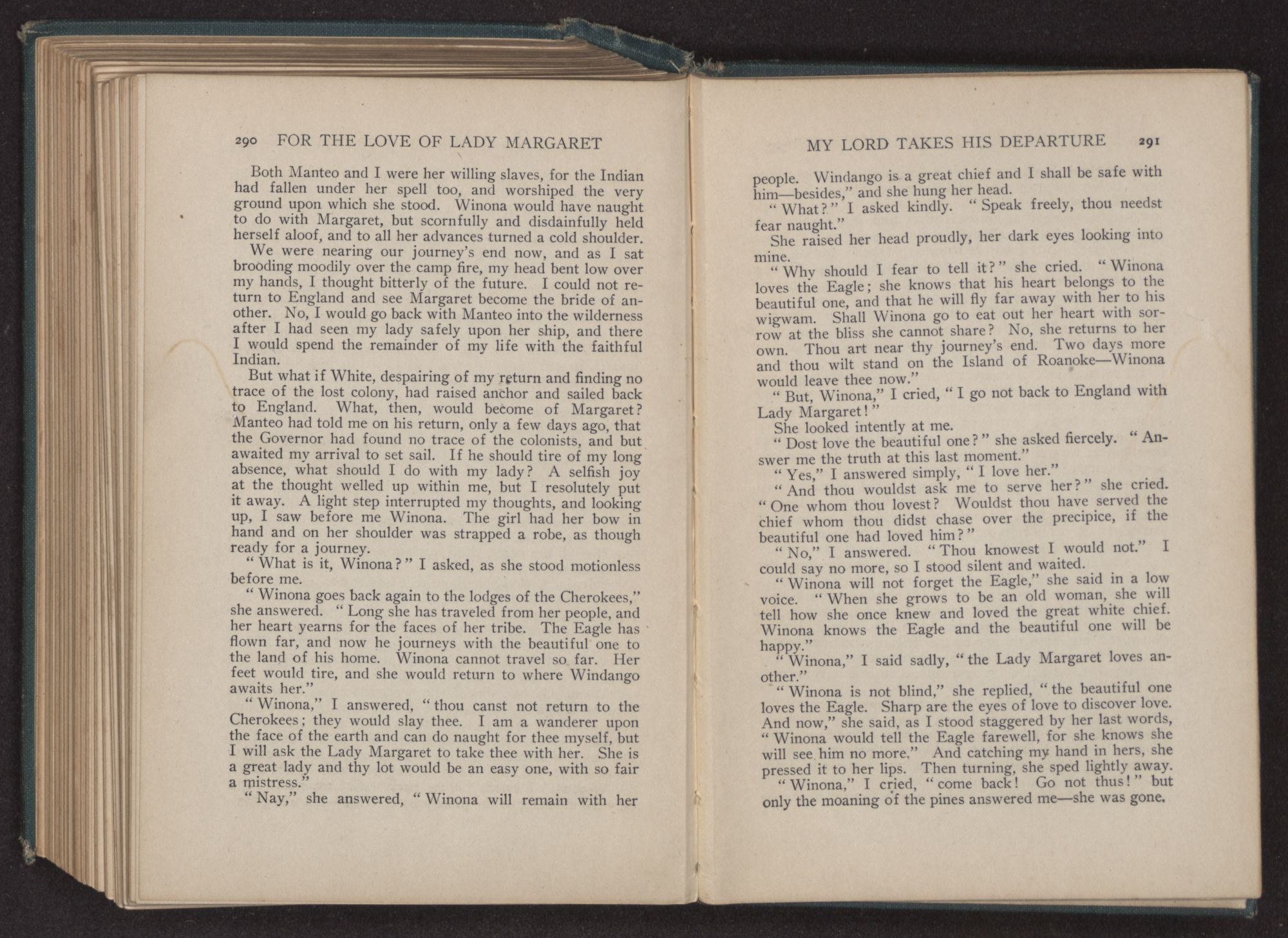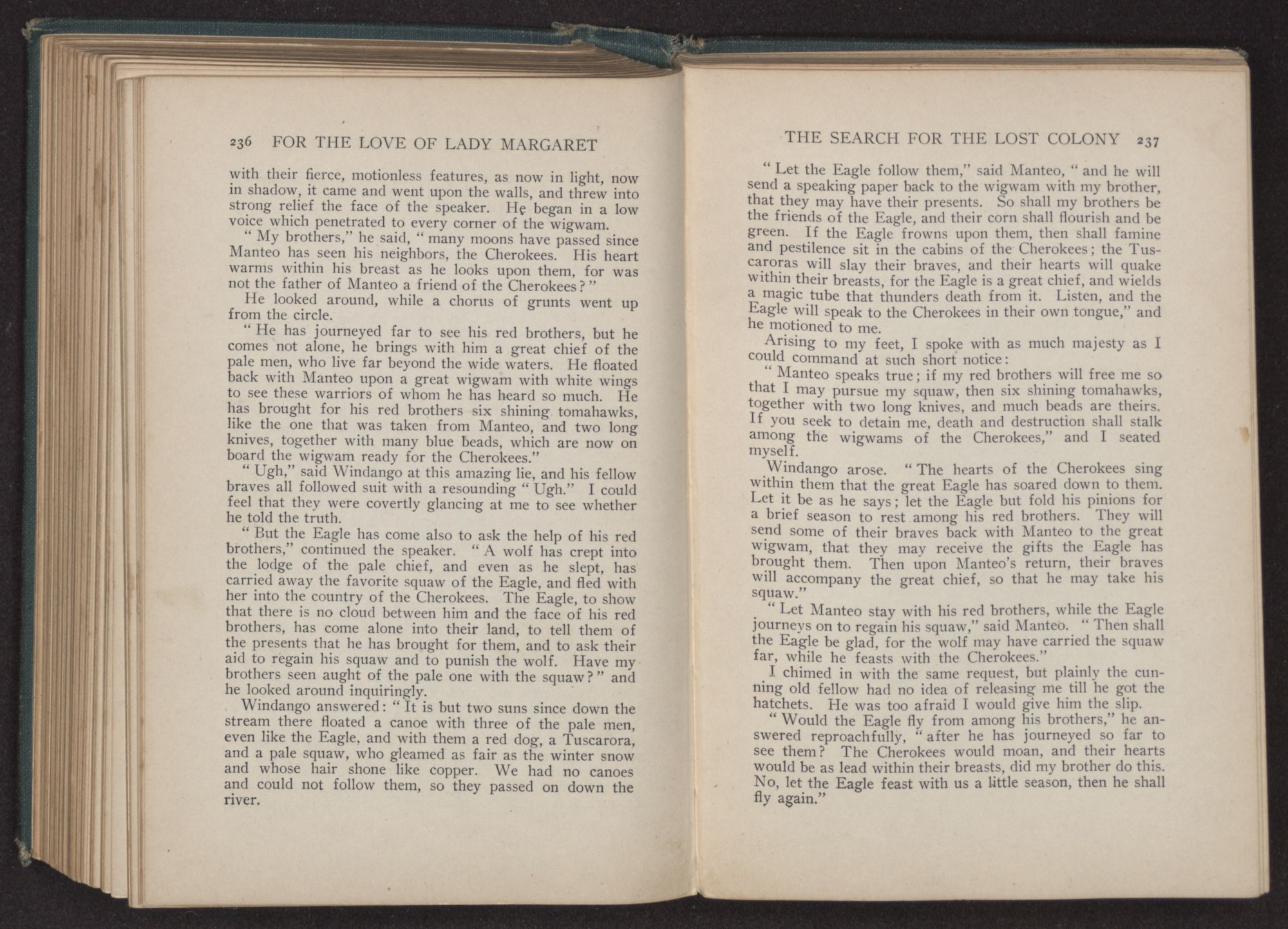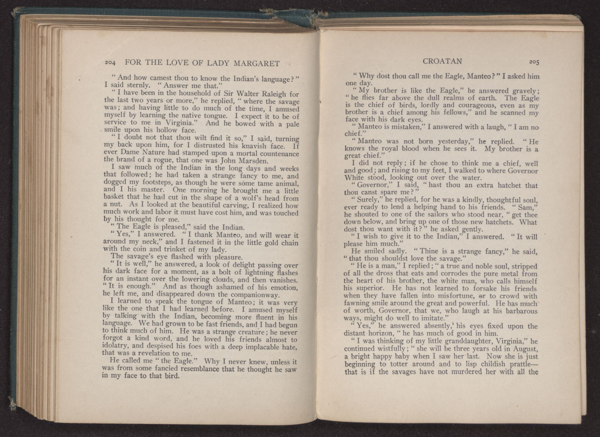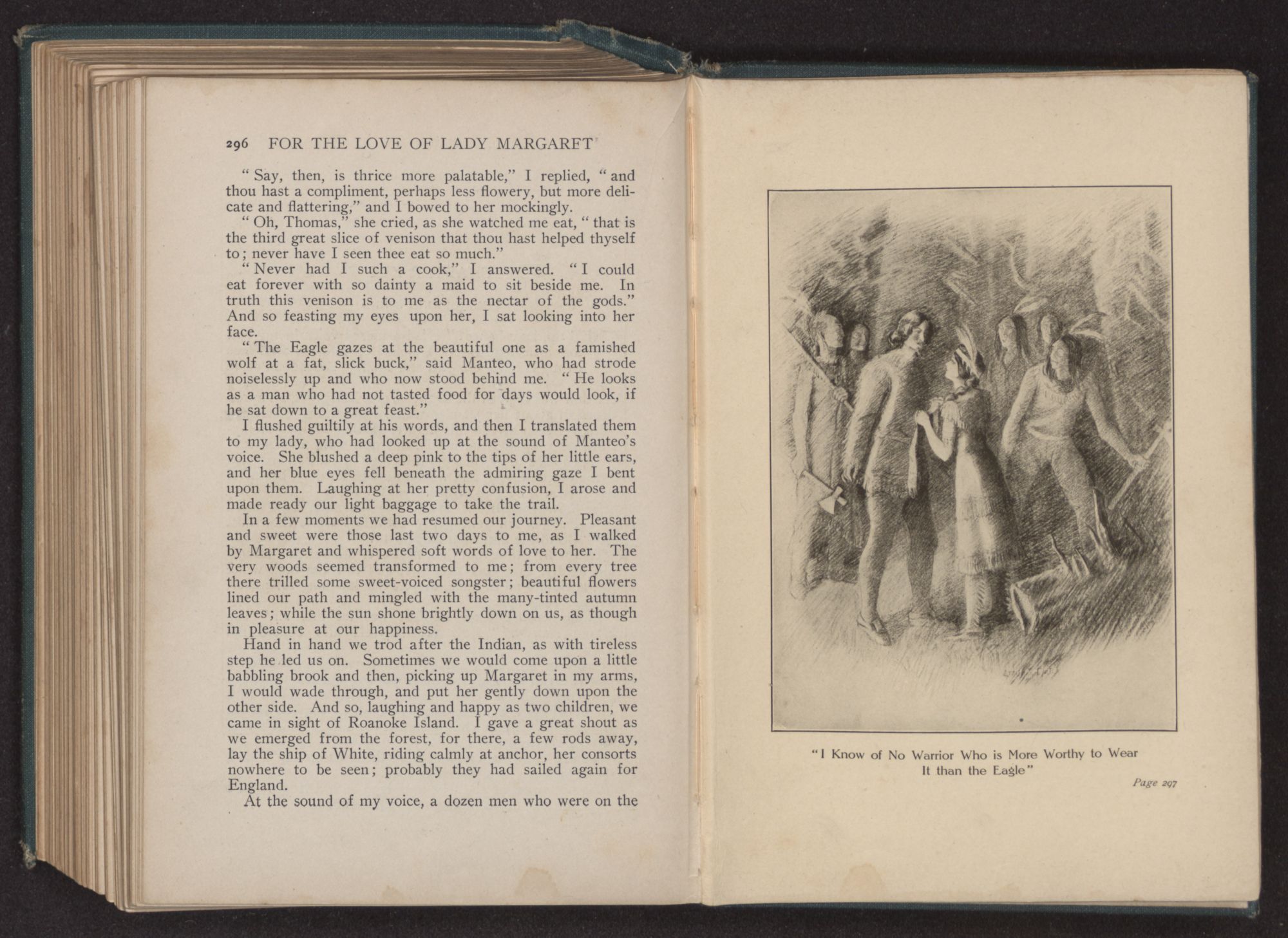 “The Eagle and the beautiful one will in a few moments be upon the breast of the great water,” he said. “Manteo would say farewell to them before they go. He is glad that the beautiful one will be with the Eagle in his tepee, to cheer him when Manteo is gone.”
