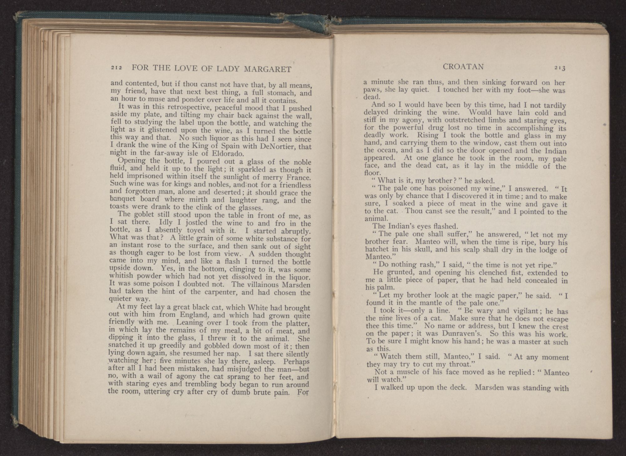 With another loud cry, the assailant made a hasty pass at me, and we closed. Even in the moonlight I was struck with the unusual beauty of the face—its long aquiline nose, and keen hawk eyes. The hat had fallen from his head, and his jet black hair shone like the wing of a raven.