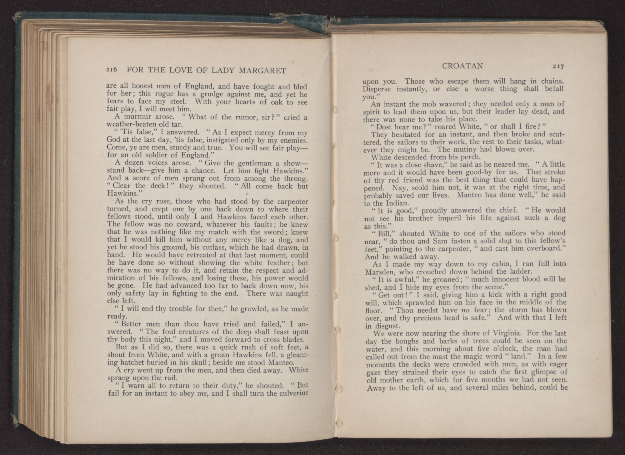 “Take this sword,” I said in a husky voice, “and when thou drawest it, Manteo, remember to whom it once belonged. Draw it not in an unworthy cause, nor sheath it in a just one; of all who have worn this blade, there has been none nobler and truer than thyself.”
