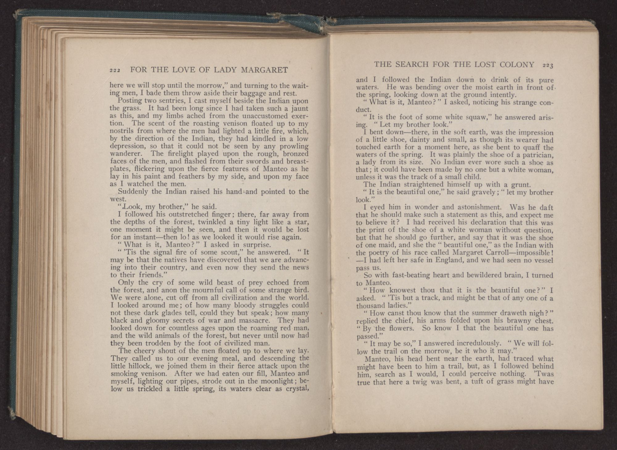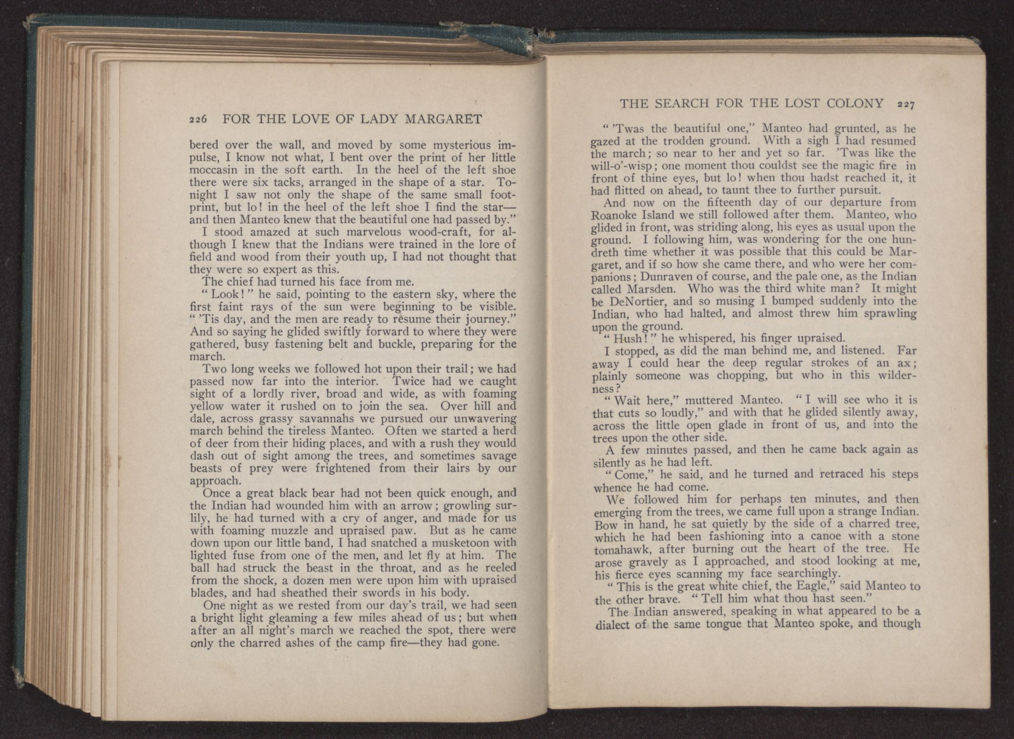 “The beautiful one is kind to Manteo,” he answered, “still he cannot go to that far land. Manteo first saw the light in this wild land, and here he has lived; his heart loves its shadowy depths and waving trees; here came into being his father, and their bones molder away among its sighing pines.” And folding his robe about him he stood silent,