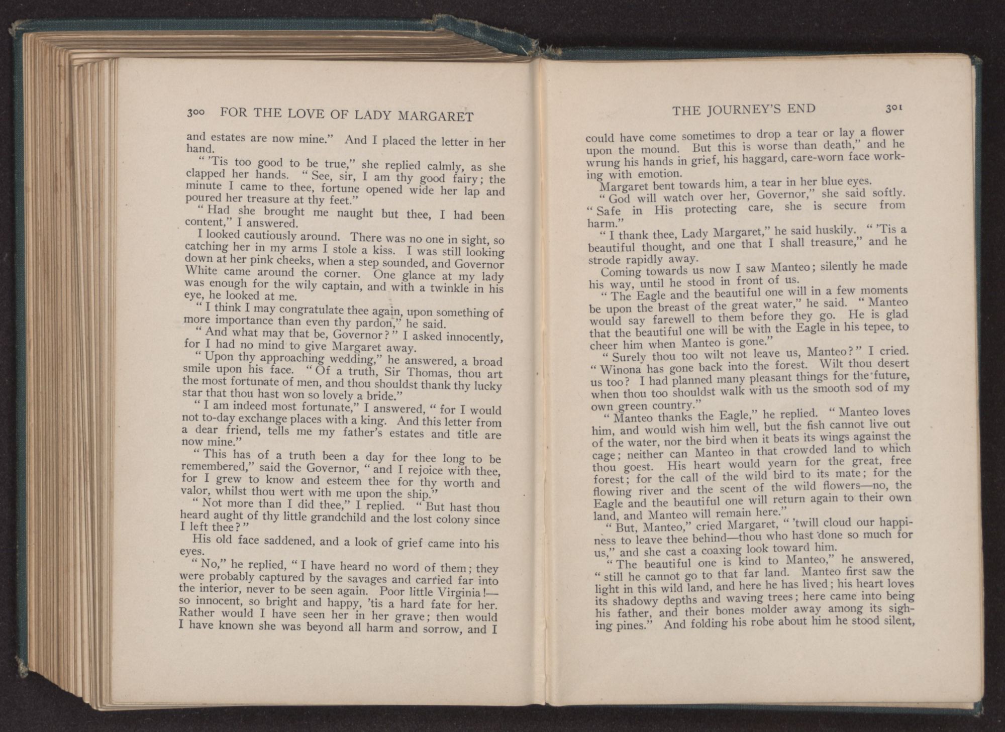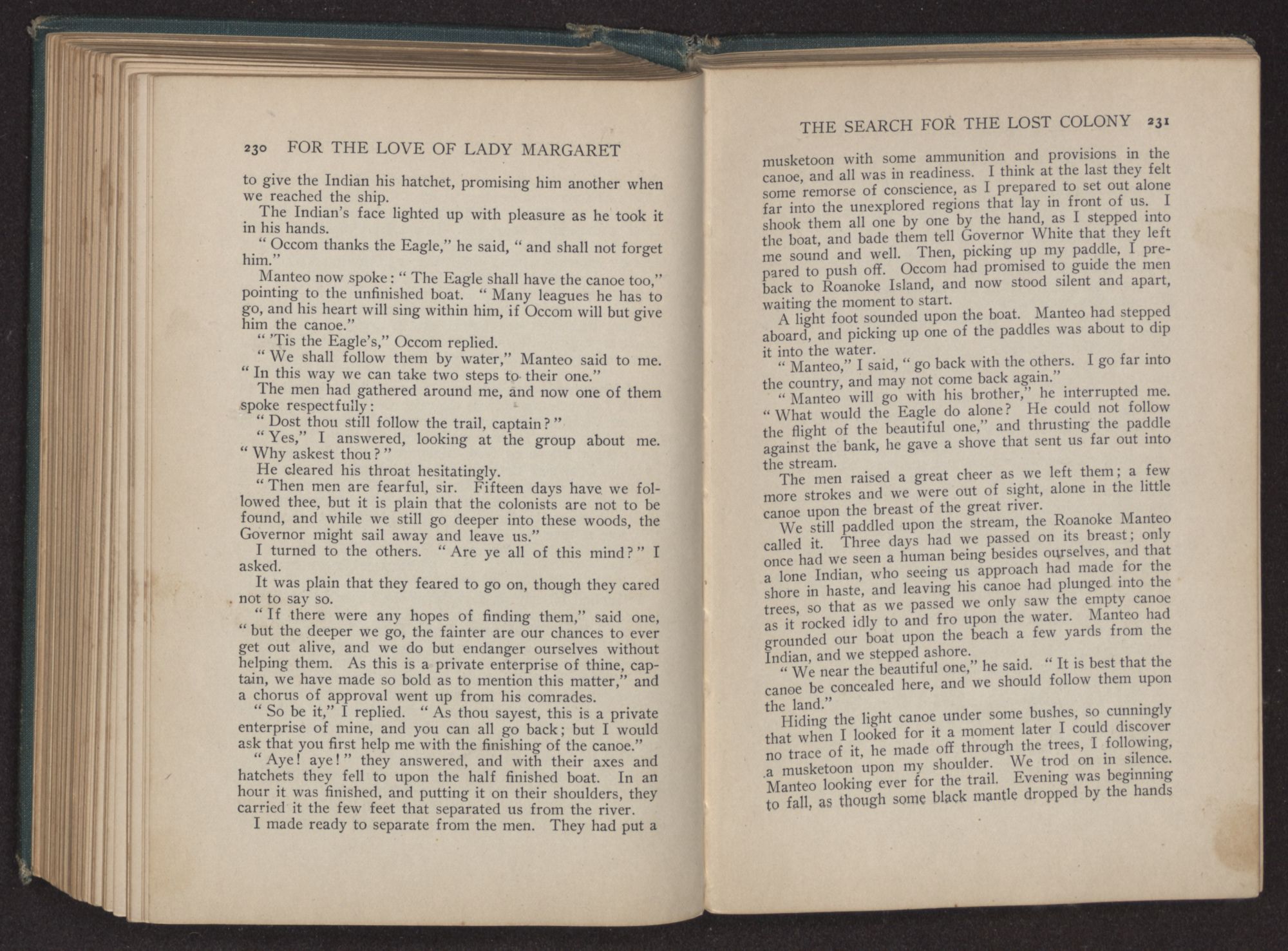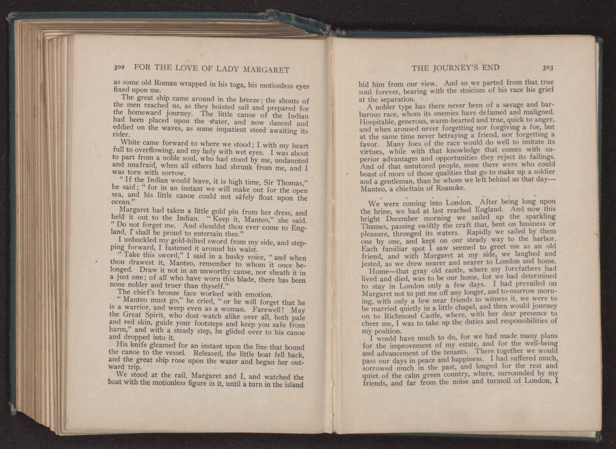 “But, Manteo,” cried Margaret, “’twill cloud our happiness to leave thee behind—thou who hast done so much for us,” and she cast a coaxing look toward him.