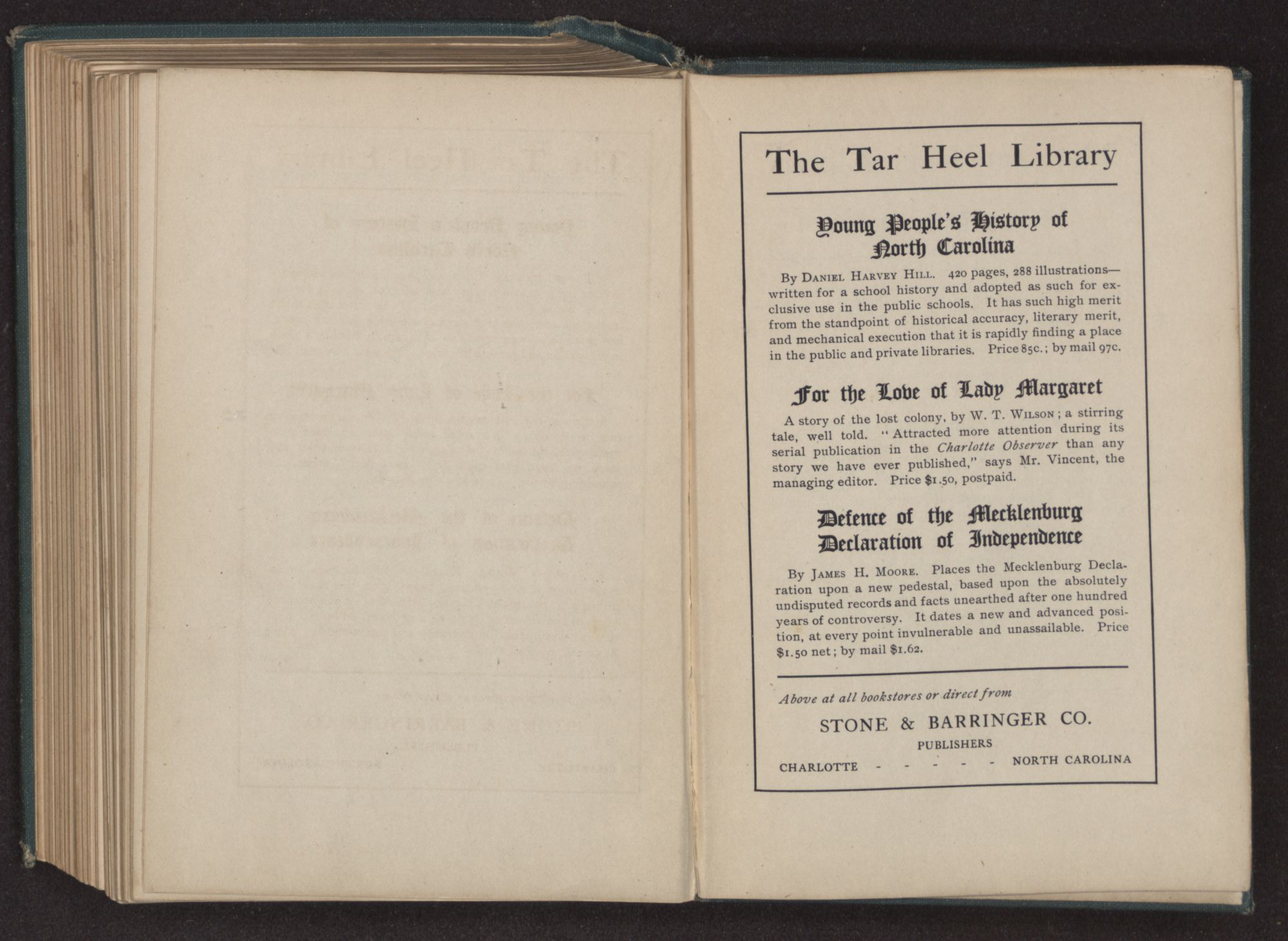 A story of the lost colony, by W. T. Wilson; a stirring tale, well told. “Attracted more attention during its serial publication in the Charlotte Observer than any story we have ever published,” says Mr. Vincent, the managing editor. Price $1.50, postpaid.