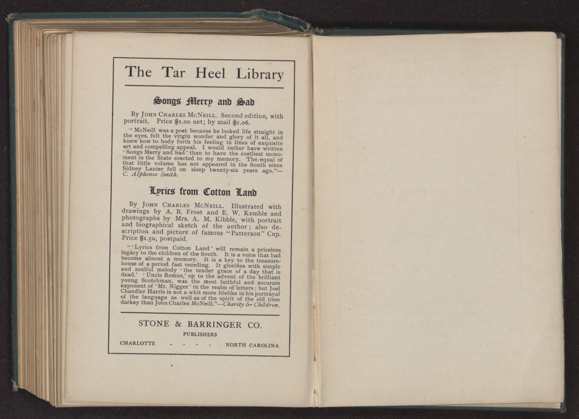 “ ‘Lyrics from Cotton Land’ will remain a priceless legacy to the children of the South. It is a voice that had become almost a memory. It is a key to the treasure-house of a period fast receding. It glorifies with simple and soulful melody ‘the tender grace of a day that is dead.’ ‘Uncle Remus,’ up to the advent of the brilliant young Scotchman, was the most faithful and accurate exponent of ‘Mr. Nigger’ in the realm of letters; but Joel Chandler Harris is not a whit more lifelike in his portrayal of the language as well as of the spirit of the old time darkey than John Charles McNeill.”—Charity & Children.