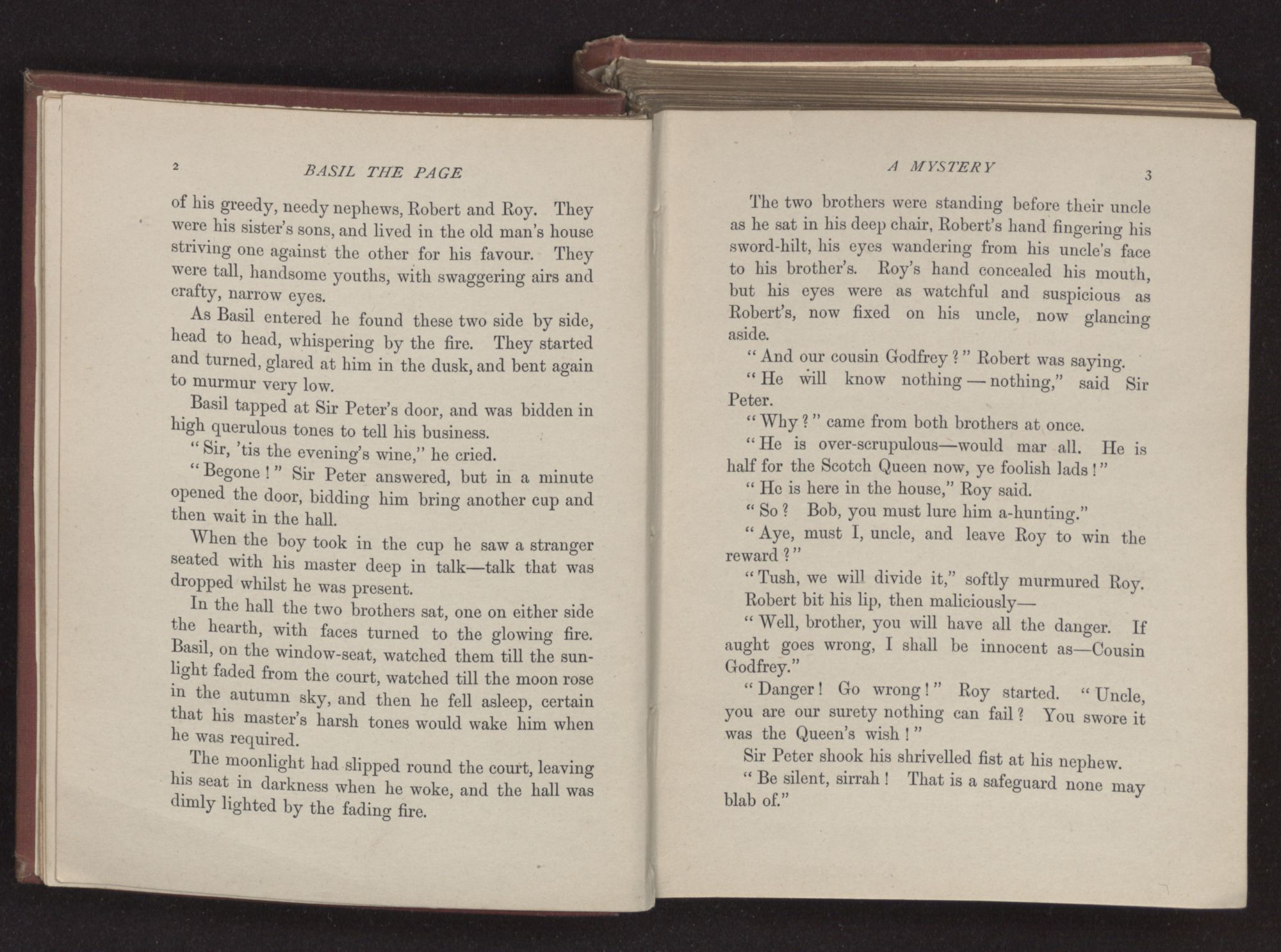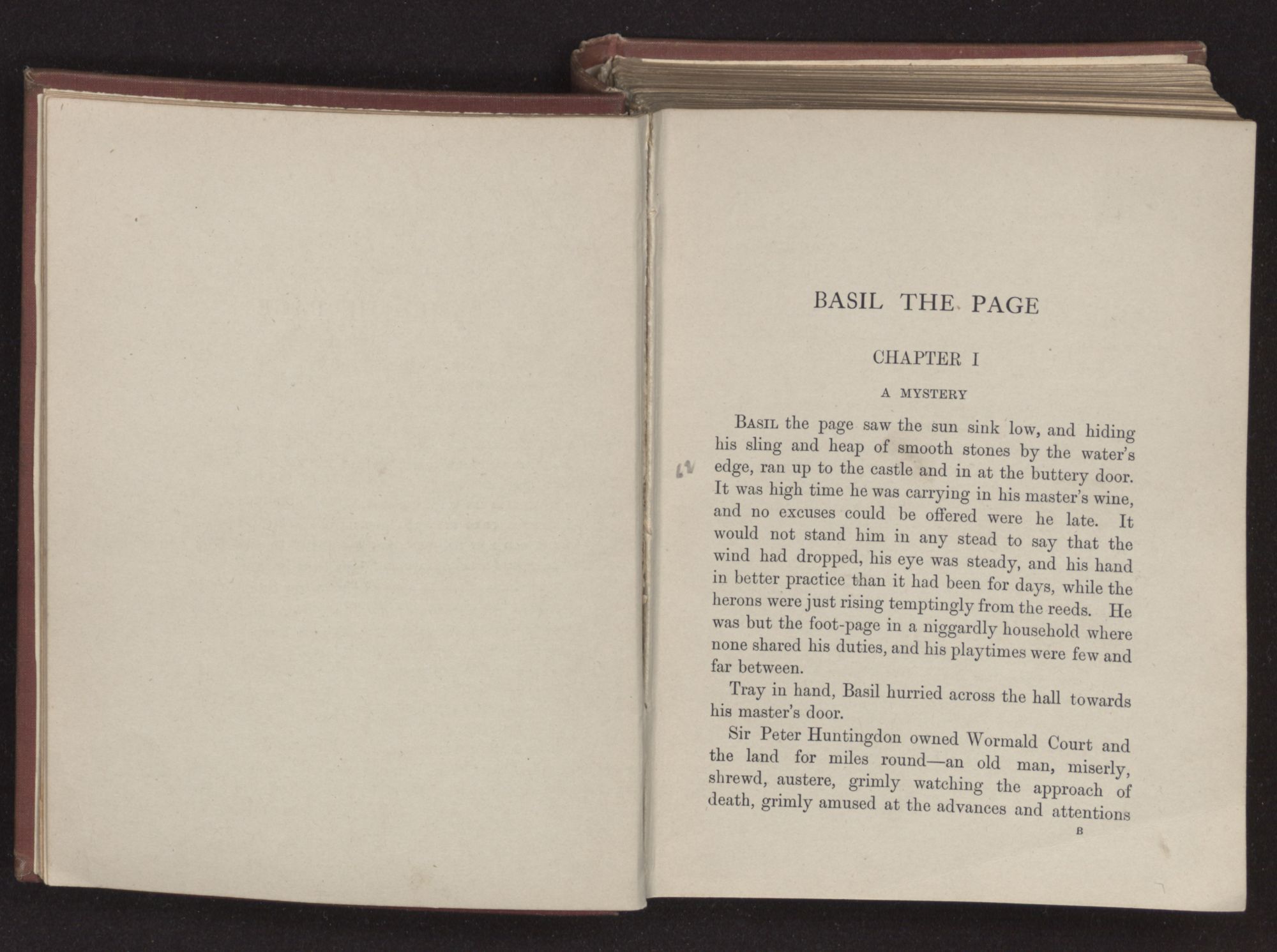 CHAPTER I A MYSTERYBasil the page saw the sun sink low, and hiding his sling and heap of smooth stones by the water's edge, ran up to the castle and in at the buttery door. It was high time he was carrying in his master's wine, and no excuses could be offered were he late. It would not stand him in any stead to say that the wind had dropped, his eye was steady, and his hand in better practice than it had been for days, while the herons were just rising temptingly from the reeds. He was but the foot-page in a niggardly household where none shared his duties, and his playtimes were few and far between.
