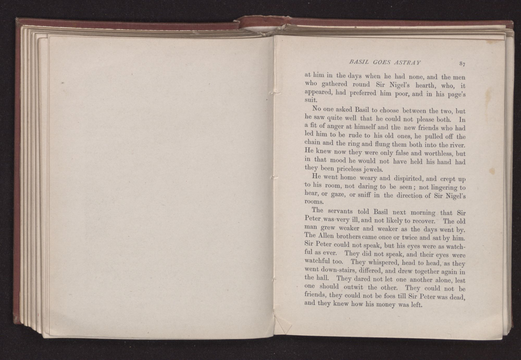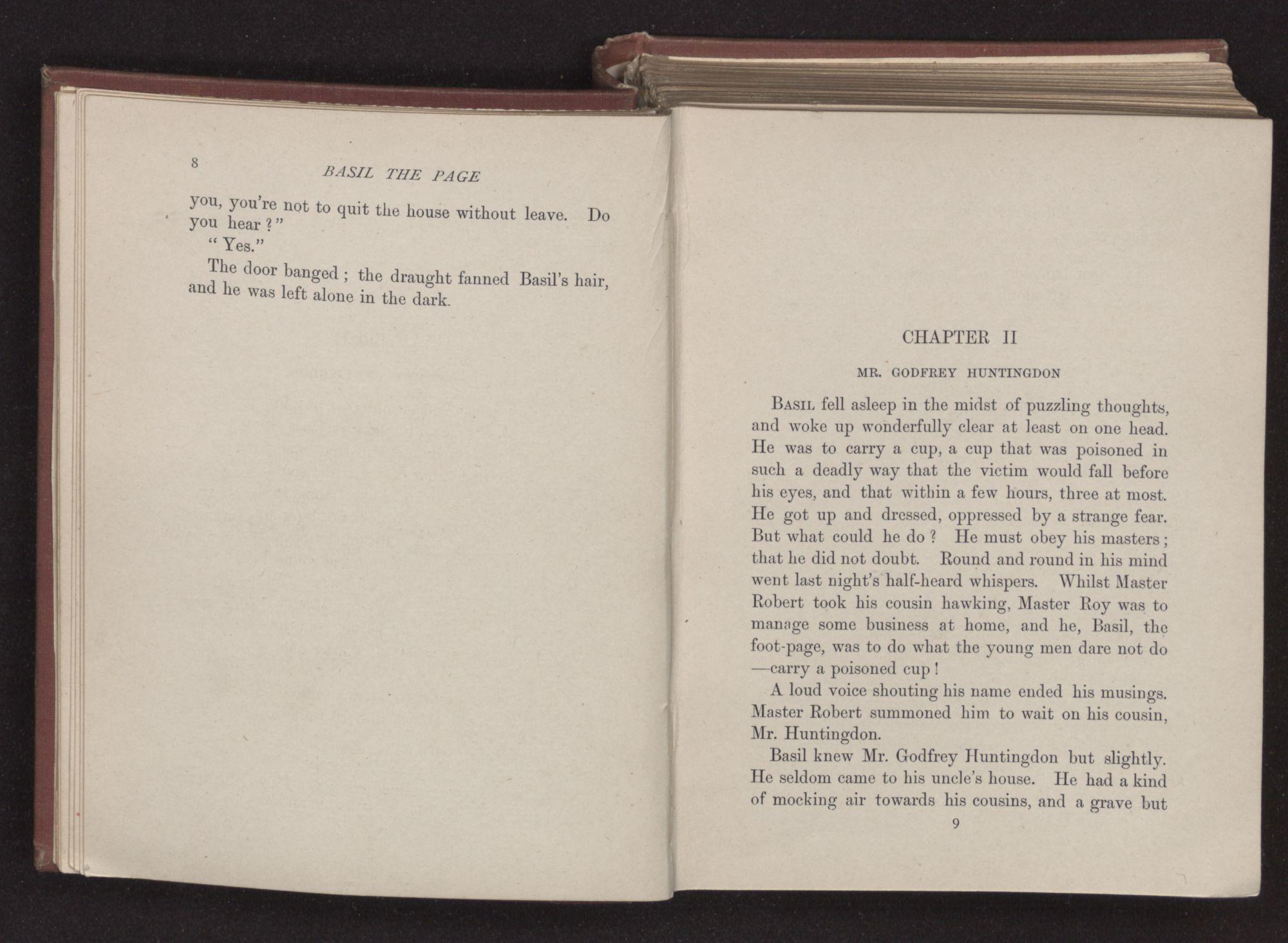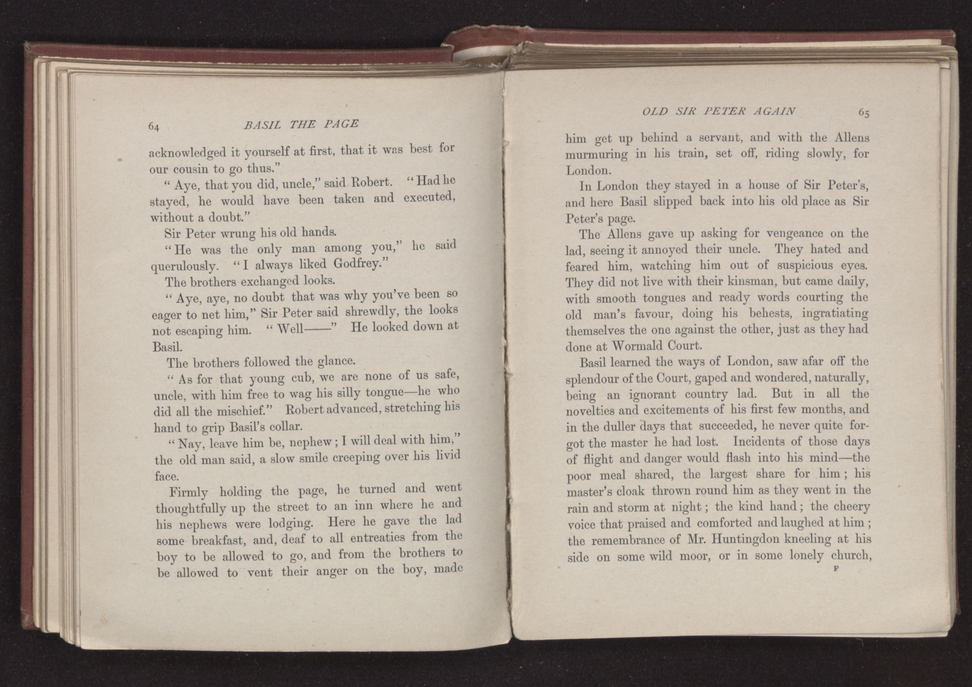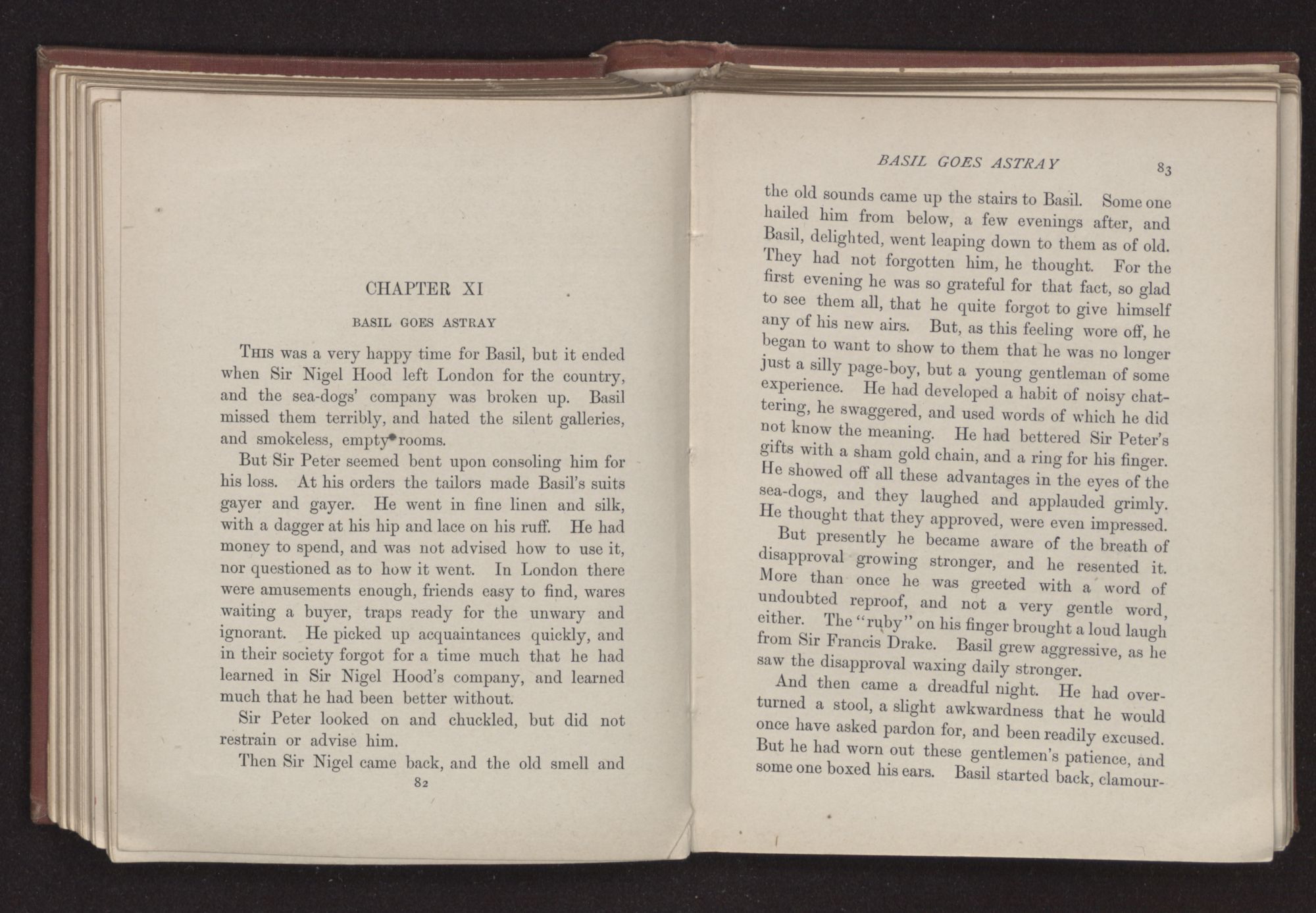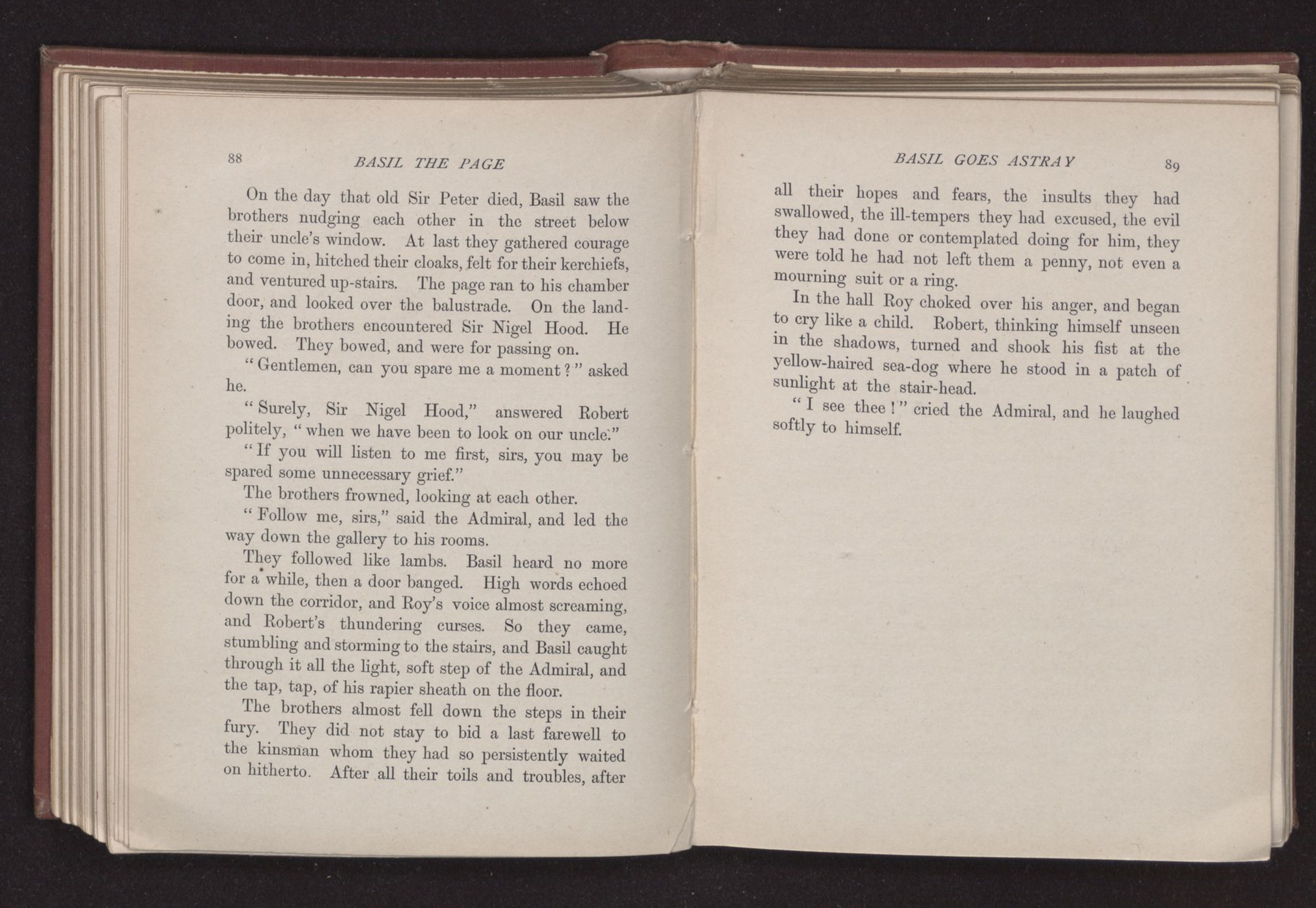 Basil stayed for no more, but slipped out by Sir Peter's door, through the corridor, and up dark passages and crooked stairs to the little chamber where he slept. He shook himself out of his clothes and scrambled into bed.