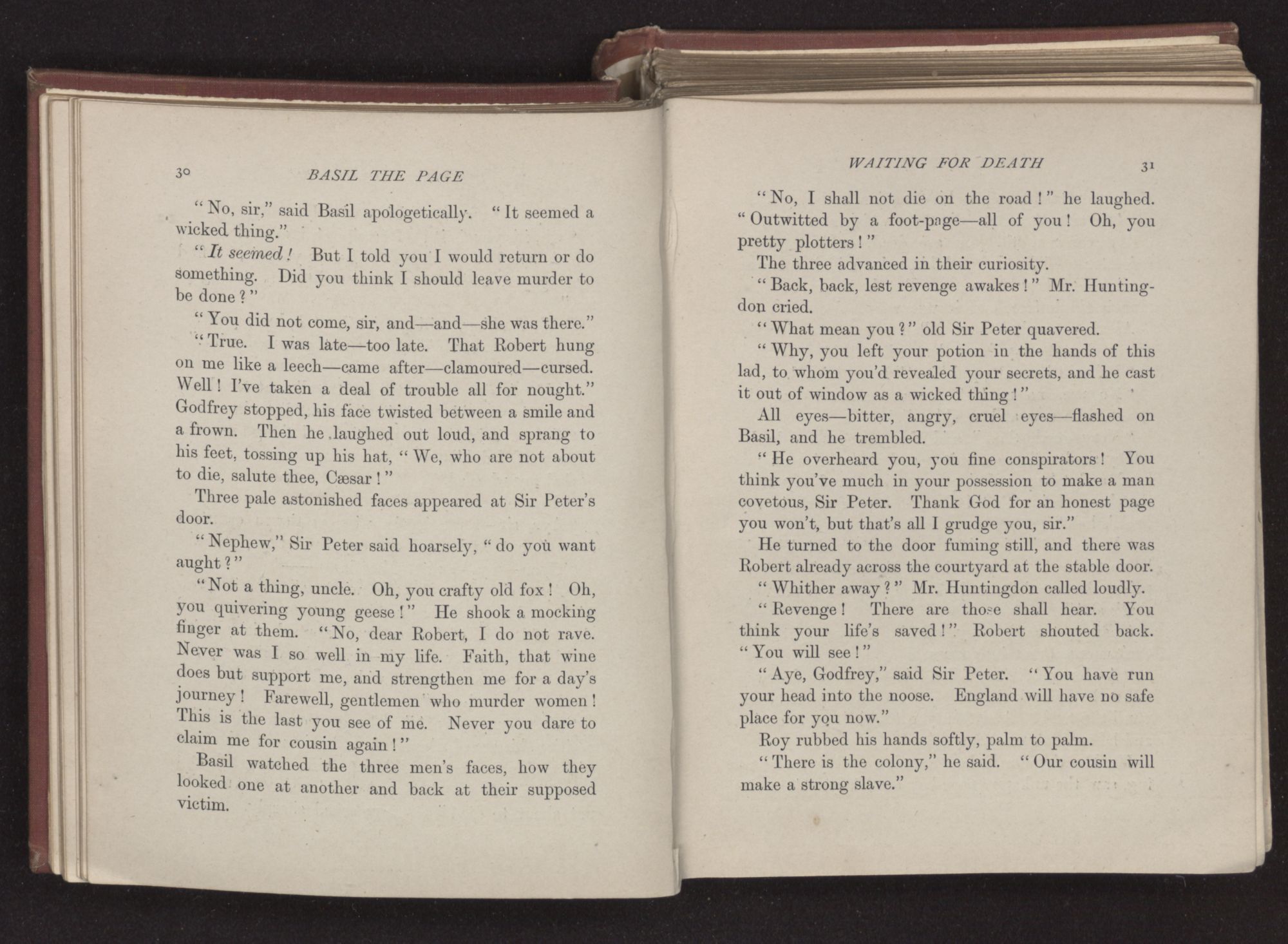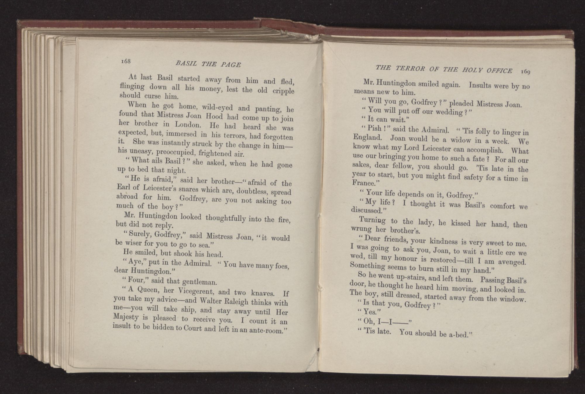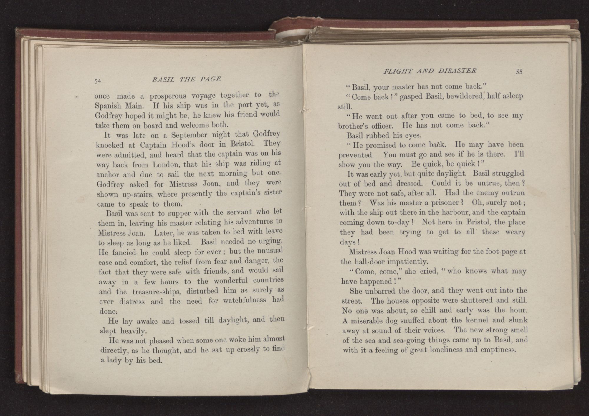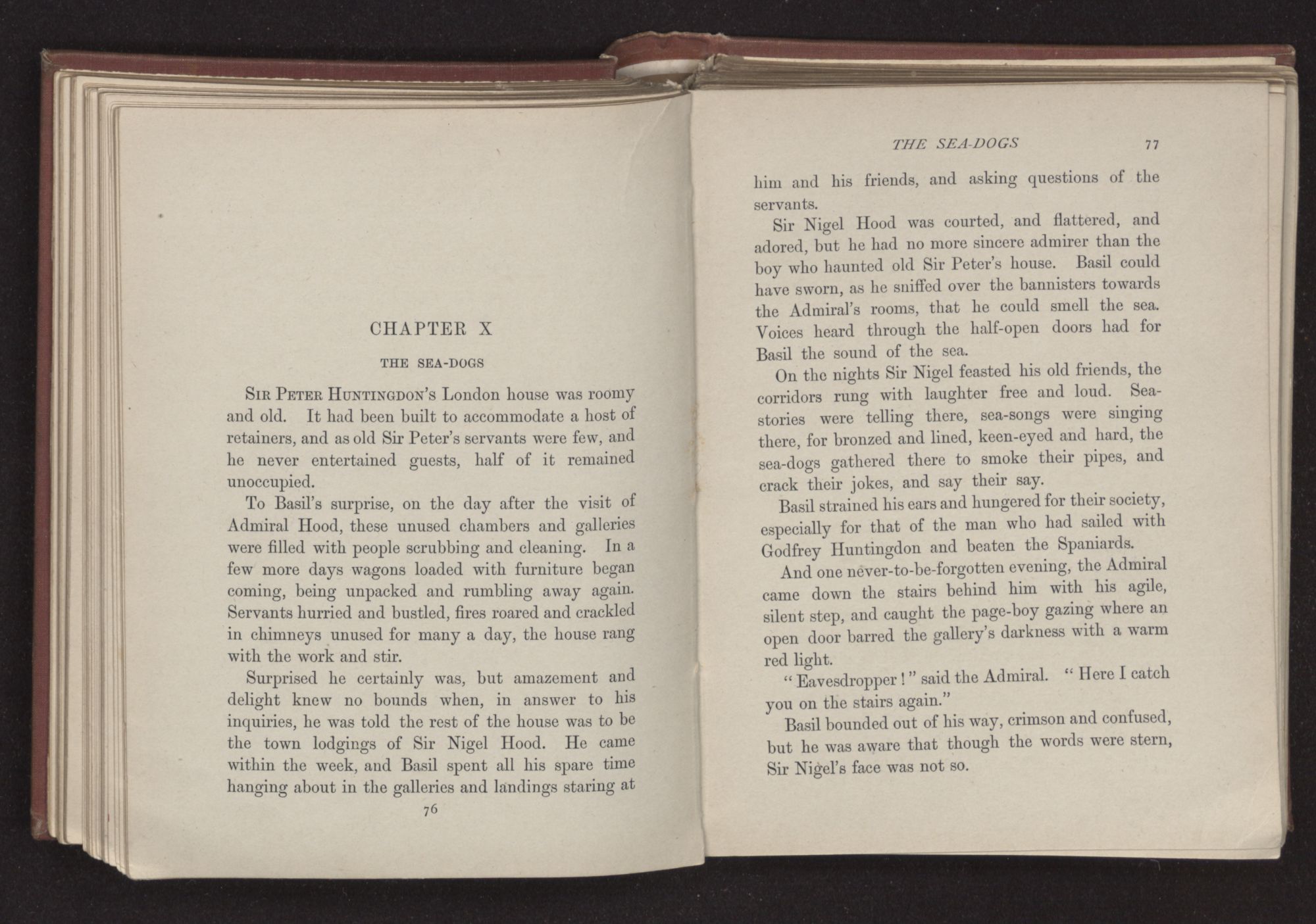 Basil stayed for no more, but slipped out by Sir Peter's door, through the corridor, and up dark passages and crooked stairs to the little chamber where he slept. He shook himself out of his clothes and scrambled into bed.