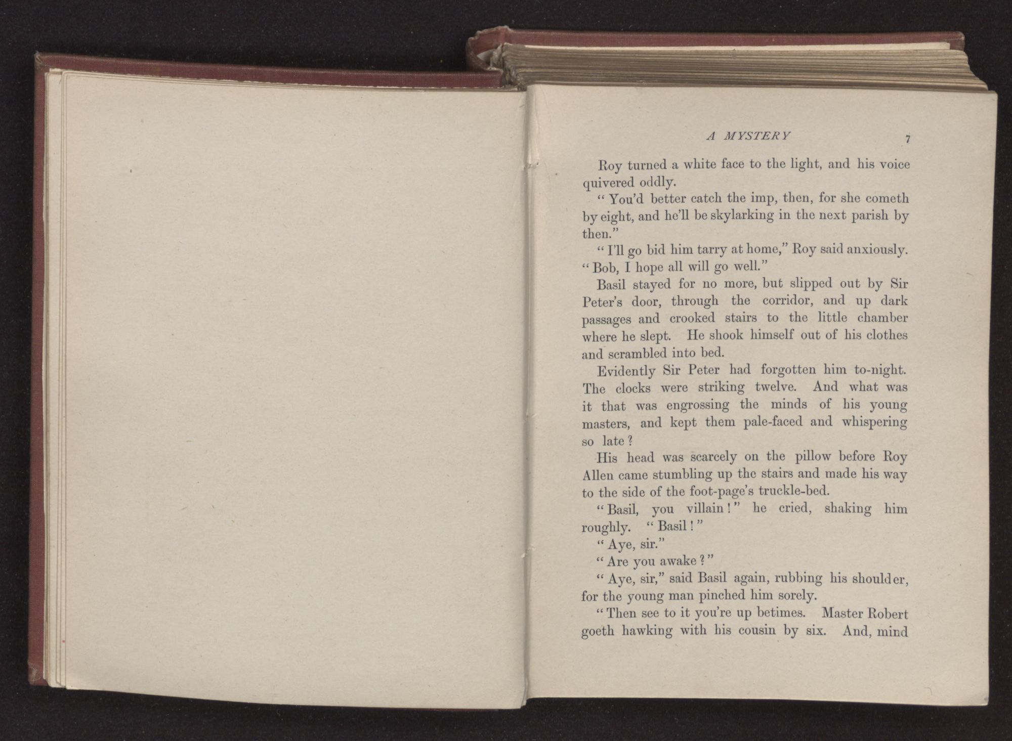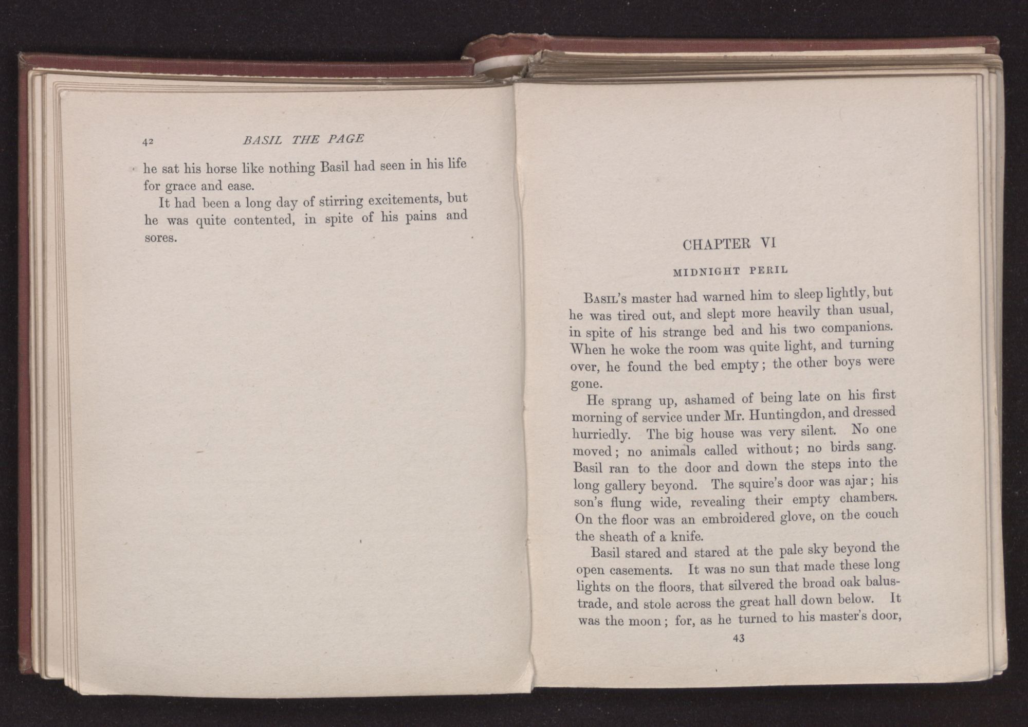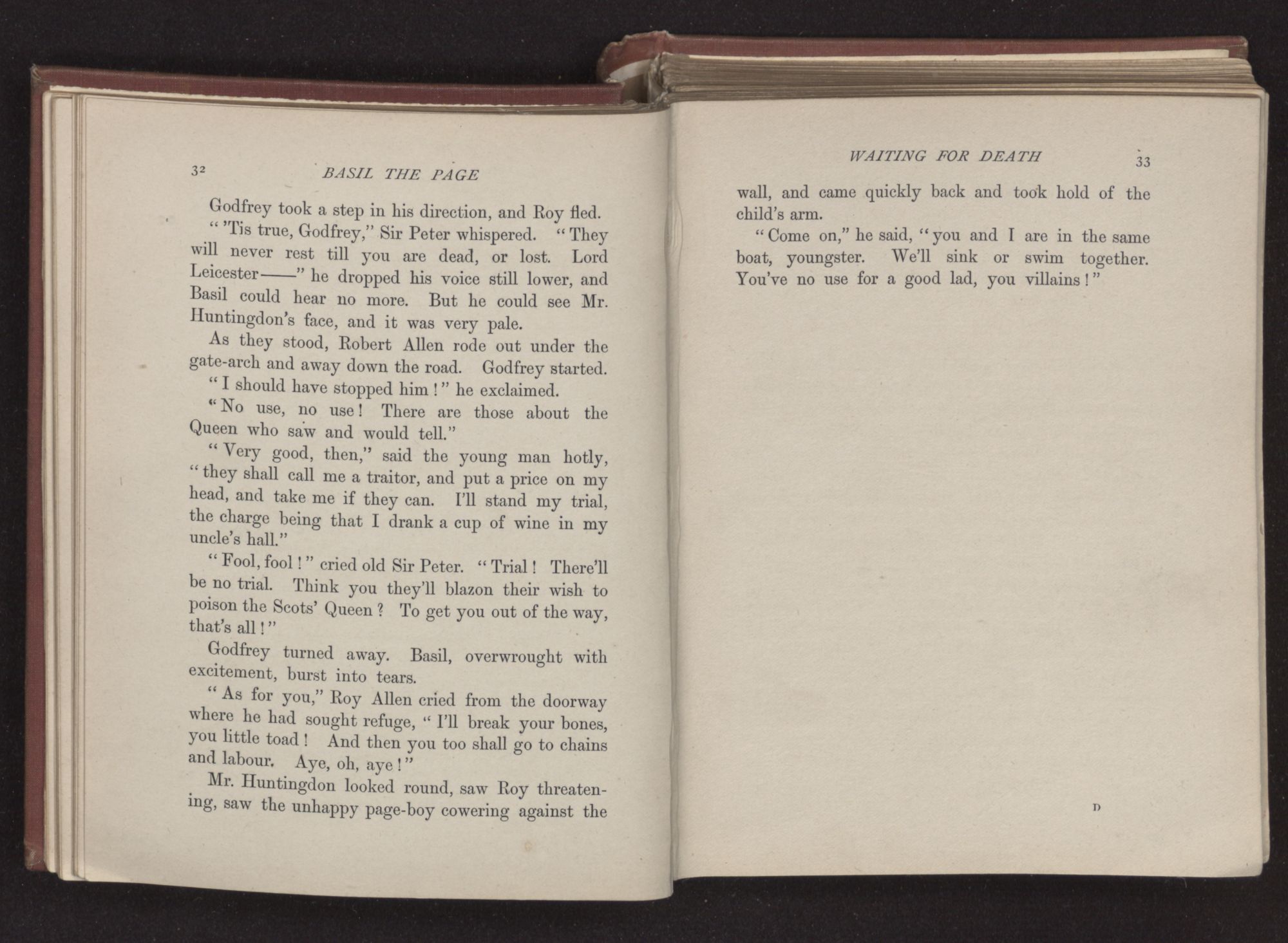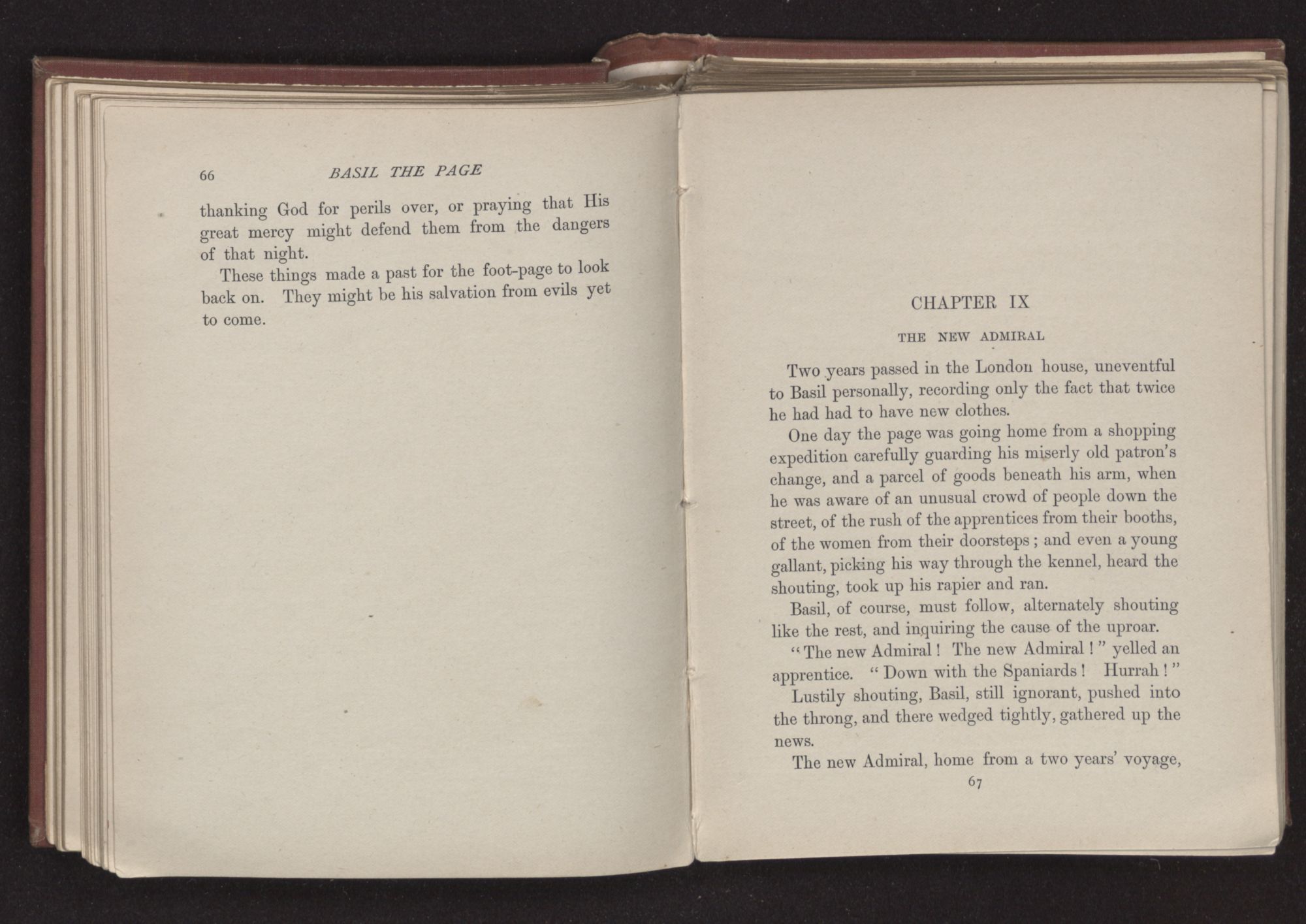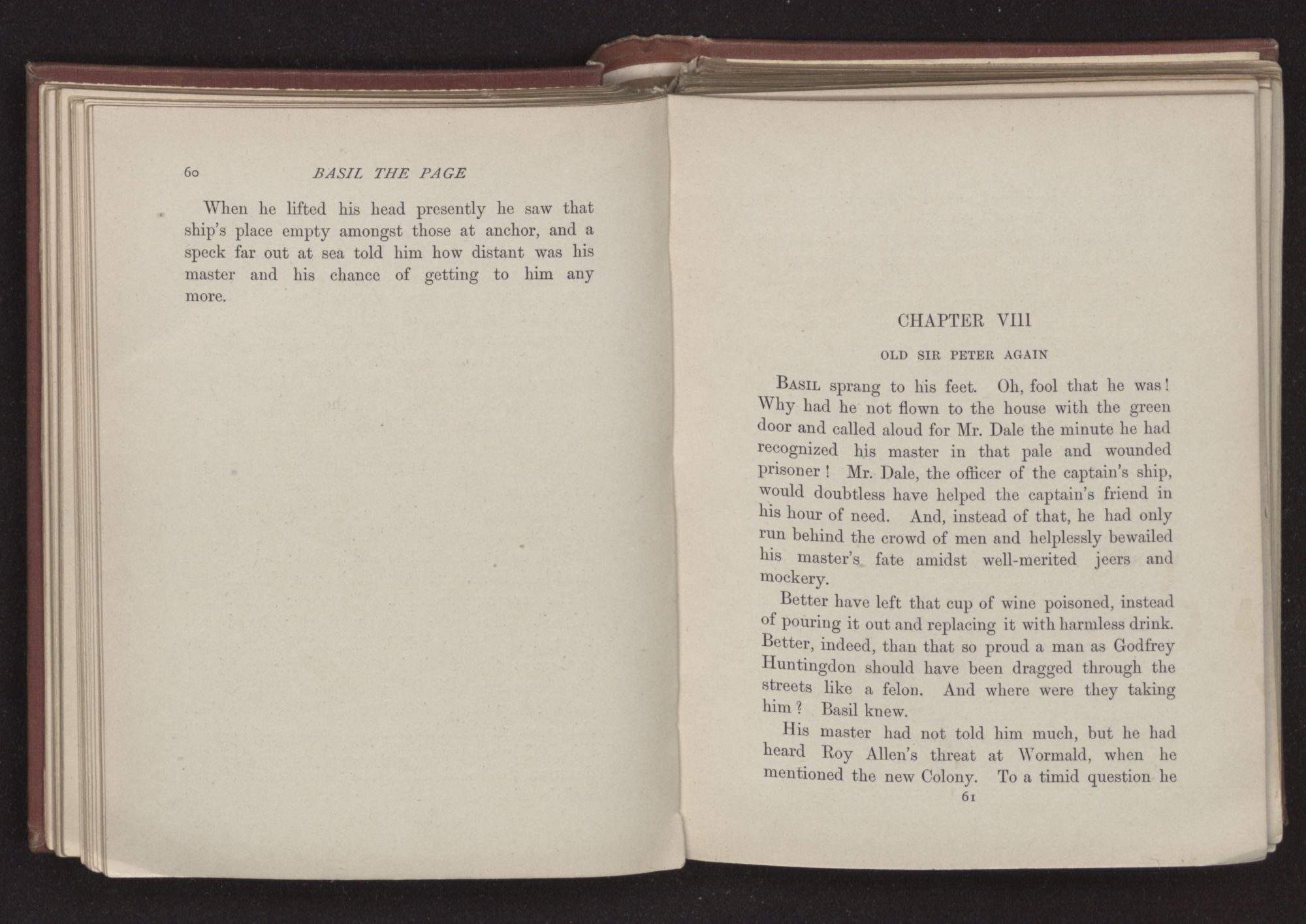 Basil stayed for no more, but slipped out by Sir Peter's door, through the corridor, and up dark passages and crooked stairs to the little chamber where he slept. He shook himself out of his clothes and scrambled into bed.