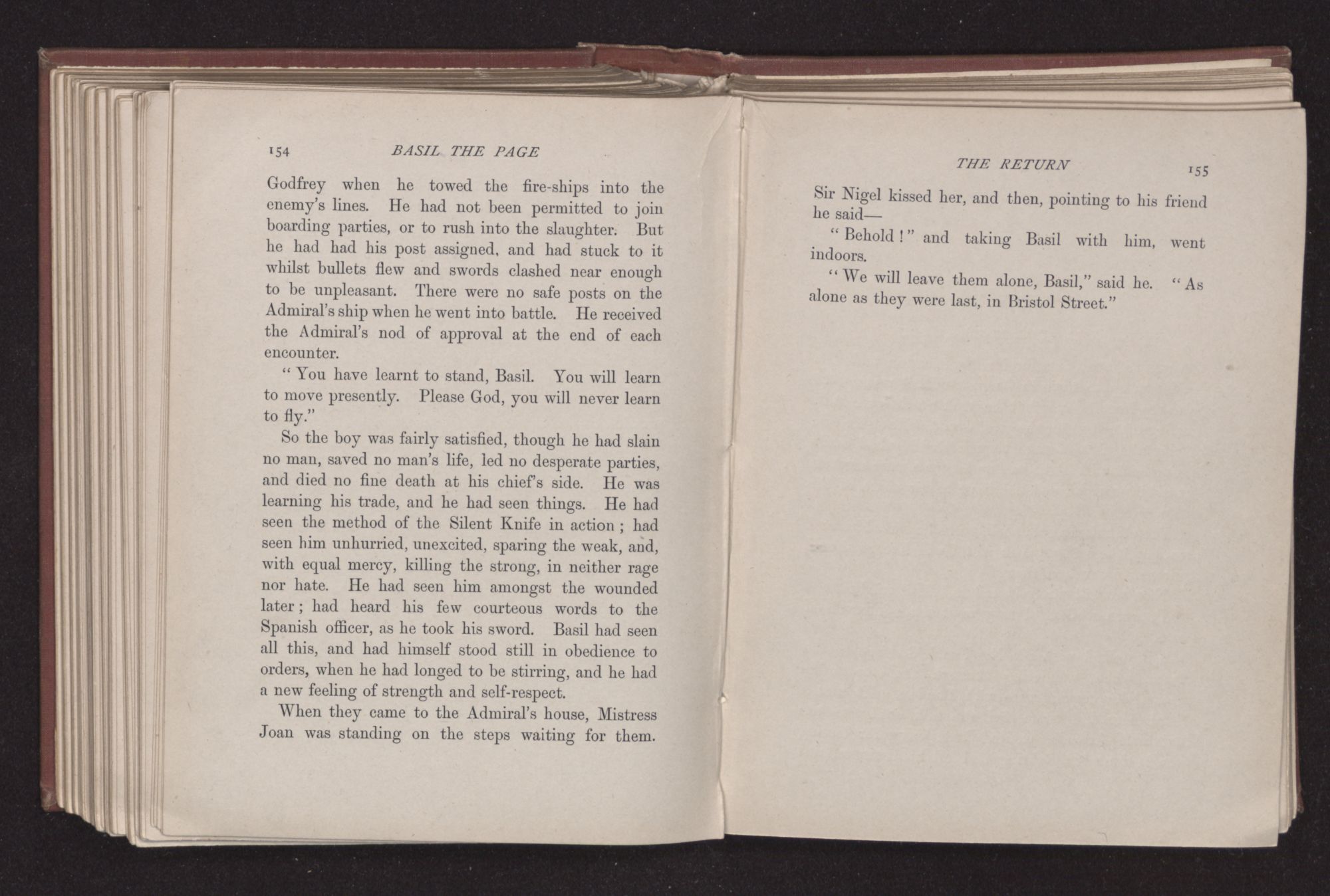 Then Sir Nigel got up, and patting the boy's shoulder with a cheery, “Well done, child! You'll sack your city yet,” he went out and left the two together.
