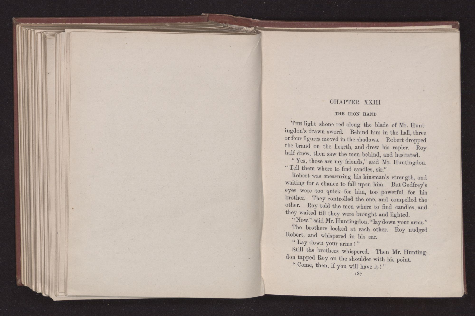 The two brothers were standing before their uncle as he sat in his deep chair, Robert's hand fingering his sword-hilt, his eyes wandering from his uncle's face to his brother's. Roy's hand concealed his mouth, but his eyes were as watchful and suspicious as Robert's, now fixed on his uncle, now glancing aside.