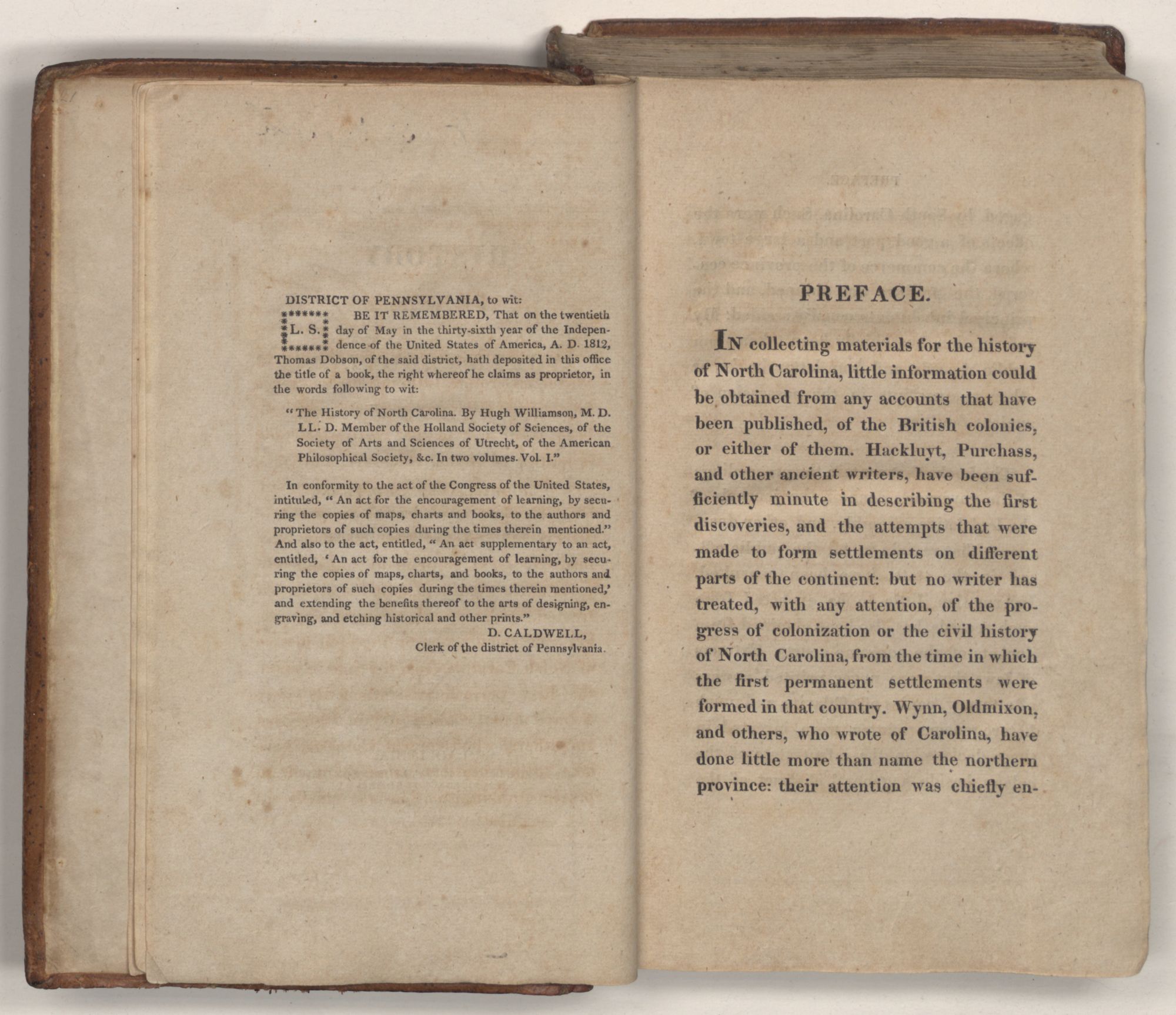 THE HISTORY OF NORTH CAROLINA.BY HUGH WILLIAMSON, M. D. LL. D. Member of the Holland Society of Sciences, of the Society of Arts and Sciences of Utrecht, of the American Philosophical Society, &c.IN TWO VOLUMES. VOL. I.PHILADELPHIA:PUBLISHED BY THOMAS DOBSON, AT THE STONE HOUSE NO. 41, SOUTH SECOND STREET. Fry and Kammerer, Printers.1812.