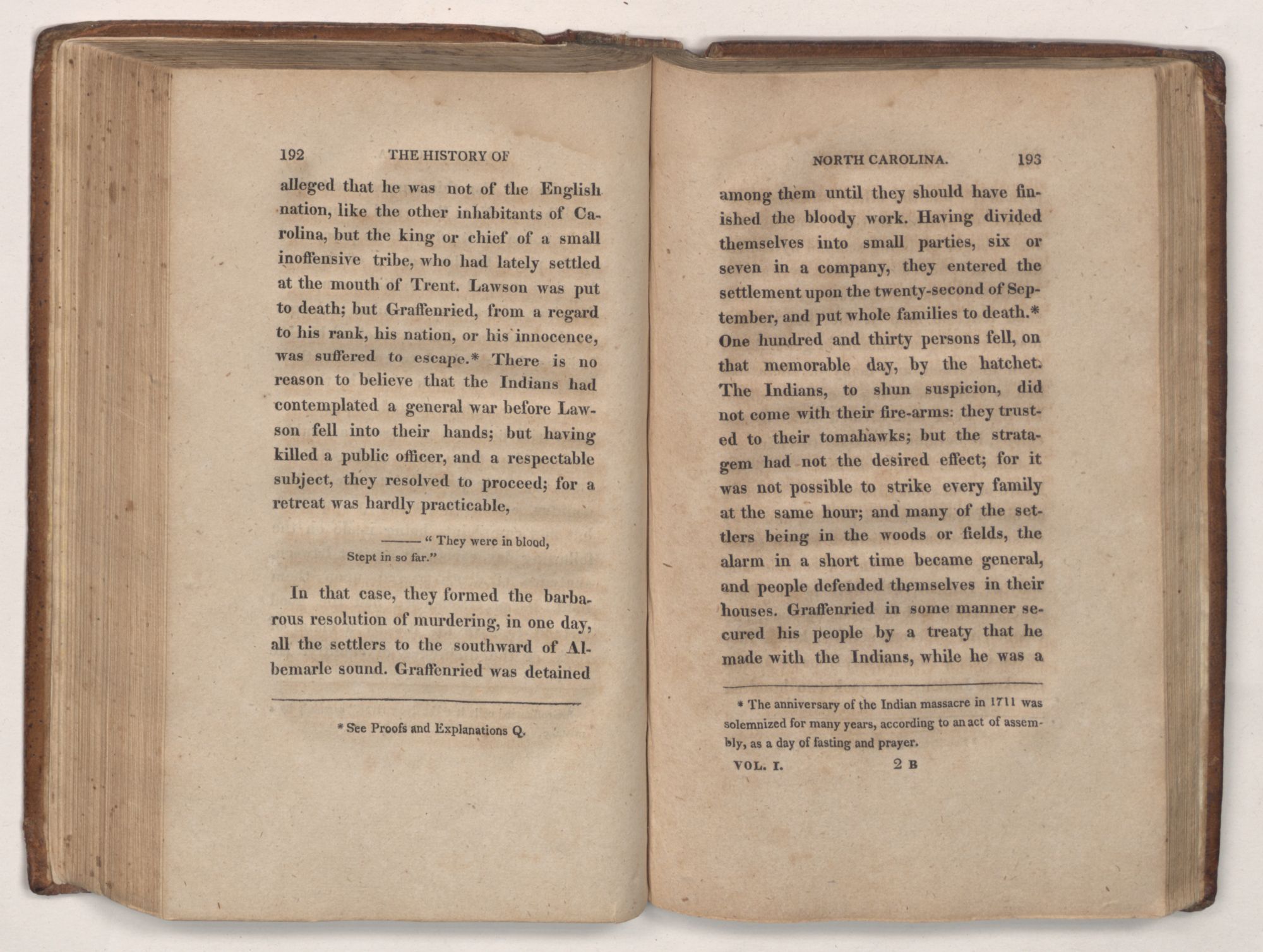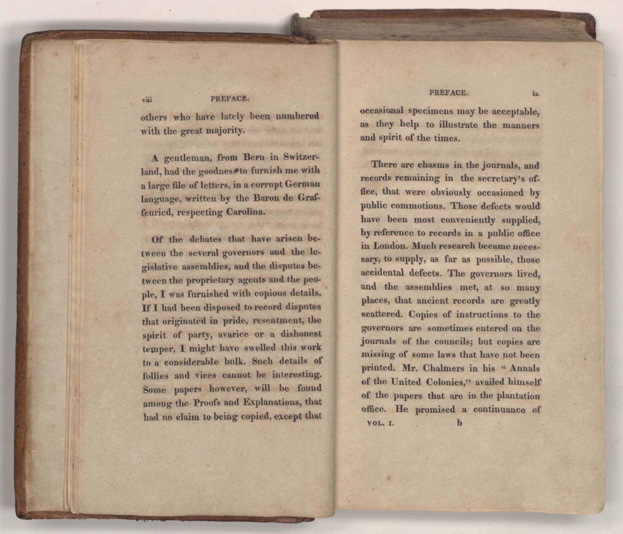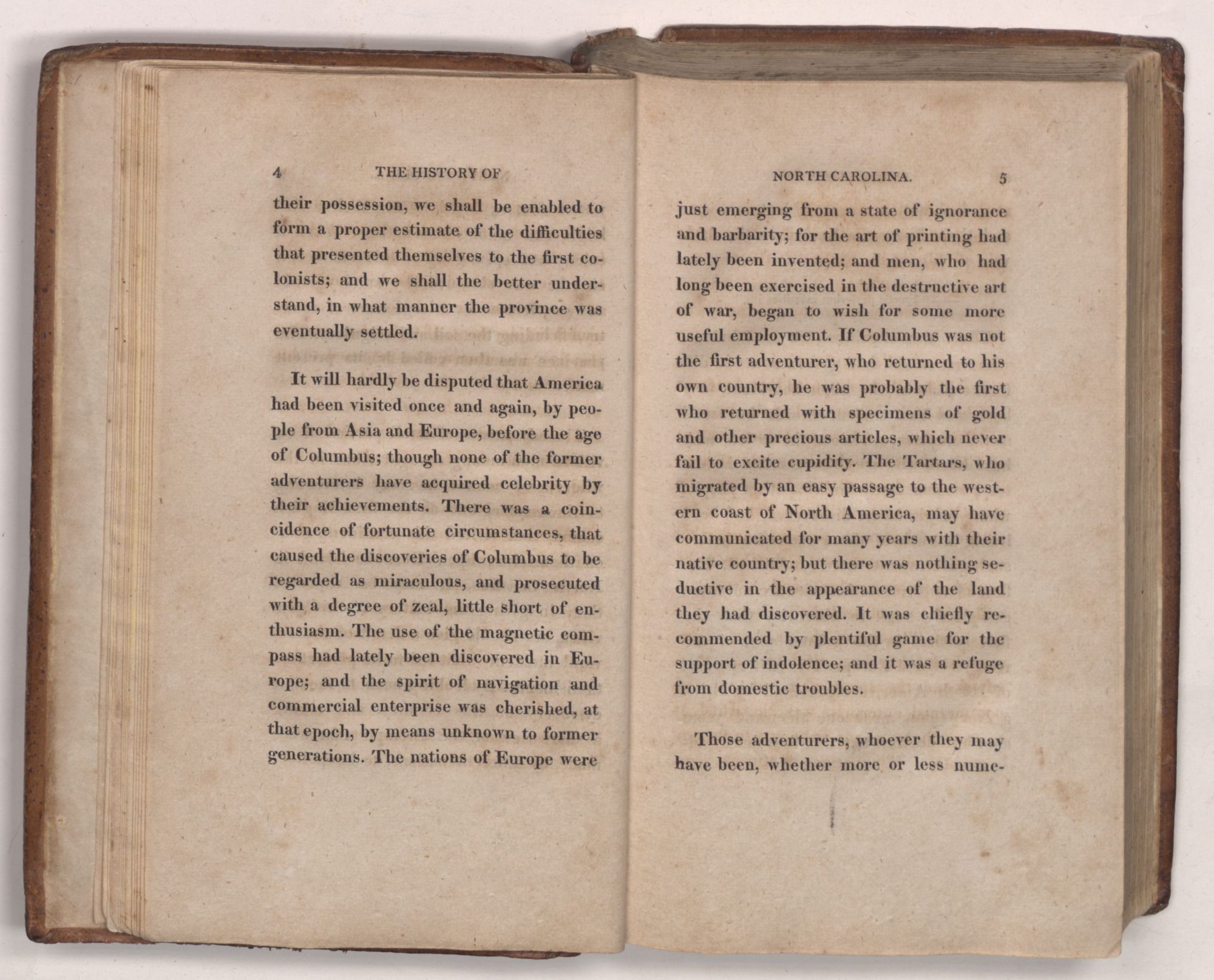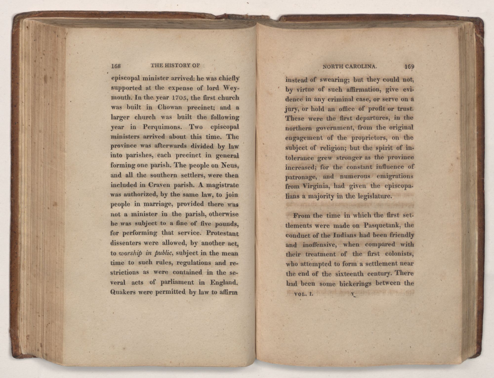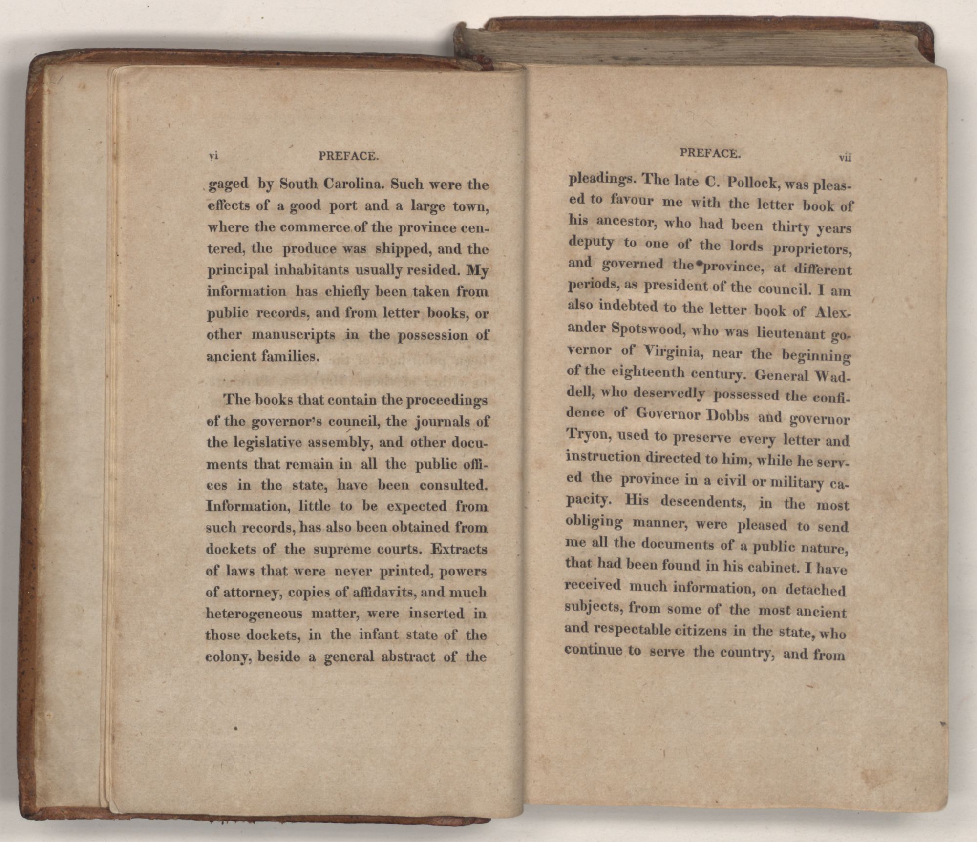PREFACE.IN collecting materials for the history of North Carolina, little information could be obtained from any accounts that have been published, of the British colonies, or either of them. Hackluyt, Purchass, and other ancient writers, have been sufficiently minute in describing the first discoveries, and the attempts that were made to form settlements on different parts of the continent: but no writer has treated, with any attention, of the progress of colonization or the civil history of North Carolina, from the time in which the first permanent settlements were formed in that country. Wynn, Oldmixon, and others, who wrote of Carolina, have done little more than name the northern province: their attention was chiefly engaged