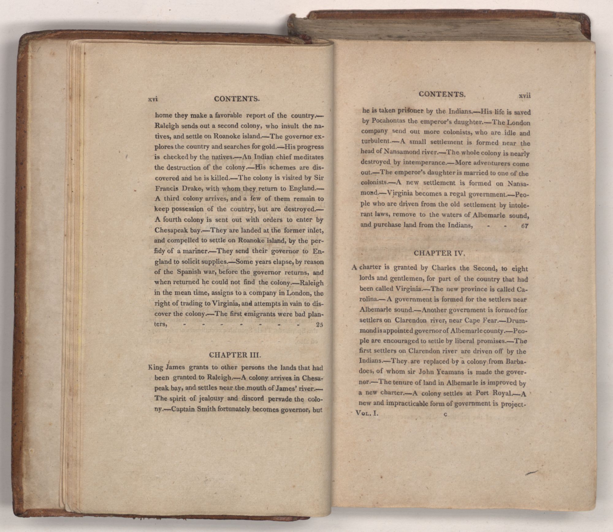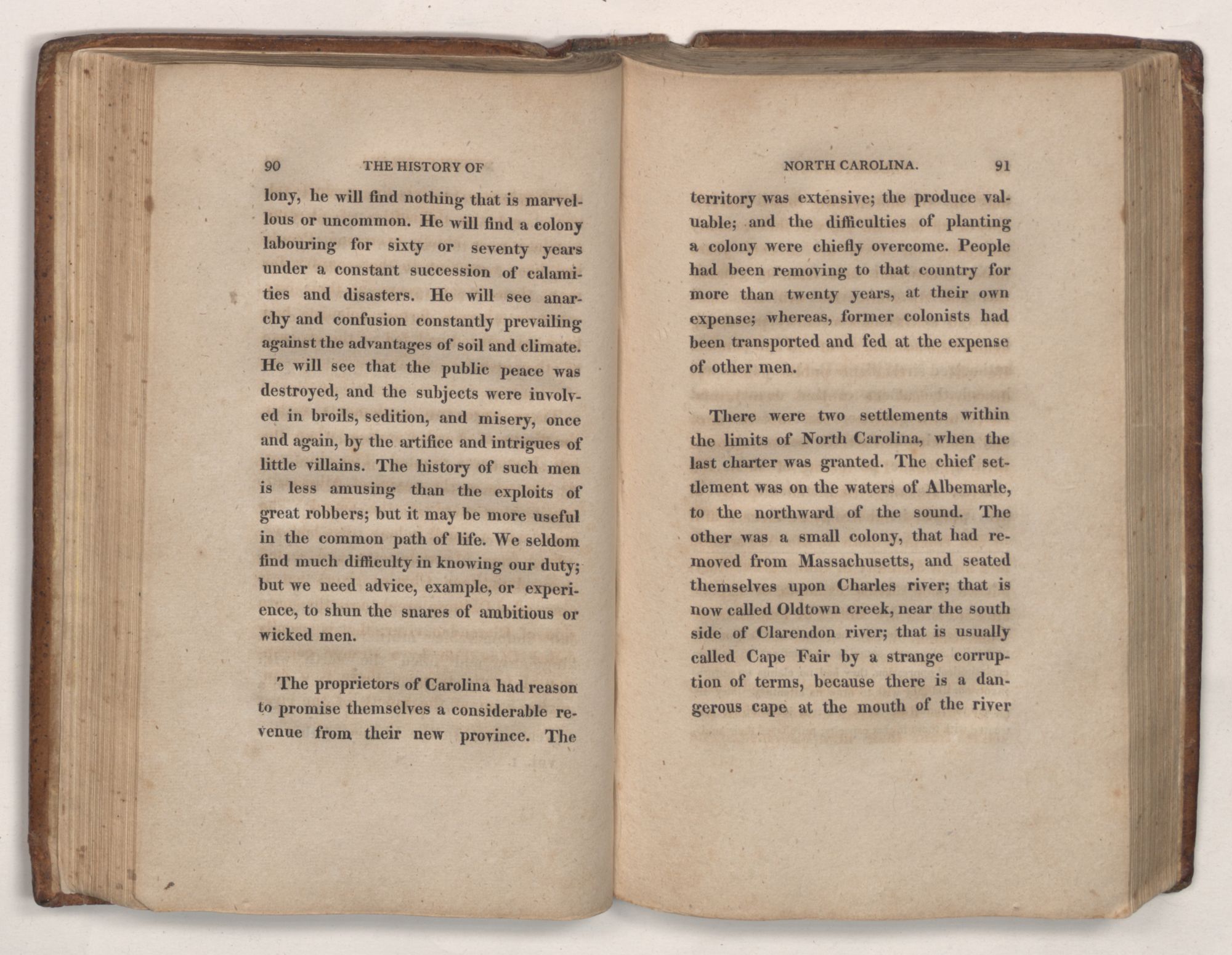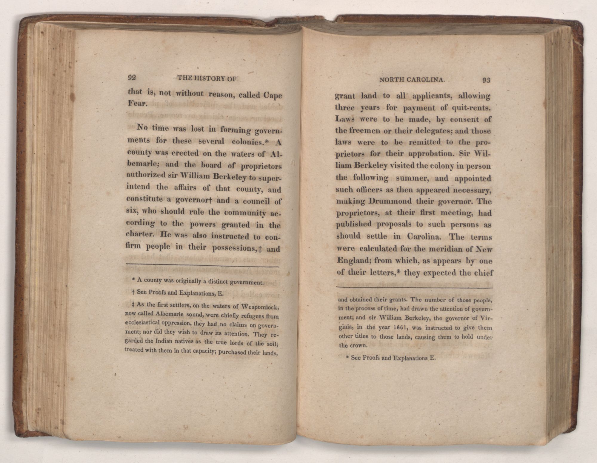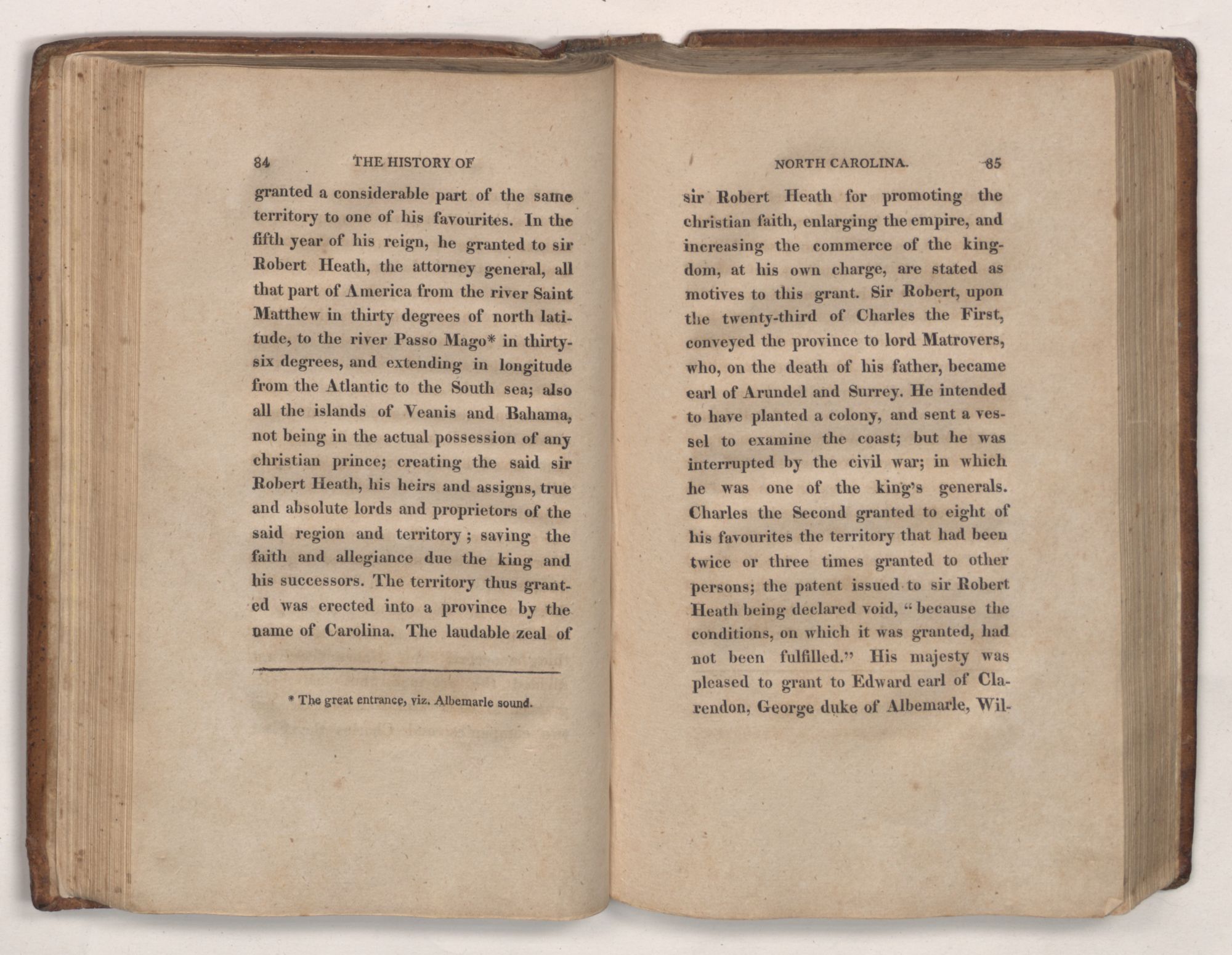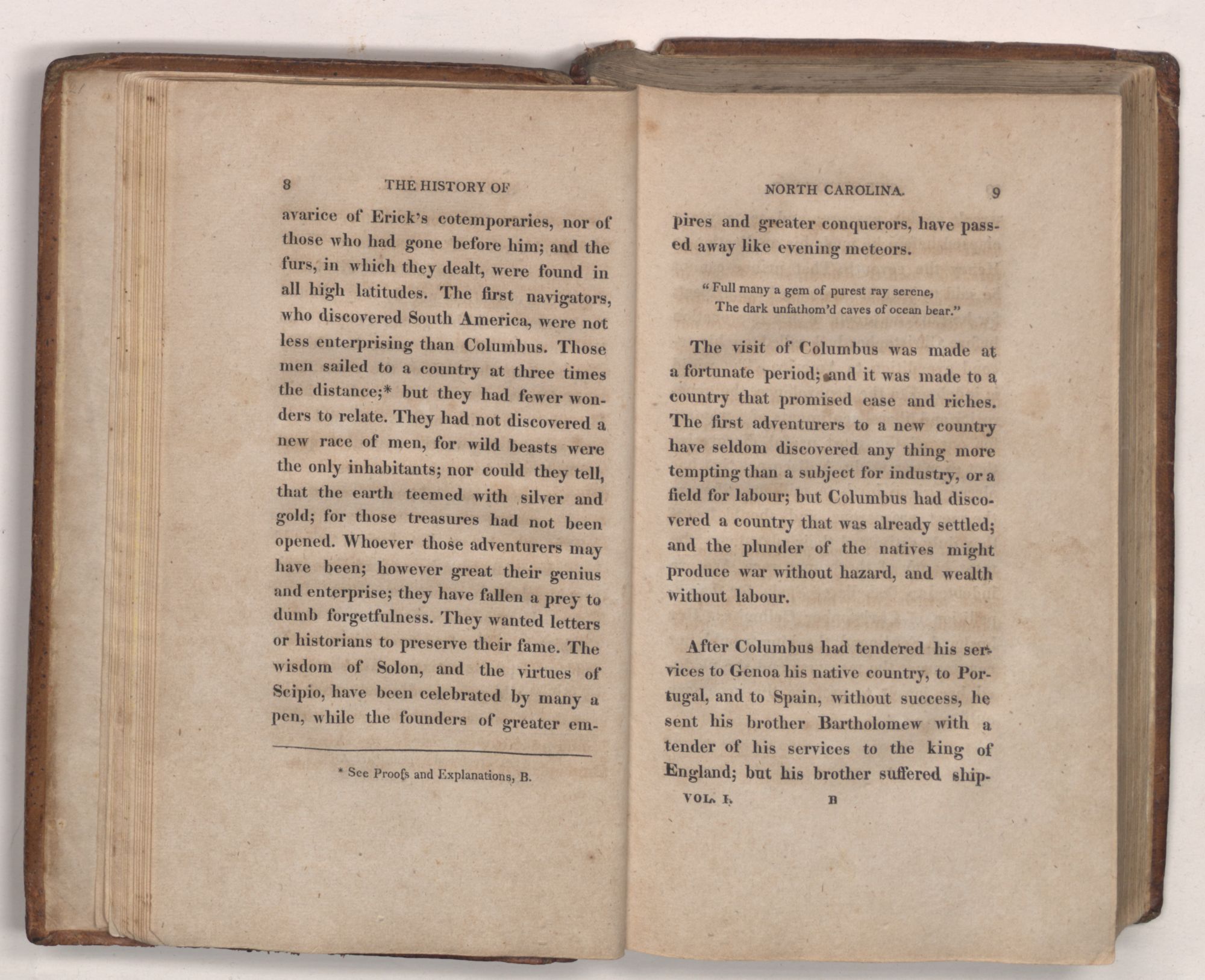 PREFACE.IN collecting materials for the history of North Carolina, little information could be obtained from any accounts that have been published, of the British colonies, or either of them. Hackluyt, Purchass, and other ancient writers, have been sufficiently minute in describing the first discoveries, and the attempts that were made to form settlements on different parts of the continent: but no writer has treated, with any attention, of the progress of colonization or the civil history of North Carolina, from the time in which the first permanent settlements were formed in that country. Wynn, Oldmixon, and others, who wrote of Carolina, have done little more than name the northern province: their attention was chiefly engaged