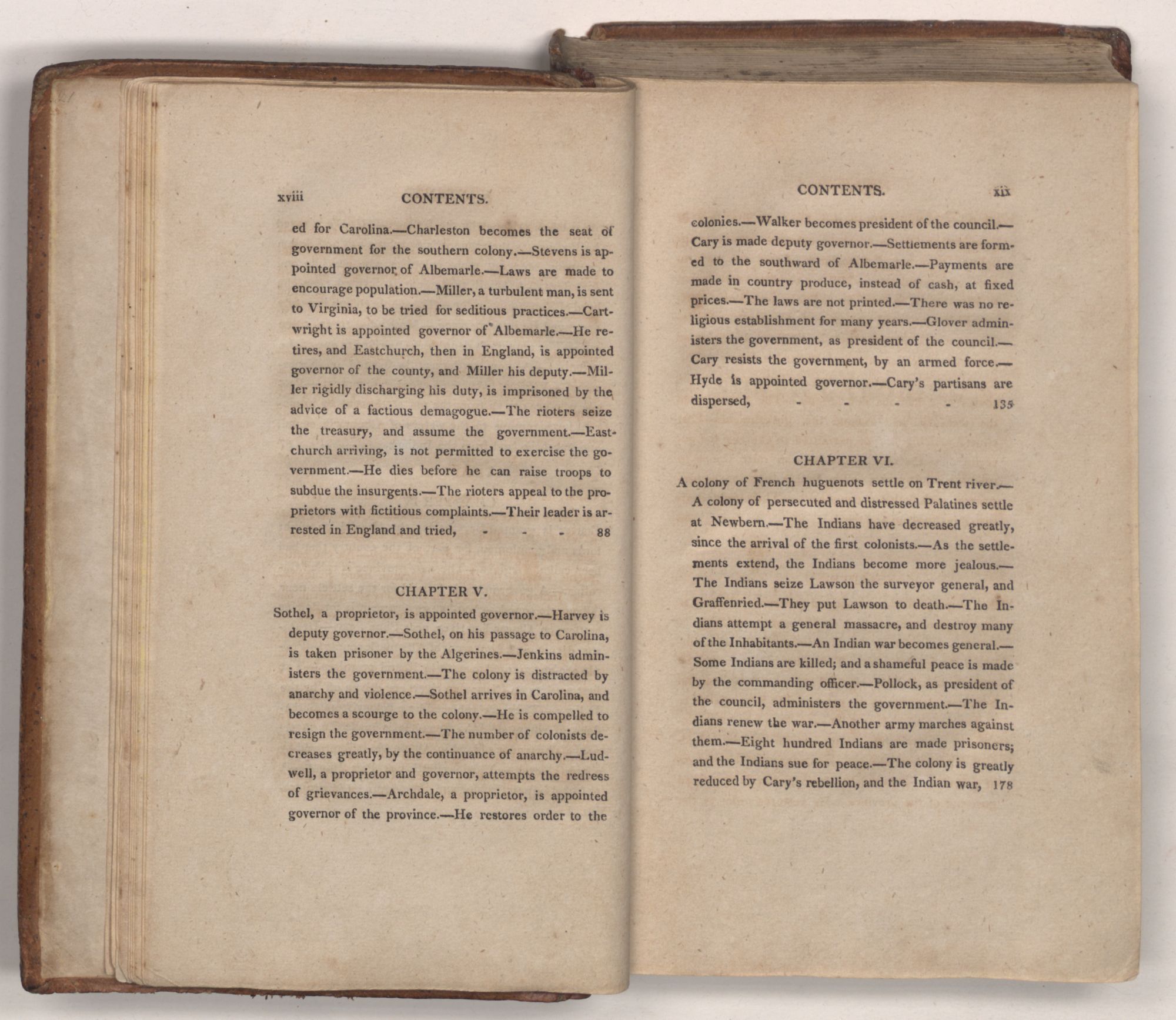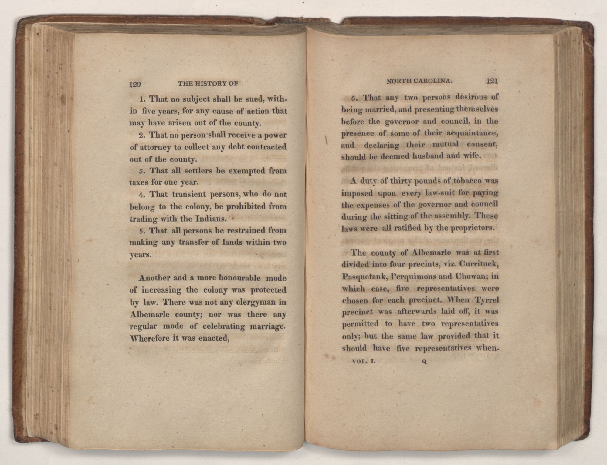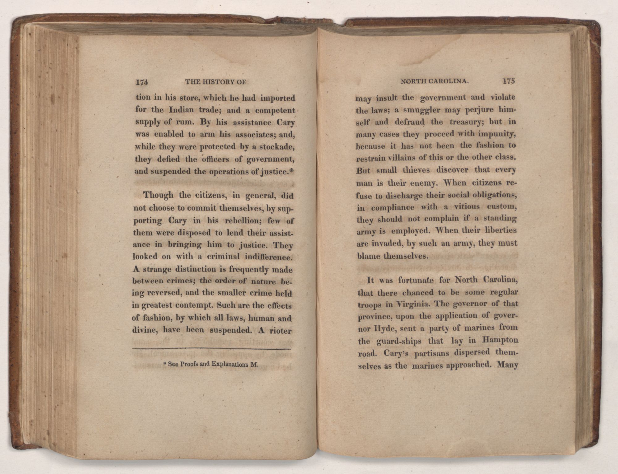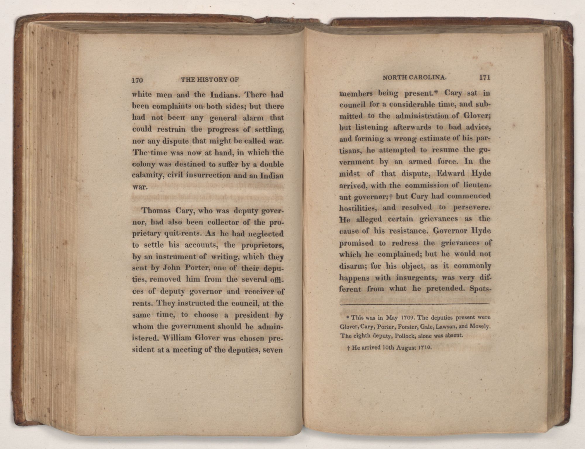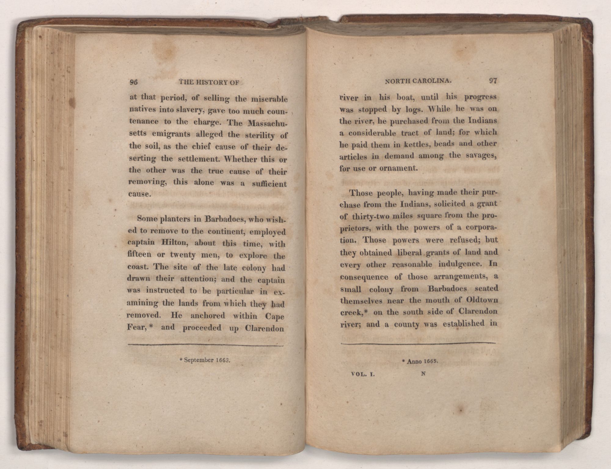 PREFACE.IN collecting materials for the history of North Carolina, little information could be obtained from any accounts that have been published, of the British colonies, or either of them. Hackluyt, Purchass, and other ancient writers, have been sufficiently minute in describing the first discoveries, and the attempts that were made to form settlements on different parts of the continent: but no writer has treated, with any attention, of the progress of colonization or the civil history of North Carolina, from the time in which the first permanent settlements were formed in that country. Wynn, Oldmixon, and others, who wrote of Carolina, have done little more than name the northern province: their attention was chiefly engaged