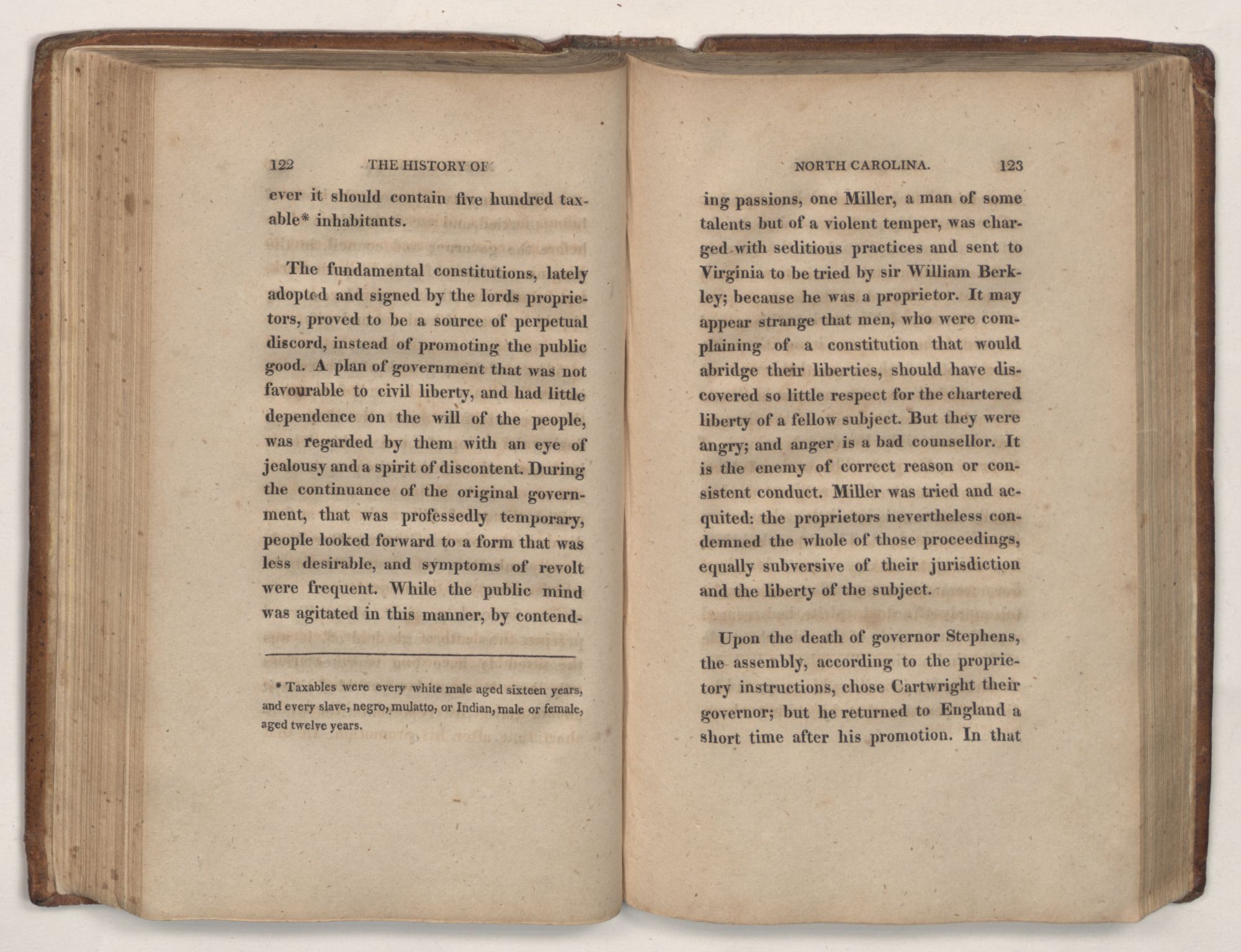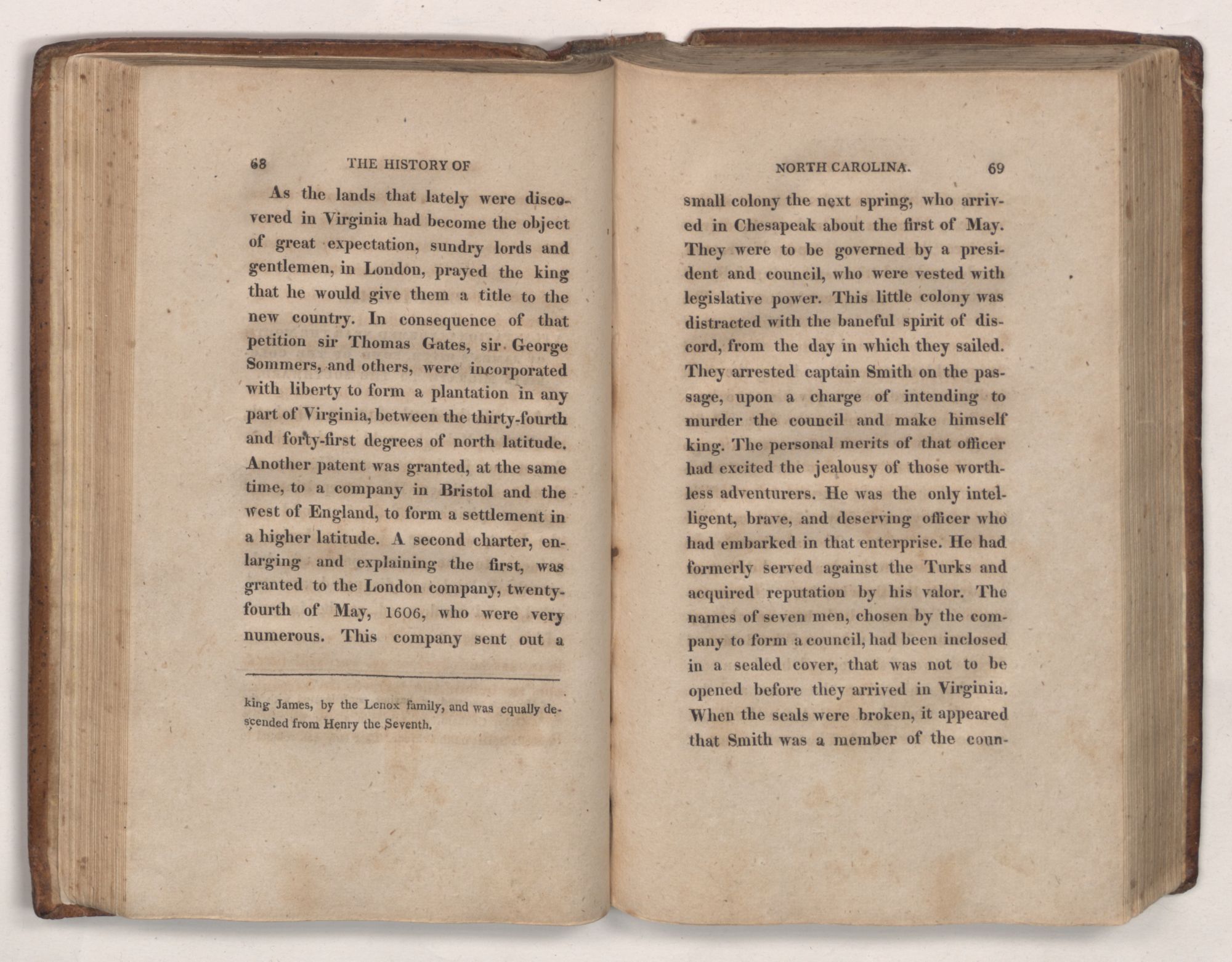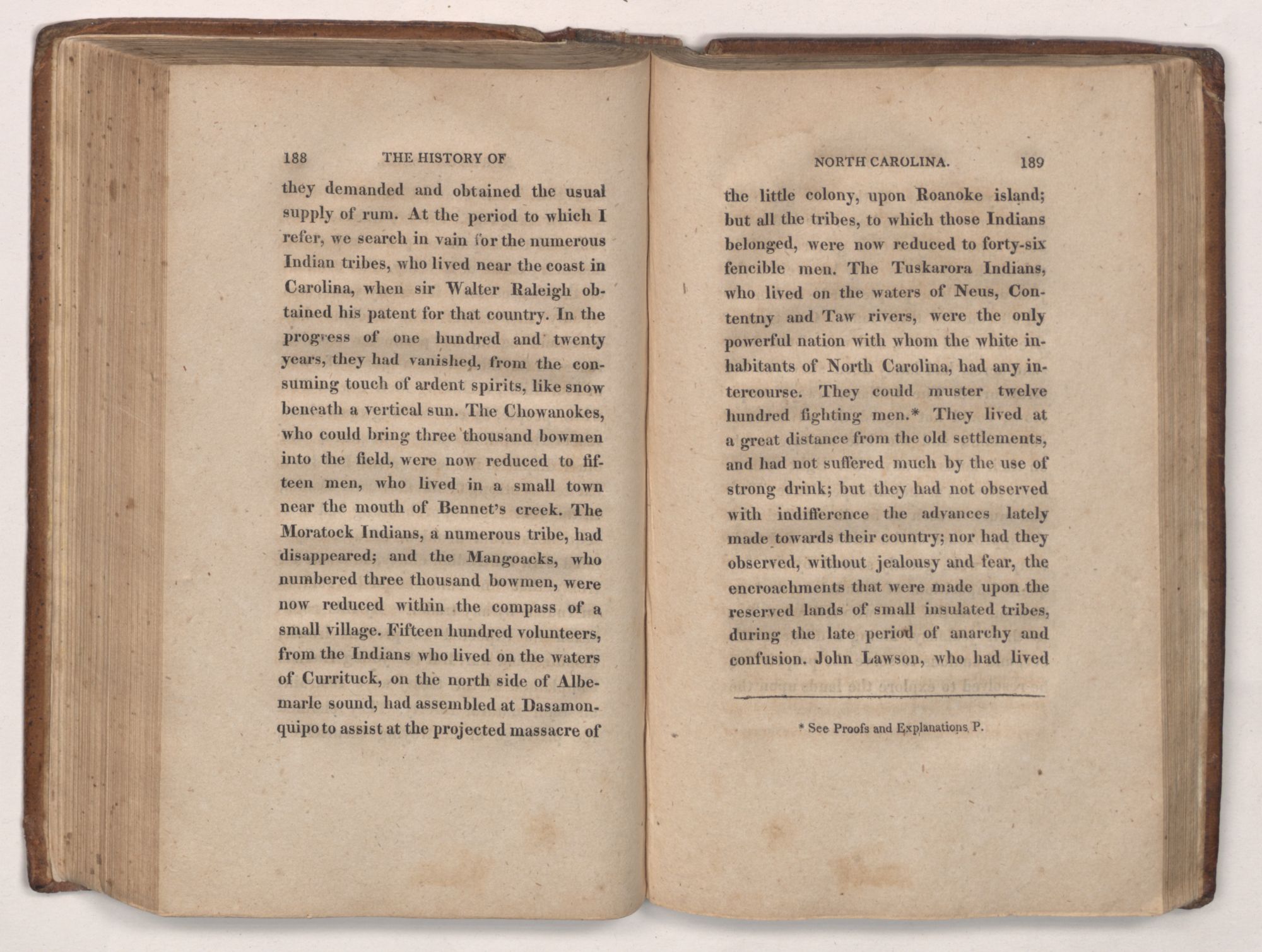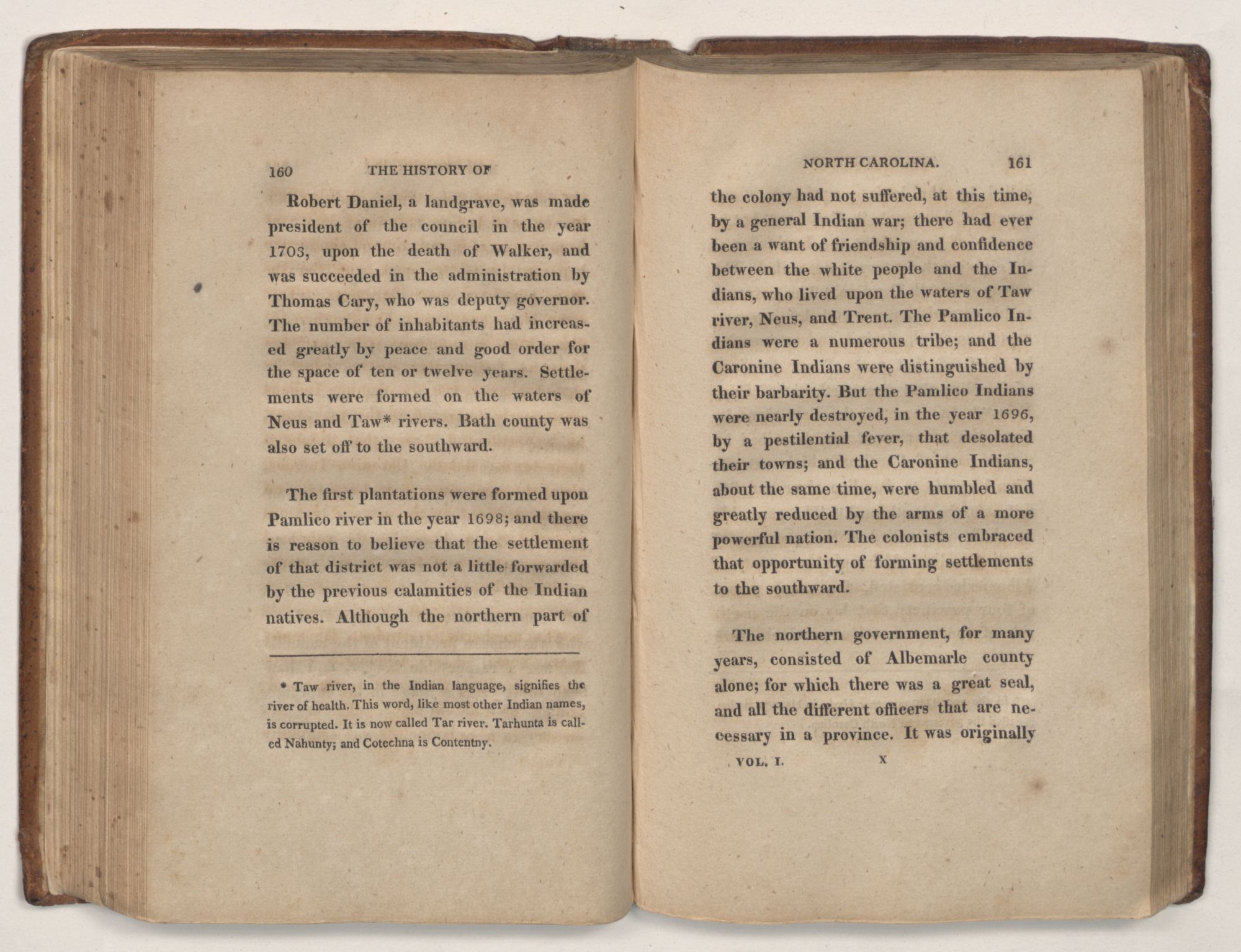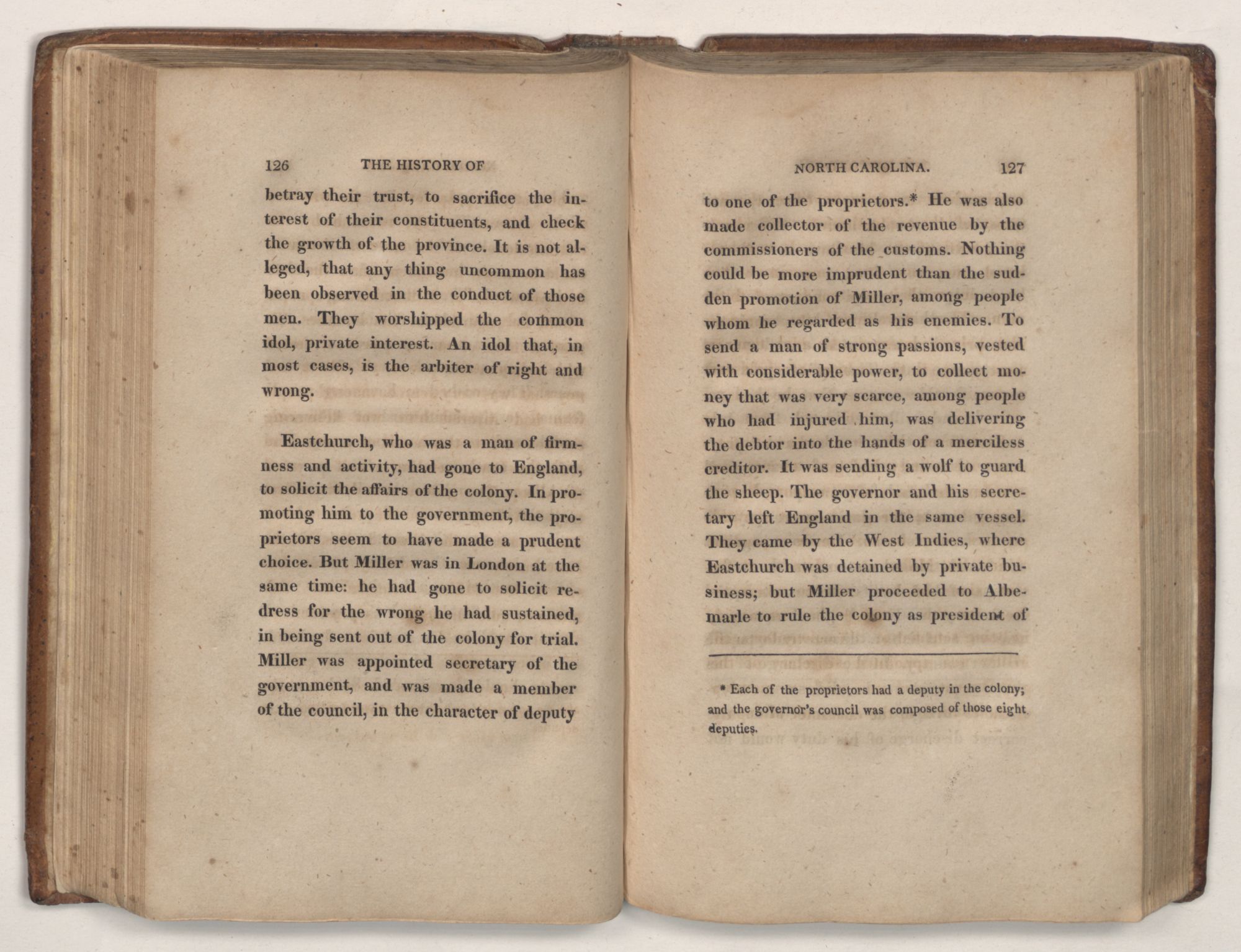 PREFACE.IN collecting materials for the history of North Carolina, little information could be obtained from any accounts that have been published, of the British colonies, or either of them. Hackluyt, Purchass, and other ancient writers, have been sufficiently minute in describing the first discoveries, and the attempts that were made to form settlements on different parts of the continent: but no writer has treated, with any attention, of the progress of colonization or the civil history of North Carolina, from the time in which the first permanent settlements were formed in that country. Wynn, Oldmixon, and others, who wrote of Carolina, have done little more than name the northern province: their attention was chiefly engaged