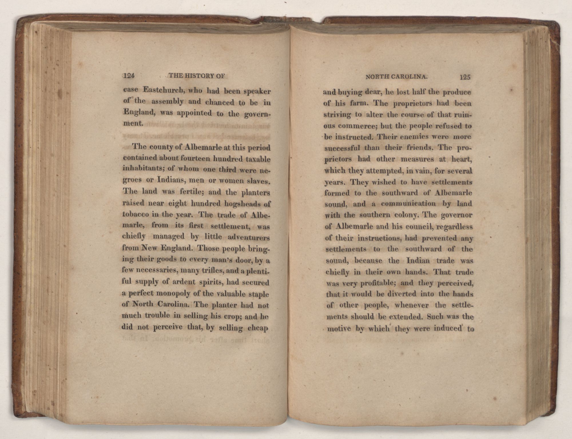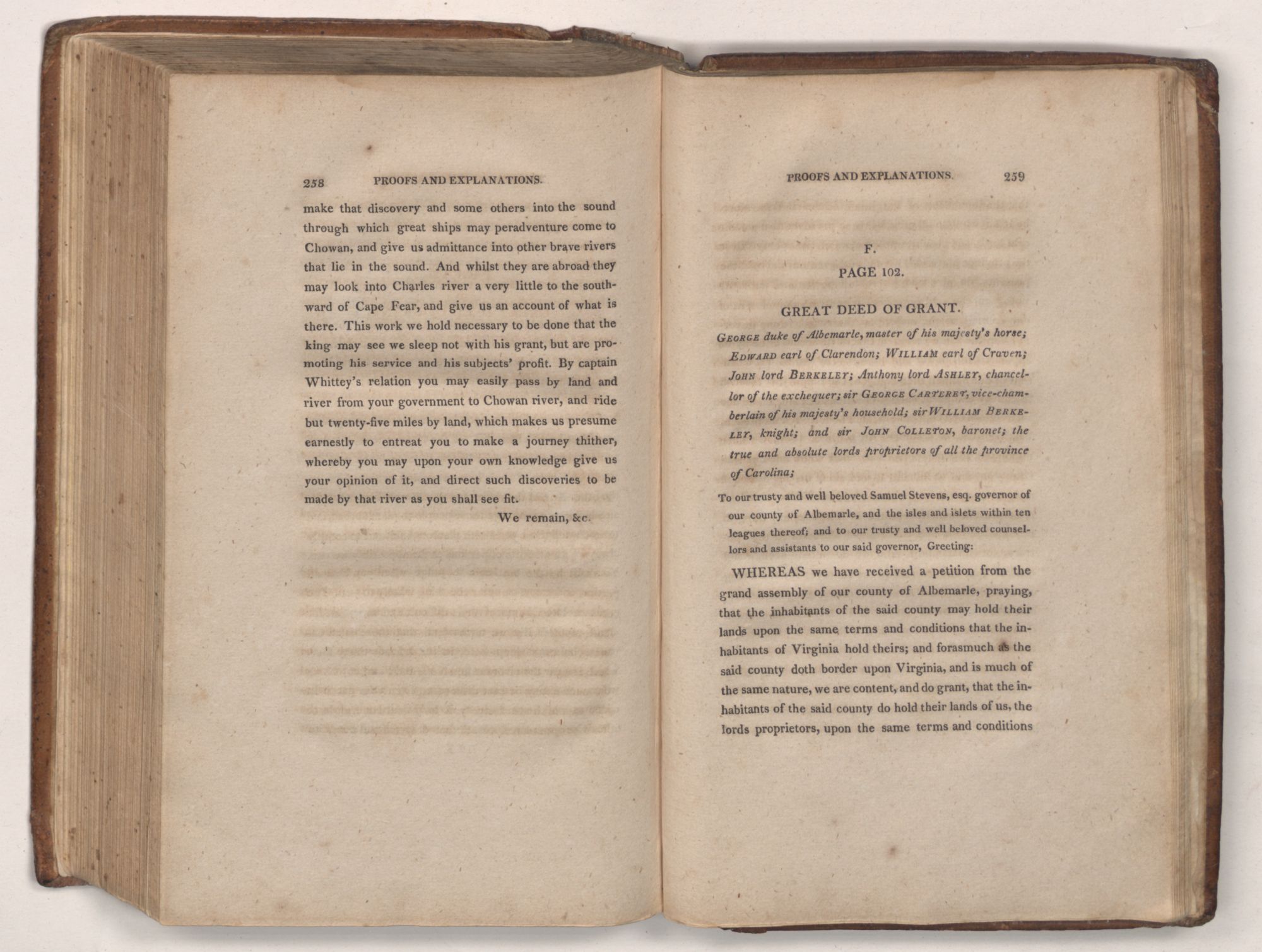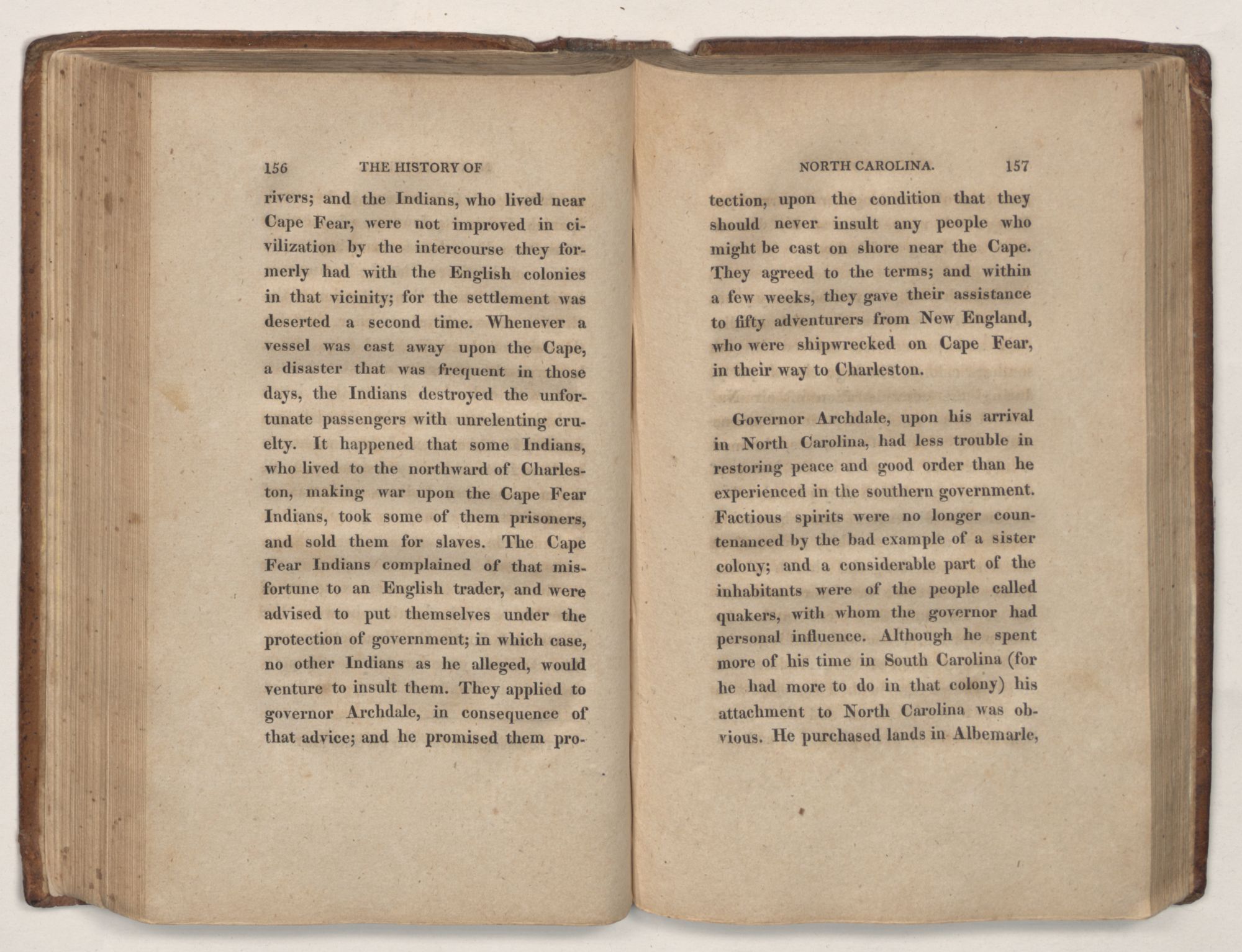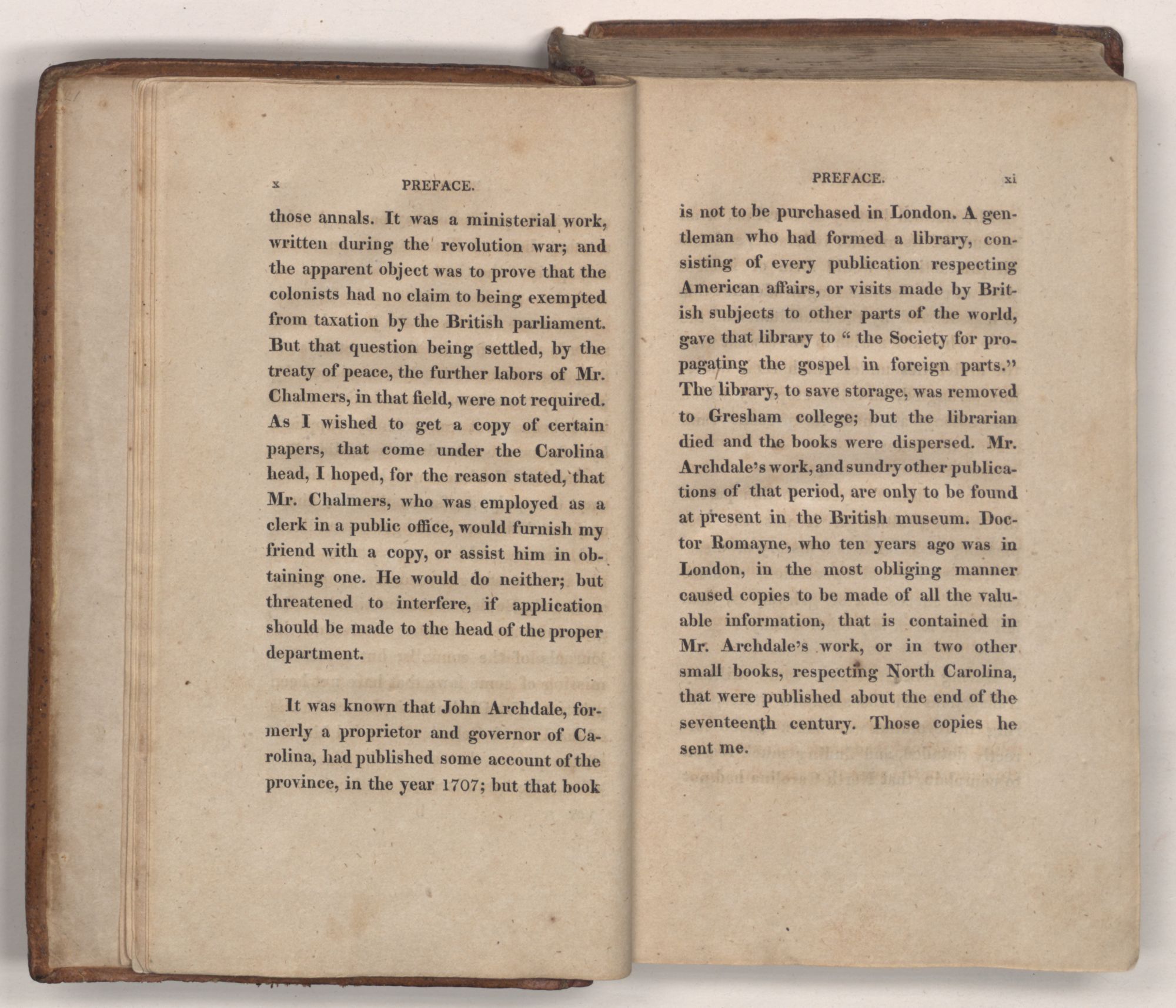 is not to be purchased in London. A gentleman who had formed a library, consisting of every publication respecting American affairs, or visits made by British subjects to other parts of the world, gave that library to “the Society for propagating the gospel in foreign parts.” The library, to save storage, was removed to Gresham college; but the librarian died and the books were dispersed. Mr. Archdale's work, and sundry other publications of that period, are only to be found at present in the British museum. Doctor Romayne, who ten years ago was in London, in the most obliging manner caused copies to be made of all the valuable information, that is contained in Mr. Archdale's work, or in two other small books, respecting North Carolina, that were published about the end of the seventeenth century. Those copies he sent me.