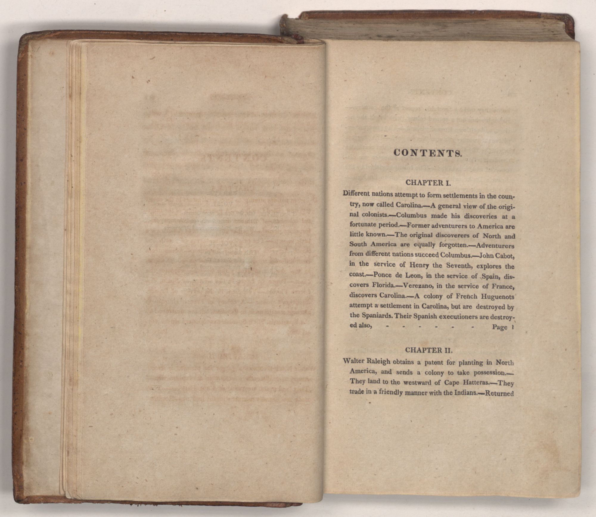 Different nations attempt to form settlements in the country, now called Carolina.—A general view of the original colonists.—Columbus made his discoveries at a fortunate period.—Former adventurers to America are little known.—The original discoverers of North and South America are equally forgotten.—Adventurers from different nations succeed Columbus.—John Cabot, in the service of Henry the Seventh, explores the coast.—Ponce de Leon, in the service of Spain, discovers Florida.—Verezano, in the service of France, discovers Carolina.—A colony of French Huguenots attempt a settlement in Carolina, but are destroyed by the Spaniards. Their Spanish executioners are destroyed also, Page 1