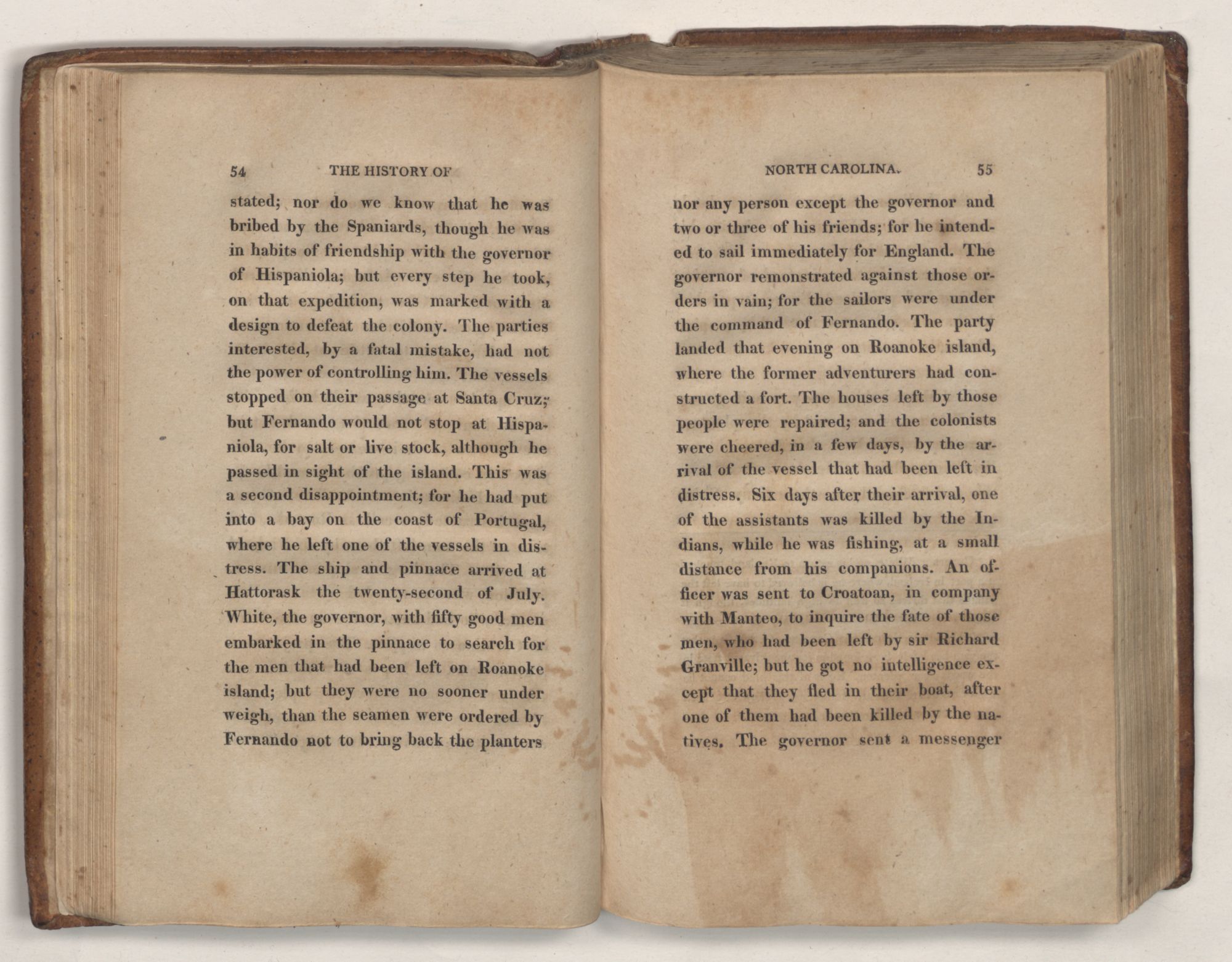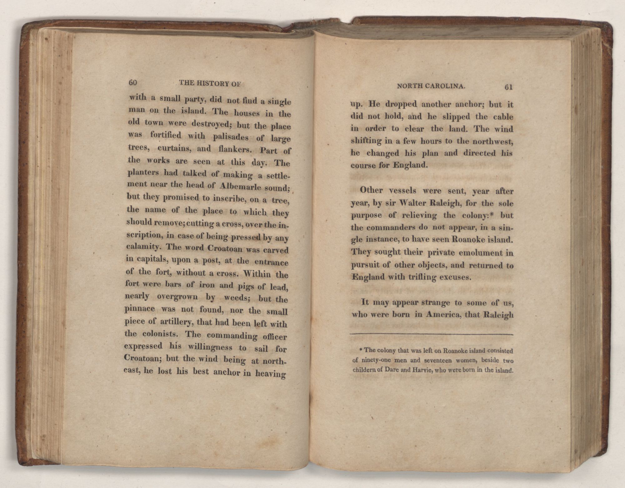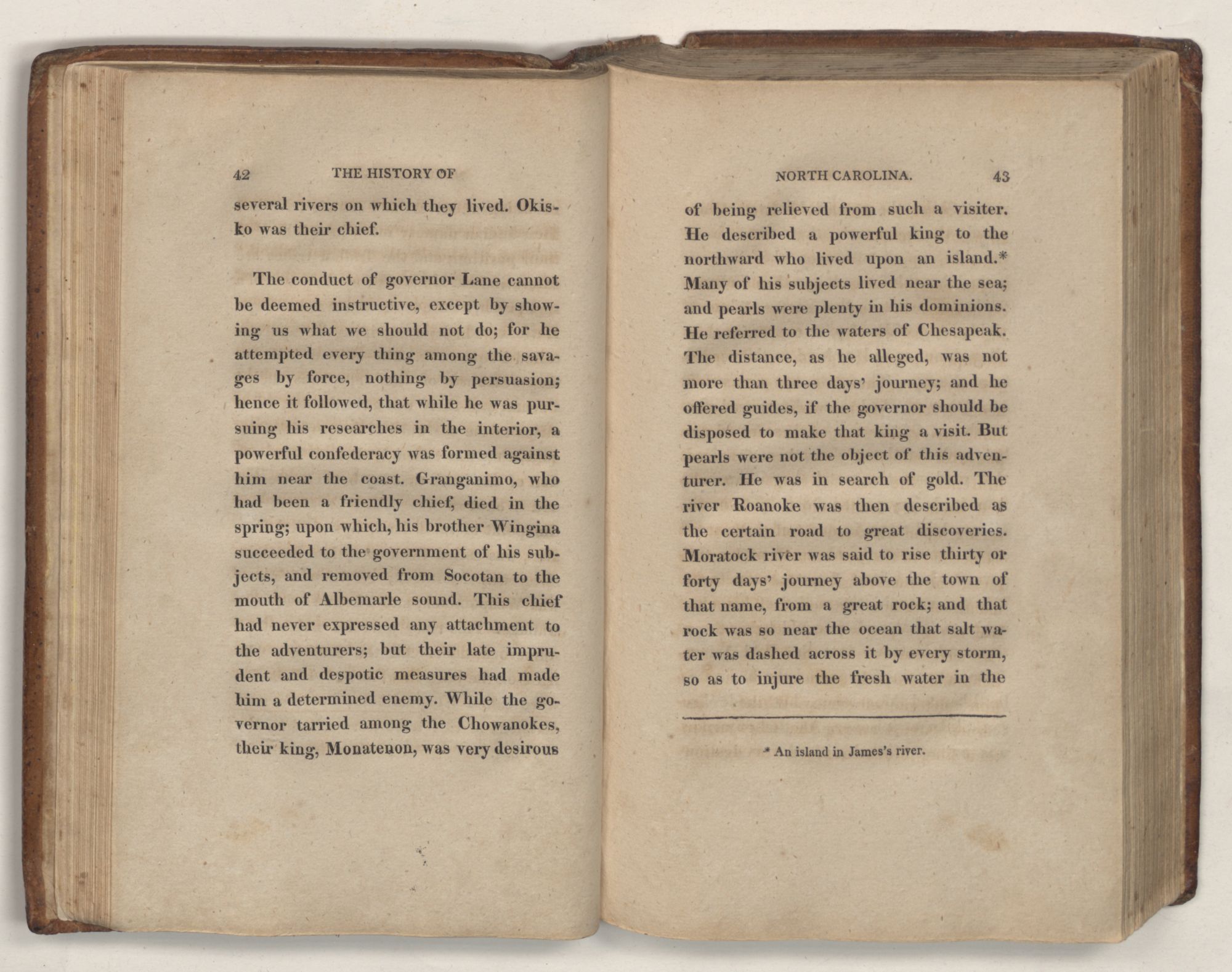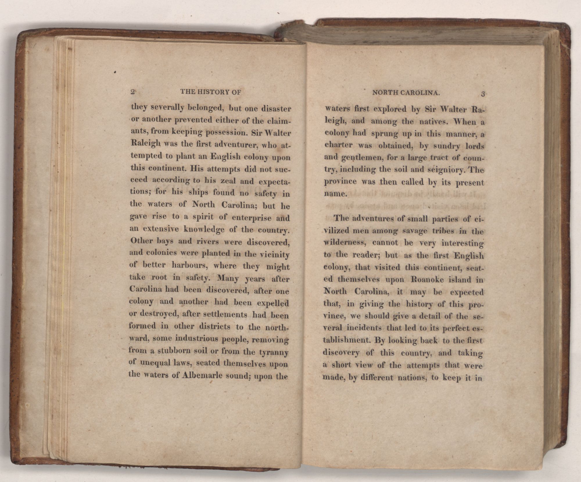 The adventures of small parties of civilized men among savage tribes in the wilderness, cannot be very interesting to the reader; but as the first English colony, that visited this continent, seated themselves upon Roanoke island in North Carolina, it may be expected that, in giving the history of this province, we should give a detail of the several incidents that led to its perfect establishment. By looking back to the first discovery of this country, and taking a short view of the attempts that were made, by different nations, to keep it in