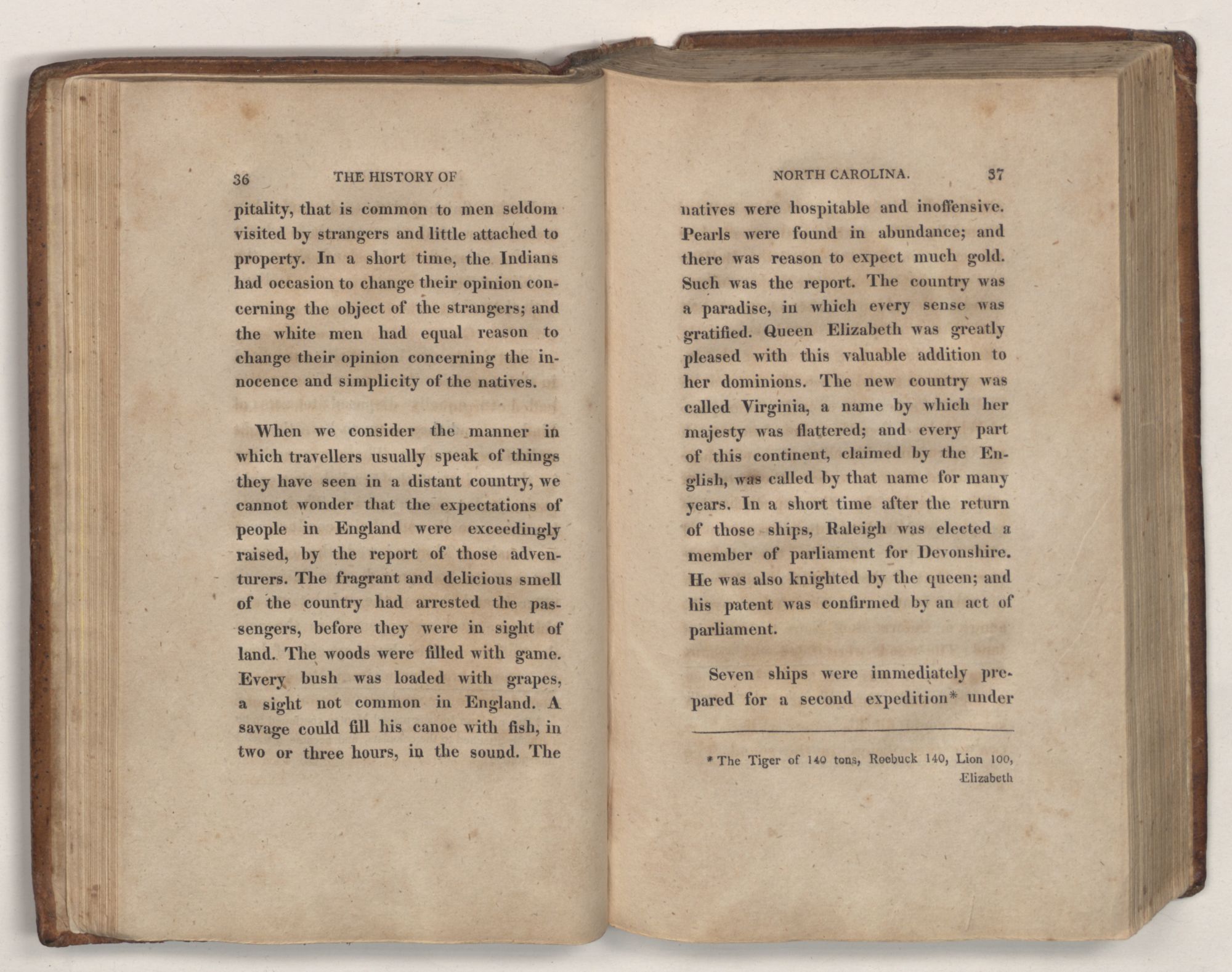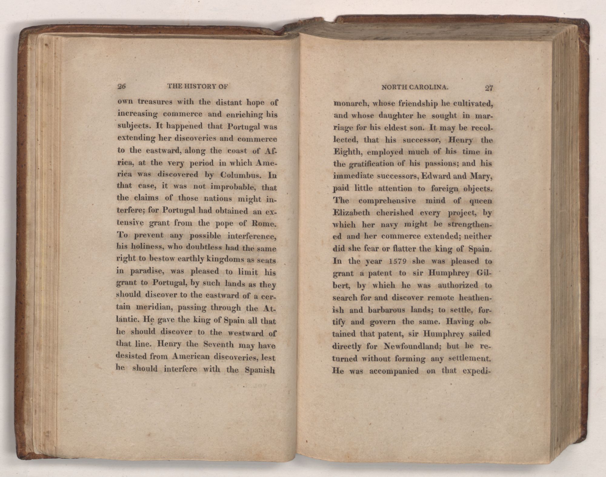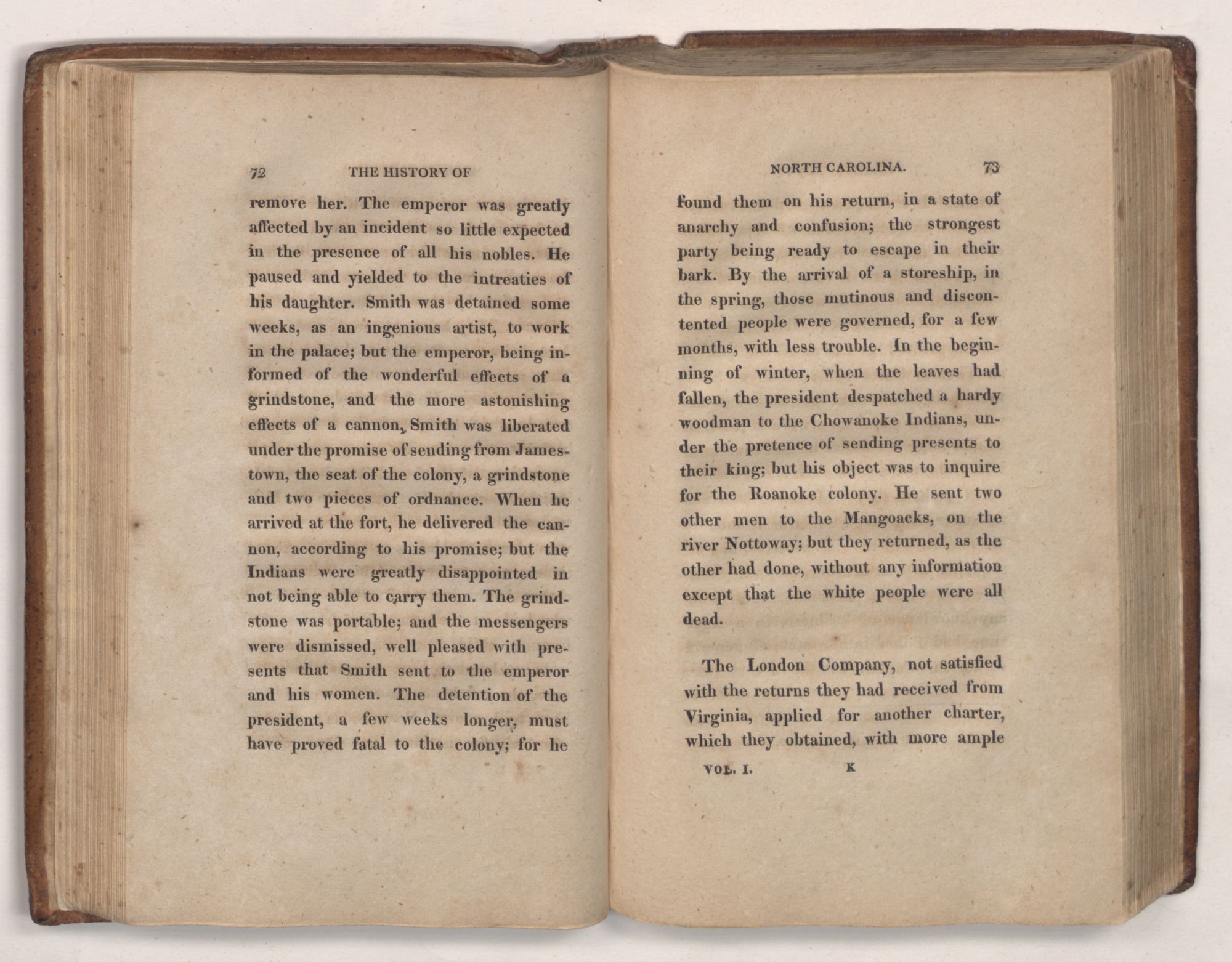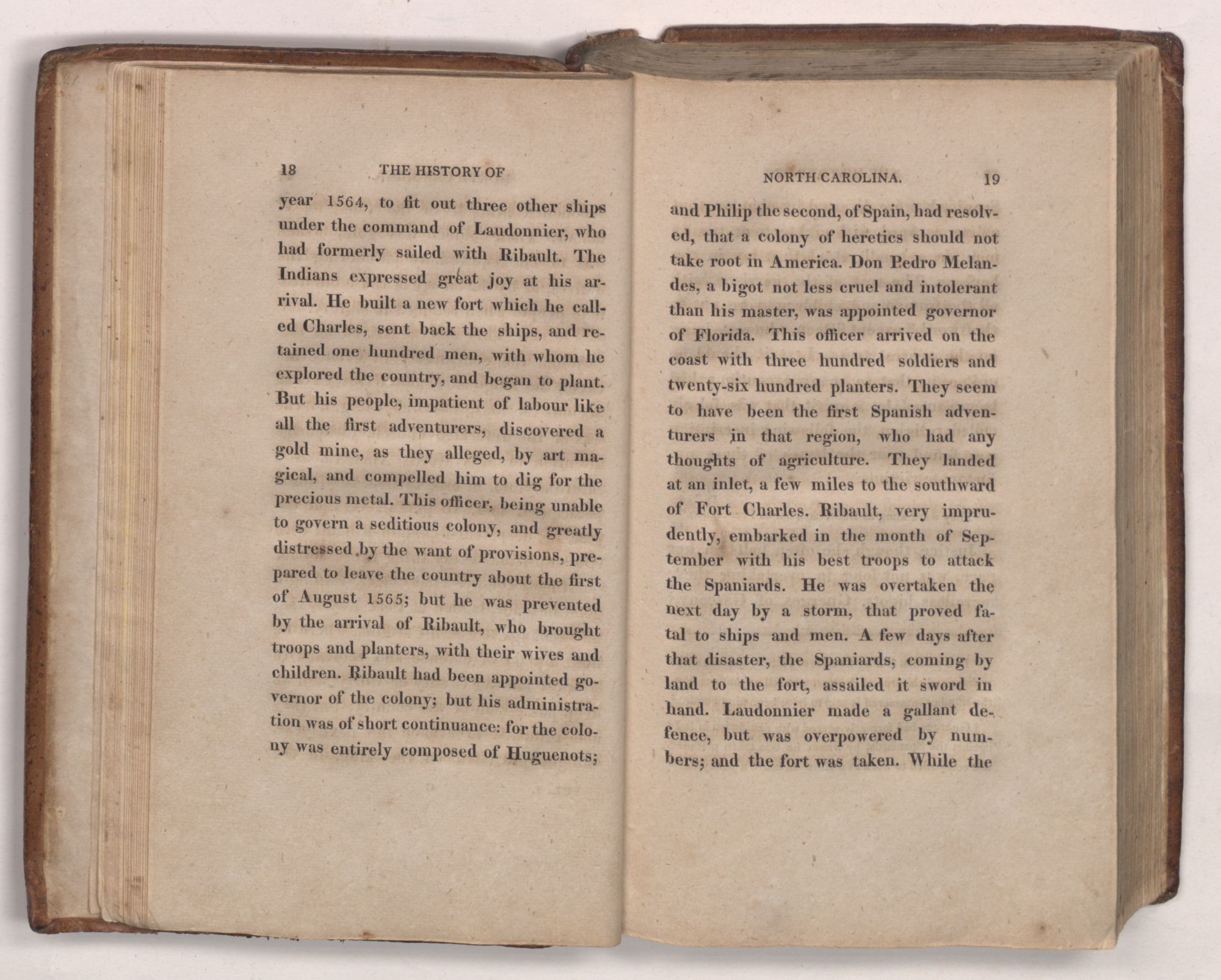 The adventures of small parties of civilized men among savage tribes in the wilderness, cannot be very interesting to the reader; but as the first English colony, that visited this continent, seated themselves upon Roanoke island in North Carolina, it may be expected that, in giving the history of this province, we should give a detail of the several incidents that led to its perfect establishment. By looking back to the first discovery of this country, and taking a short view of the attempts that were made, by different nations, to keep it in