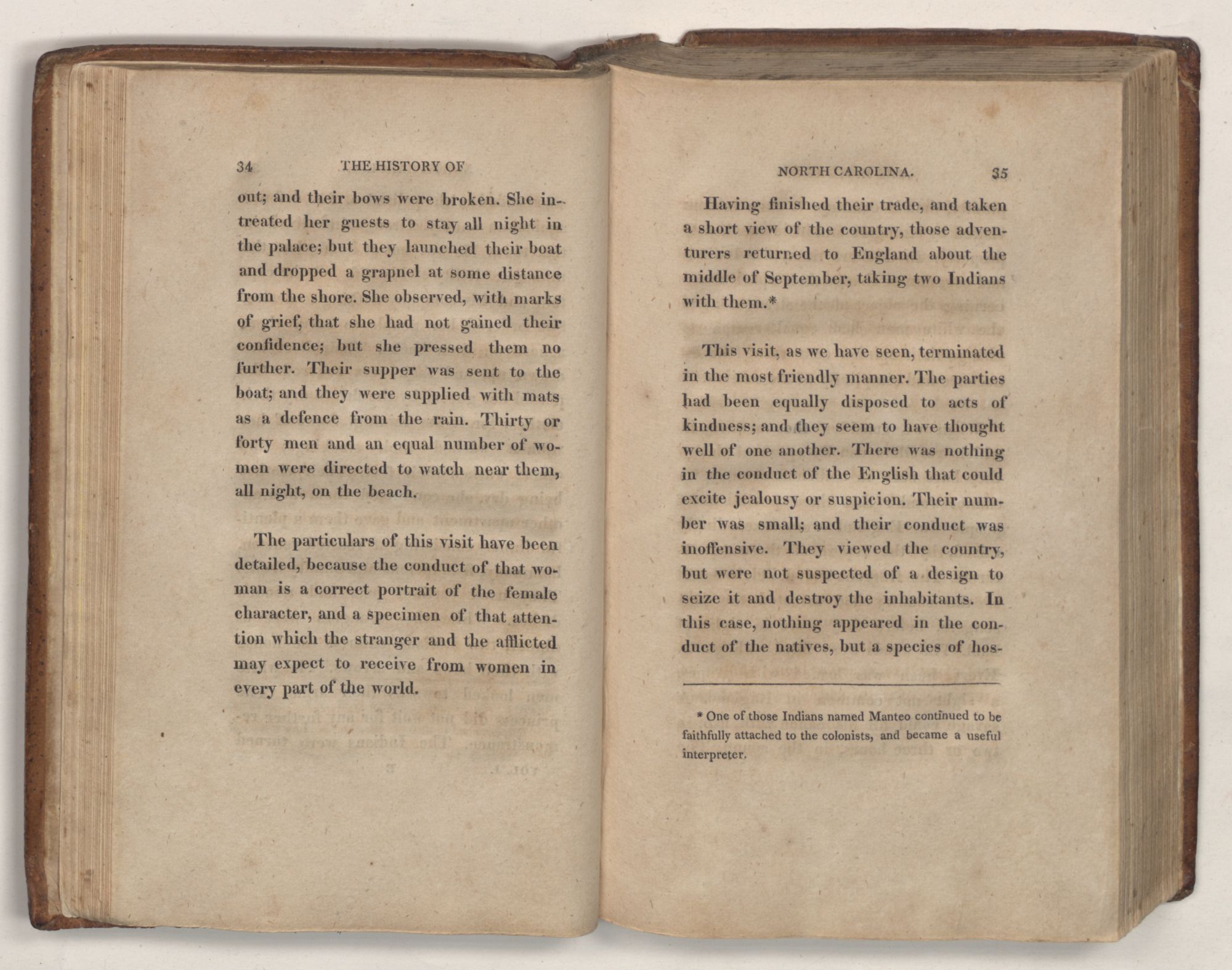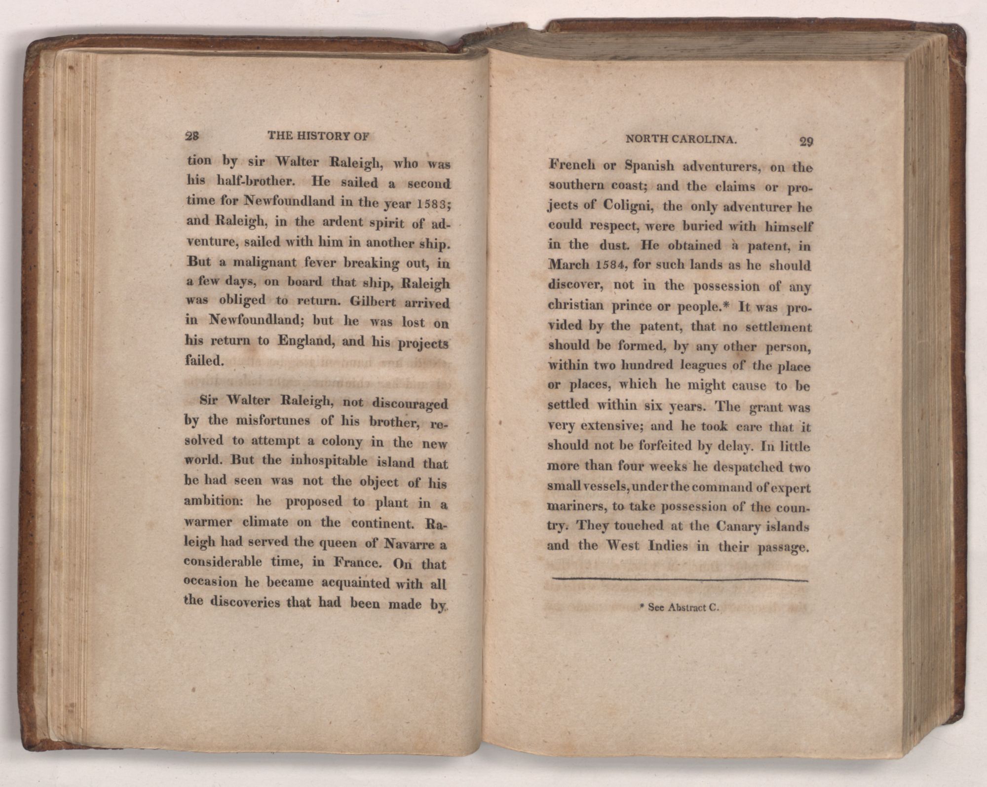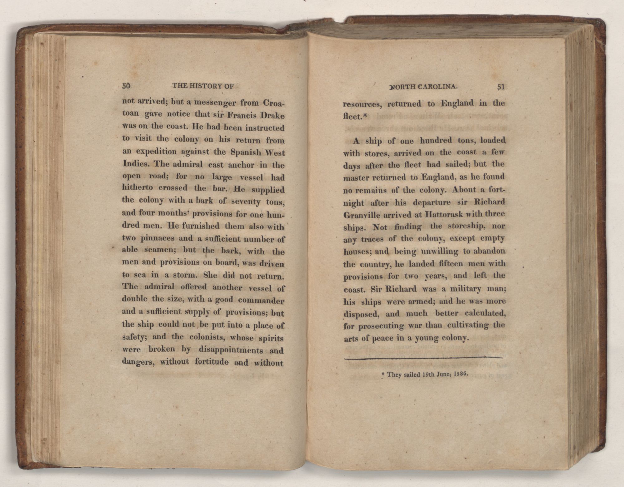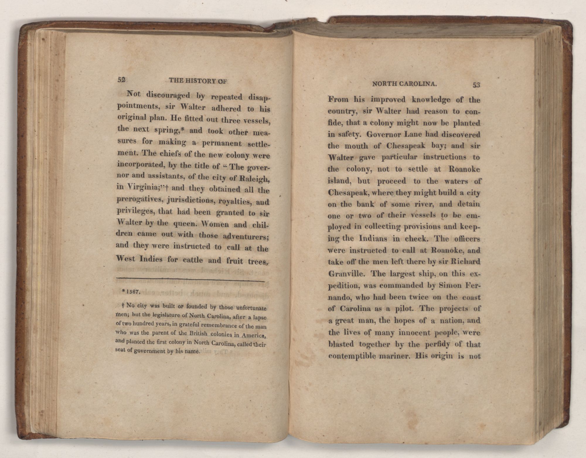 The adventures of small parties of civilized men among savage tribes in the wilderness, cannot be very interesting to the reader; but as the first English colony, that visited this continent, seated themselves upon Roanoke island in North Carolina, it may be expected that, in giving the history of this province, we should give a detail of the several incidents that led to its perfect establishment. By looking back to the first discovery of this country, and taking a short view of the attempts that were made, by different nations, to keep it in