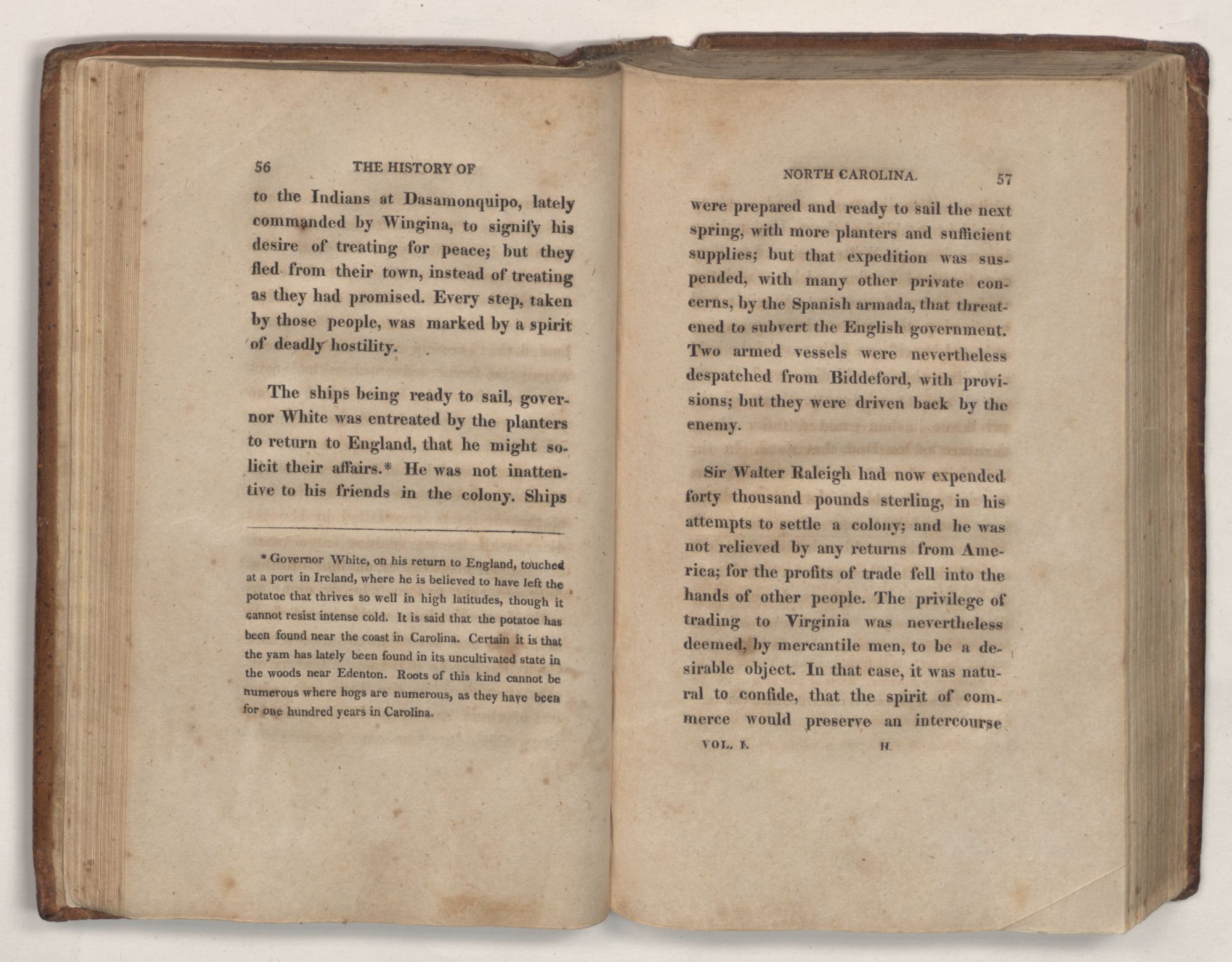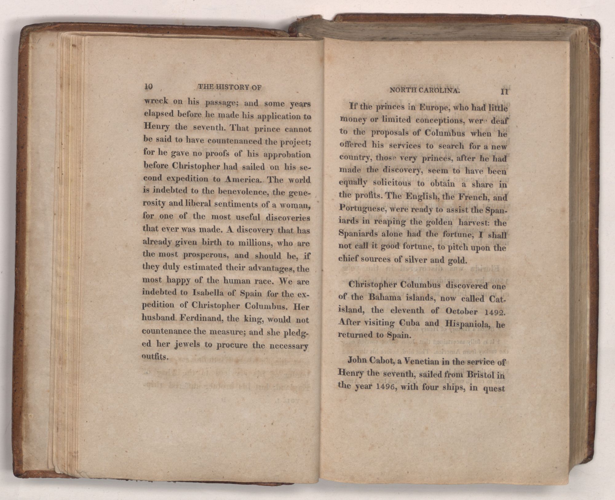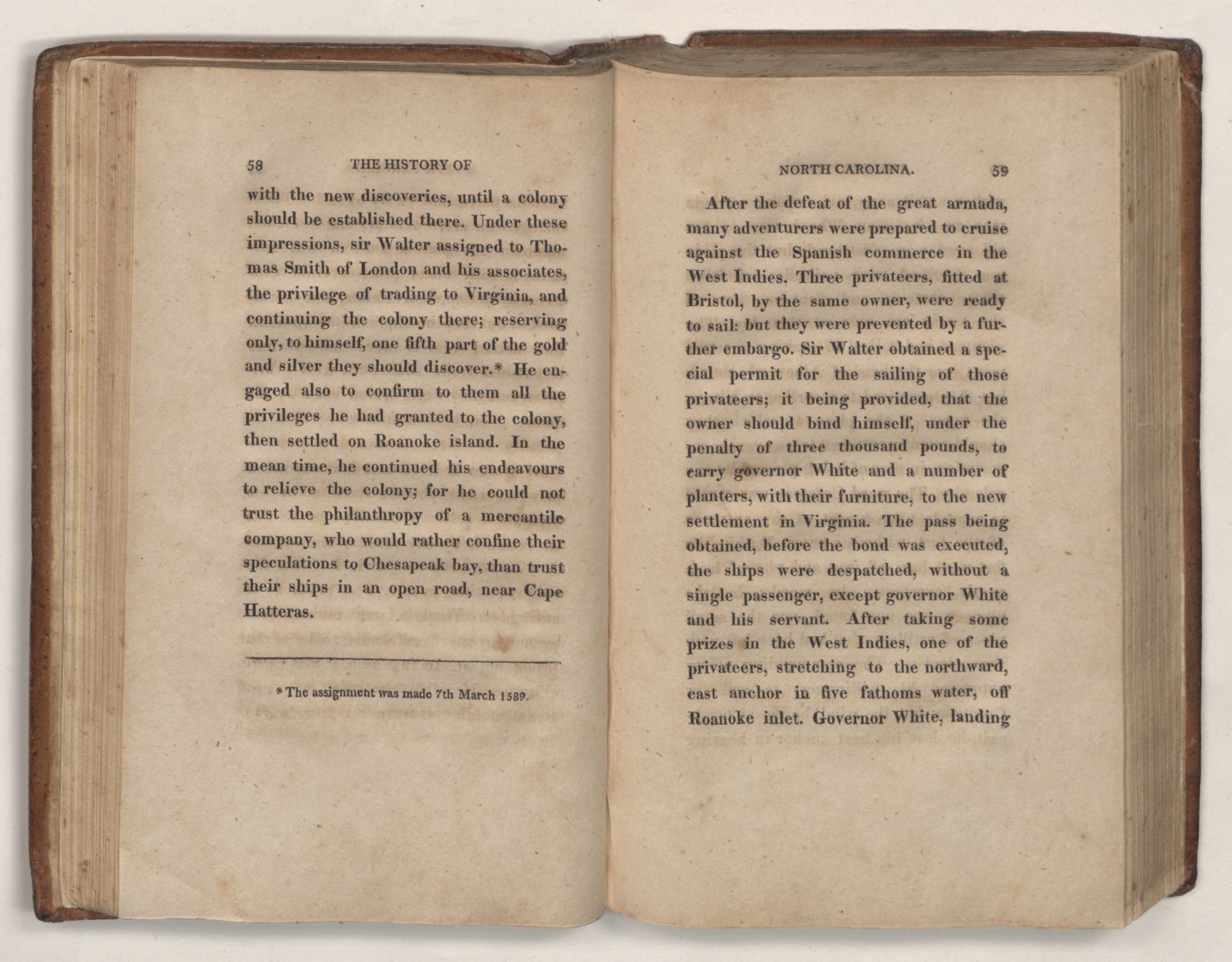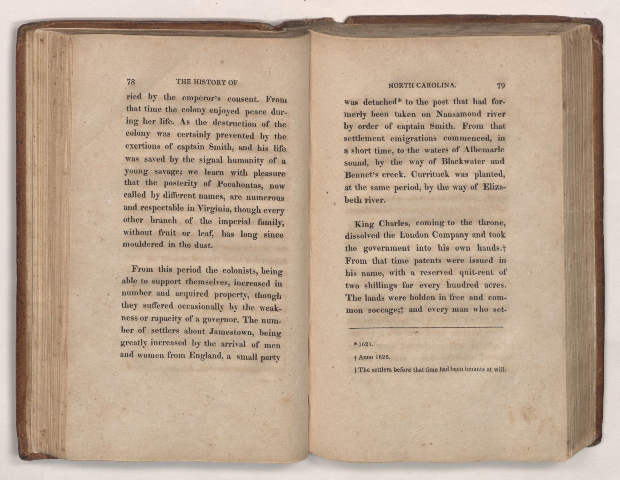 The adventures of small parties of civilized men among savage tribes in the wilderness, cannot be very interesting to the reader; but as the first English colony, that visited this continent, seated themselves upon Roanoke island in North Carolina, it may be expected that, in giving the history of this province, we should give a detail of the several incidents that led to its perfect establishment. By looking back to the first discovery of this country, and taking a short view of the attempts that were made, by different nations, to keep it in