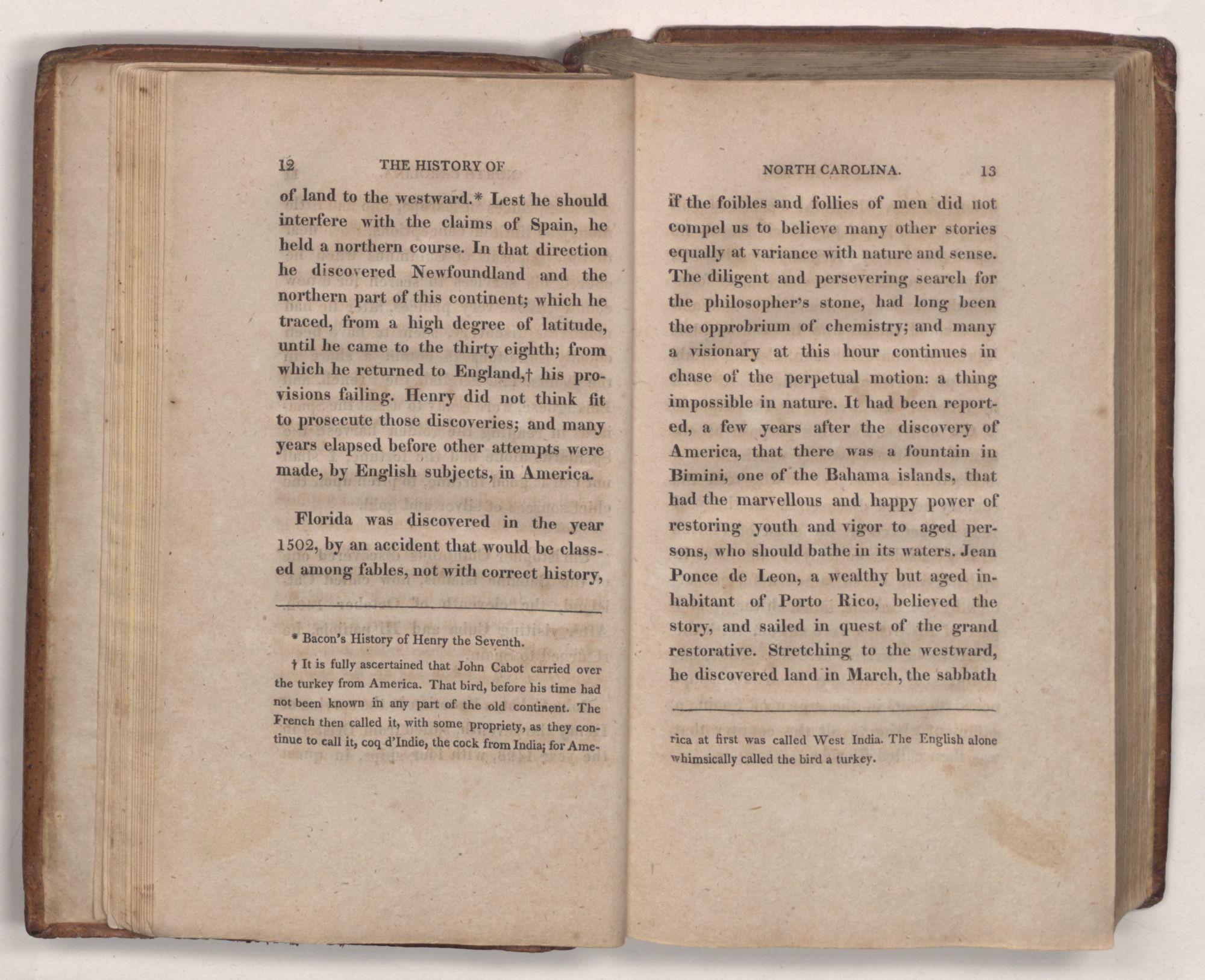 * Bacon's, [Unknown] History of Henry the Seventh.† It is fully ascertained that John Cabot carried over the turkey from America. That bird, before his time had not been known in any part of the old contiment. The French then called it, with some propriety, as they continue to call it, coq d'Indie, the cock from India; for America at first was called West India. The English alone whimsically called the bird a turkey.if the foibles and follies of men did not compel us to believe many other stories equally at variance with nature and sense. The diligent and persevering search for the philosopher's stone, had long been the opprobrium of chemistry; and many a visionary at this hour continues in chase of the perpetual motion: a thing impossible in nature. It had been reported, a few years after the discovery of America, that there was a fountain in Bimini, one of the Bahama islands, that had the marvellous and happy power of restoring youth and vigor to aged persons, who should bathe in its waters. Jean Ponce de Leon, a wealthy but aged inhabitant of Porto Rico, believed the story, and sailed in quest of the grand restorative. Stretching to the westward, he discovered land in March, the sabbath