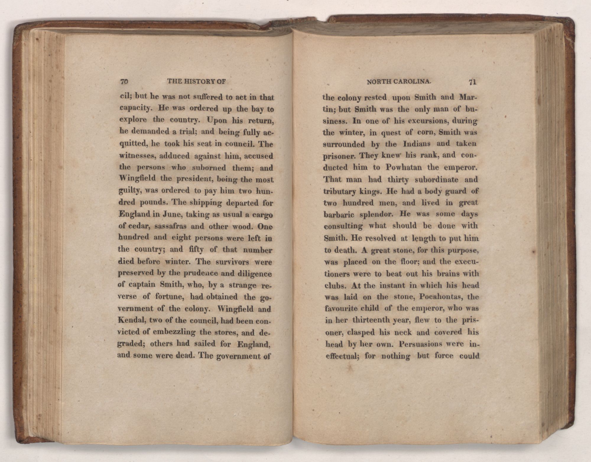he is taken prisoner by the Indians.—His life is saved by Pocahontas the emperor's daughter.—The London company send out more colonists, who are idle and turbulent.—A small settlement is formed near the head of Nansamond river.—The whole colony is nearly destroyed by intemperance.—More adventurers come out.—The emperor's daughter is married to one of the colonists.—A new settlement is formed on Nansamond.—Virginia becomes a regal government.—People who are driven from the old settlement by intolerant laws, remove to the waters of Albemarle sound, and purchase land from the Indians, 67