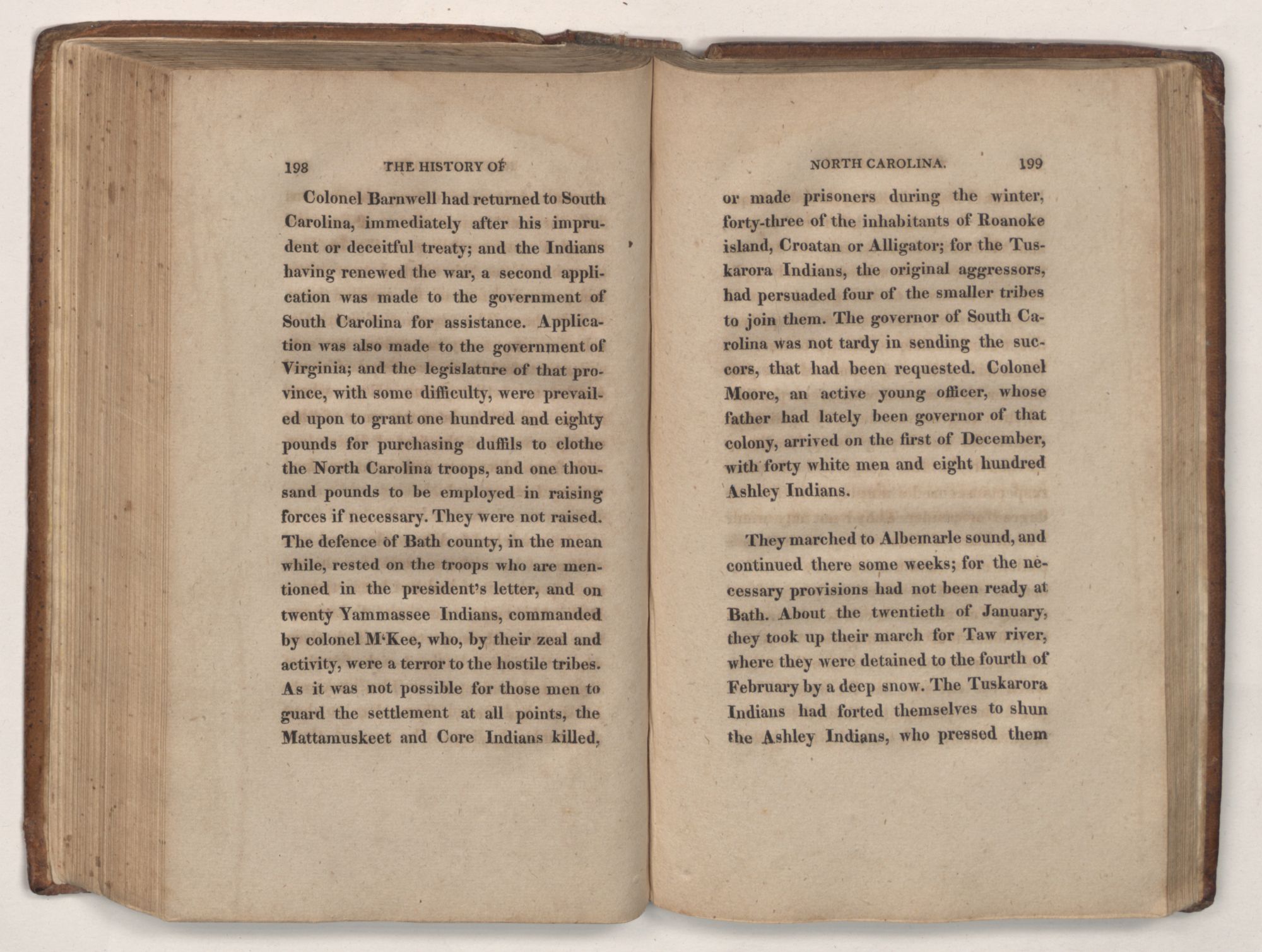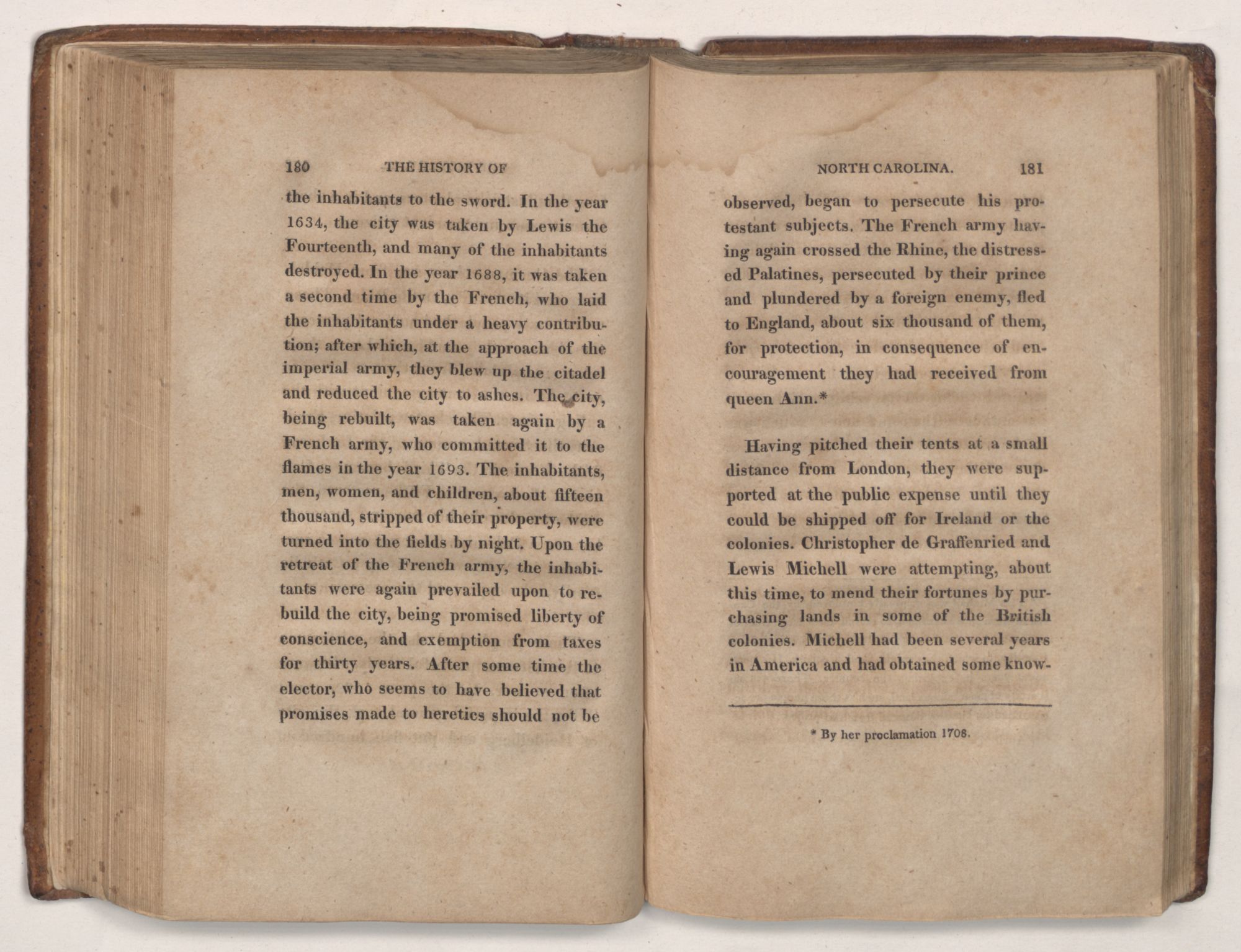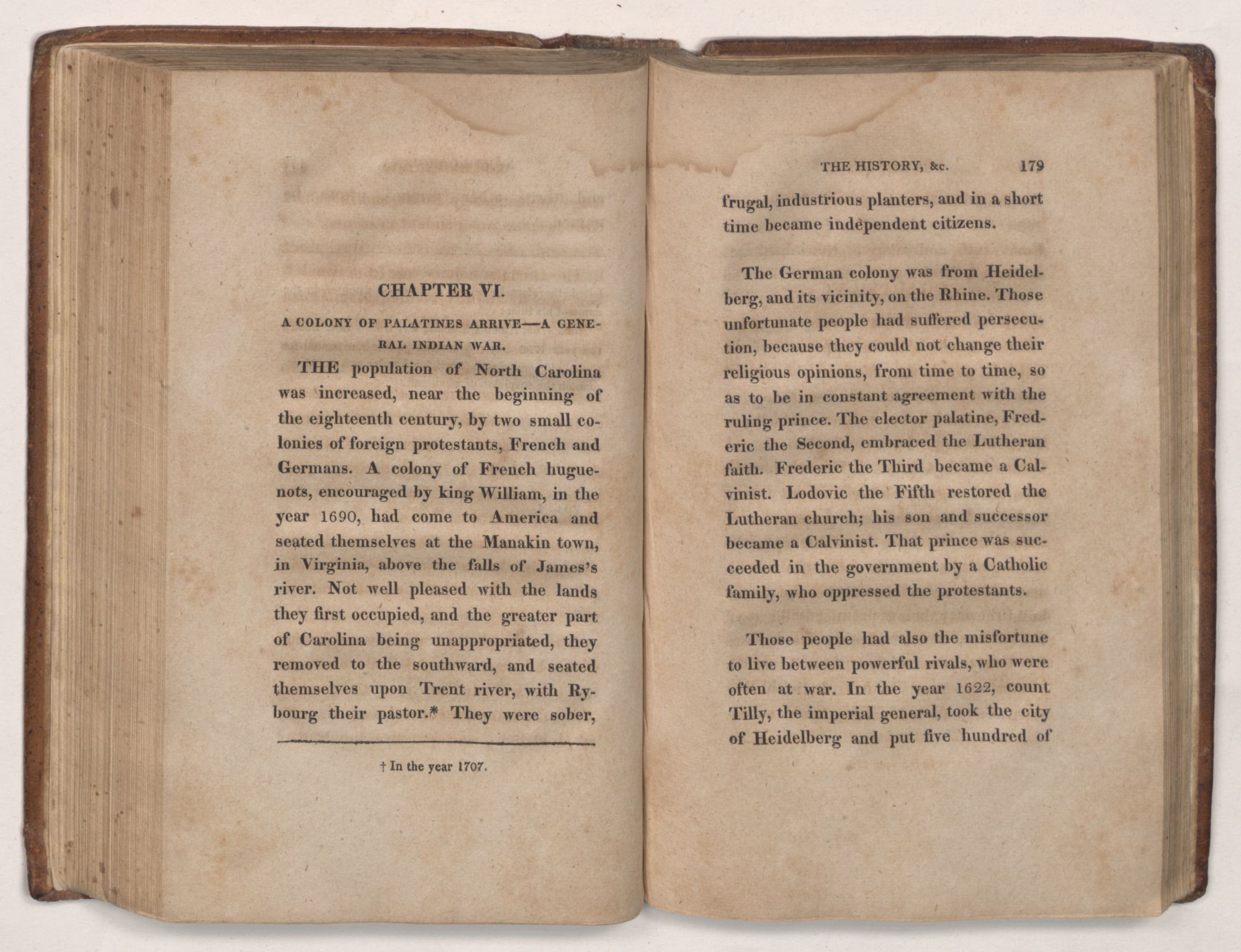 CHAPTER VI.A colony of French huguenots settle on Trent river.—A colony of persecuted and distressed Palatines settle at Newbern.—The Indians have decreased greatly, since the arrival of the first colonists.—As the settlements extend, the Indians become more jealous.—The Indians seize Lawson the surveyor general, and Graffenried.—They put Lawson to death.—The Indians attempt a general massacre, and destroy many of the Inhabitants.—An Indian war becomes general.—Some Indians are killed; and a shameful peace is made by the commanding officer.—Pollock, as president of the council, administers the government.—The Indians renew the war.—Another army marches against them.—Eight hundred Indians are made prisoners; and the Indians sue for peace.—The colony is greatly reduced by Cary's rebellion, and the Indian war, 178